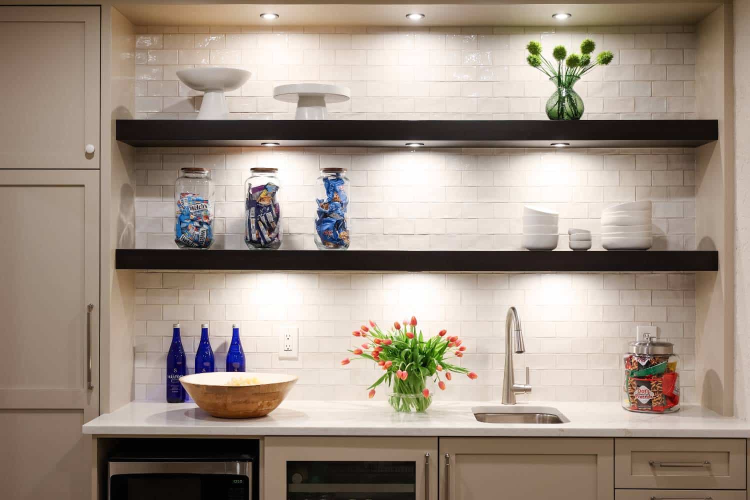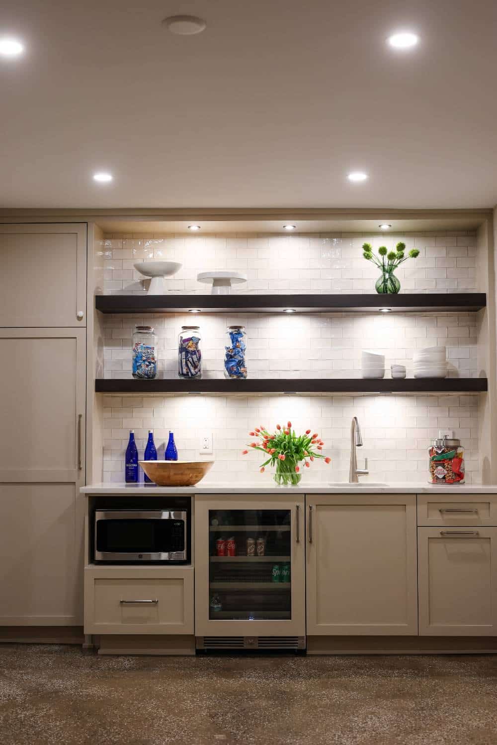 The basement is now a hub of activity. A modern snack bar with sleek cabinetry, floating shelves, subway tile, and a counter-depth full-size undercounter beverage refrigerator anchors one side of the space. The original terrazzo flooring was preserved, and the glass cabinet knobs—original to the home—were blended with new hardware to strike a perfect balance between old and new.