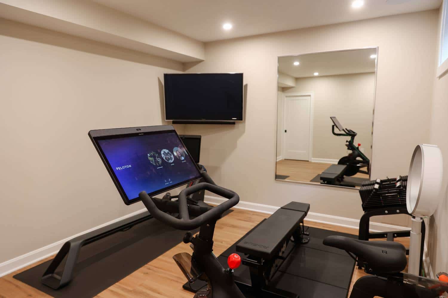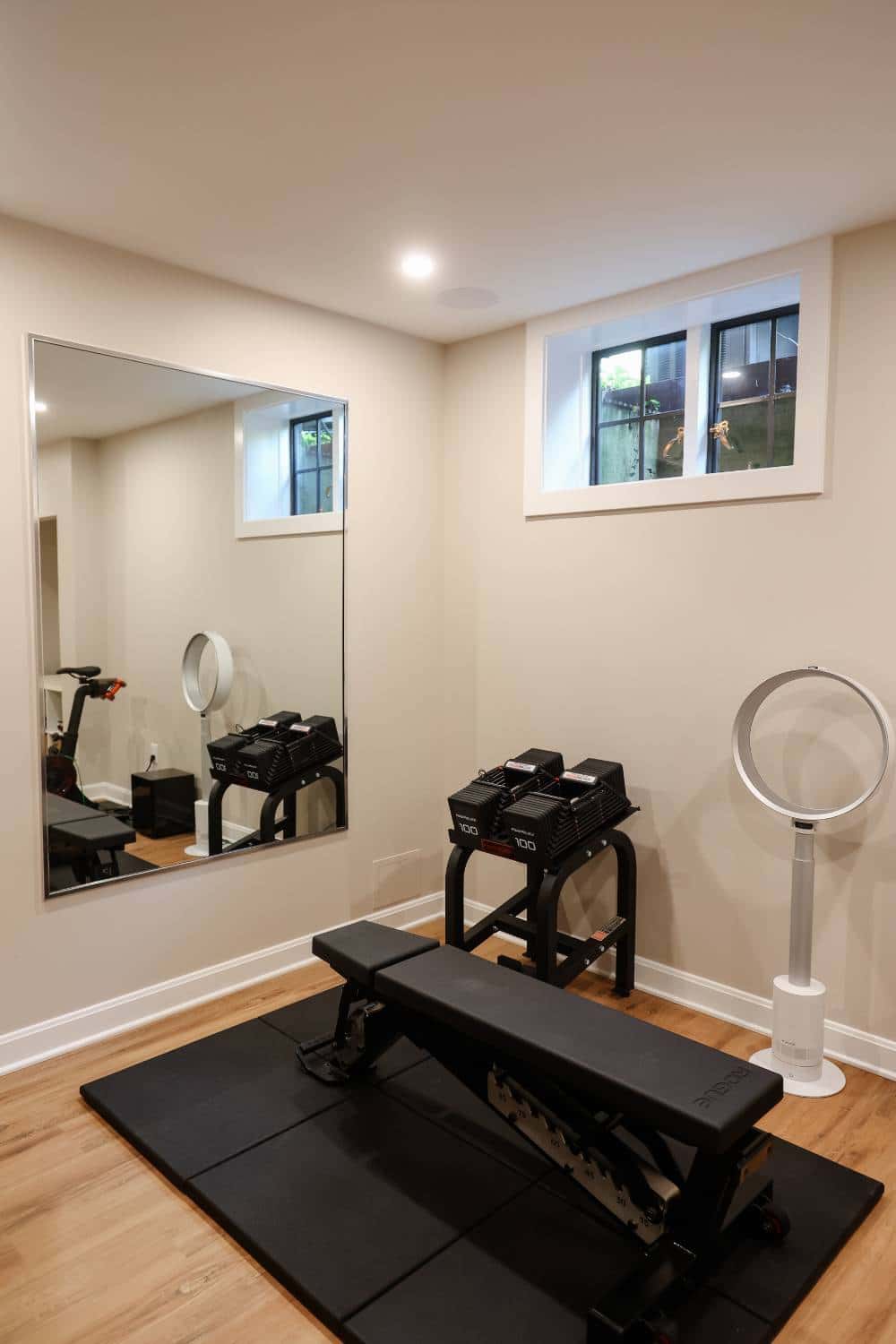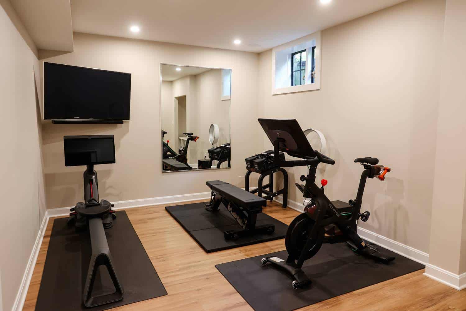Flexibility was key. The former half bath was reimagined into a storage area, and a nook in the newly added exercise room was prepped to serve as a closet should the family ever convert it into a guest bedroom. A full bathroom with durable ceramic tile flooring supports the entire basement and adds function to the lower level.