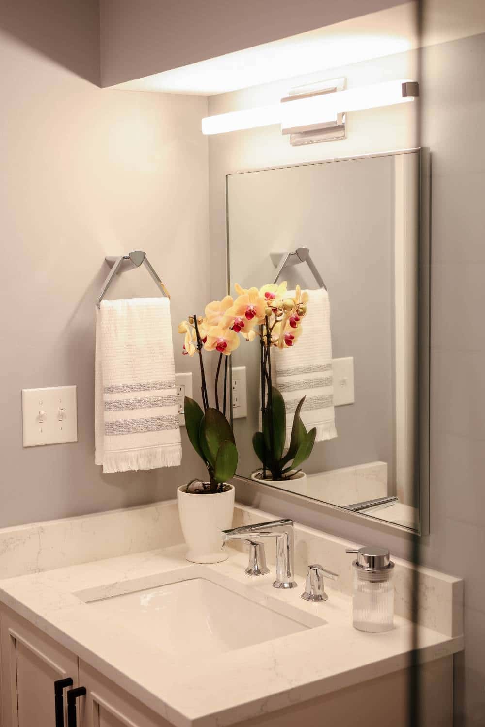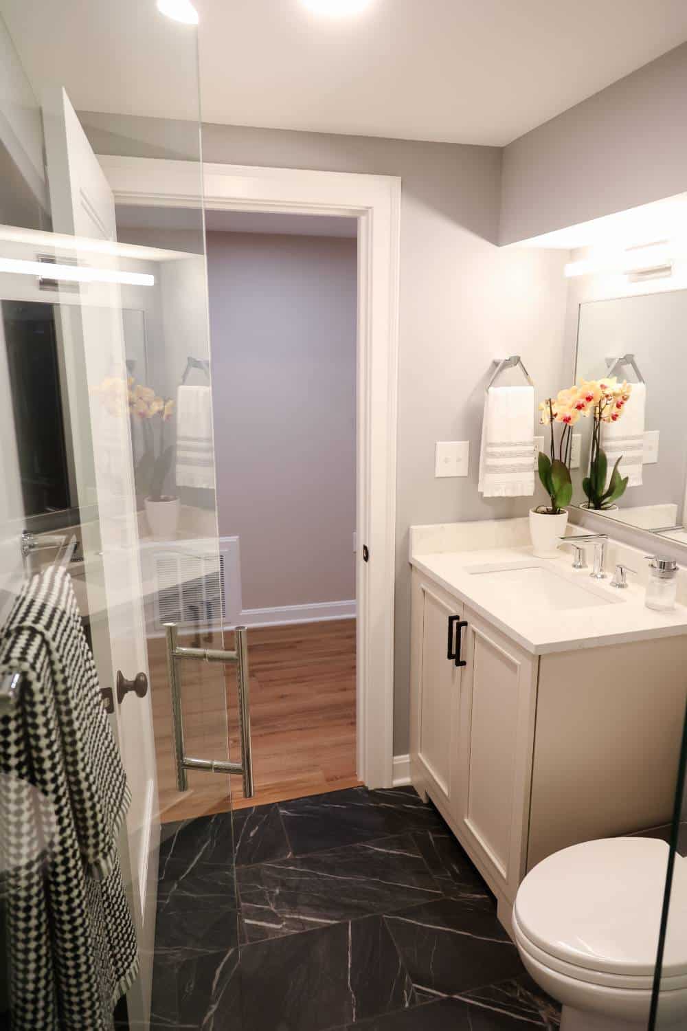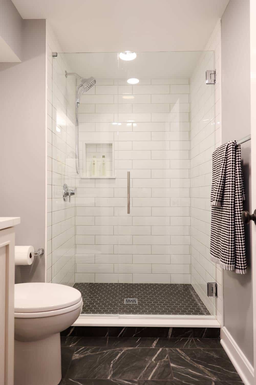 Flexibility was key. The former half bath was reimagined into a storage area, and a nook in the newly added exercise room was prepped to serve as a closet should the family ever convert it into a guest bedroom. A full bathroom with durable ceramic tile flooring supports the entire basement and adds function to the lower level.