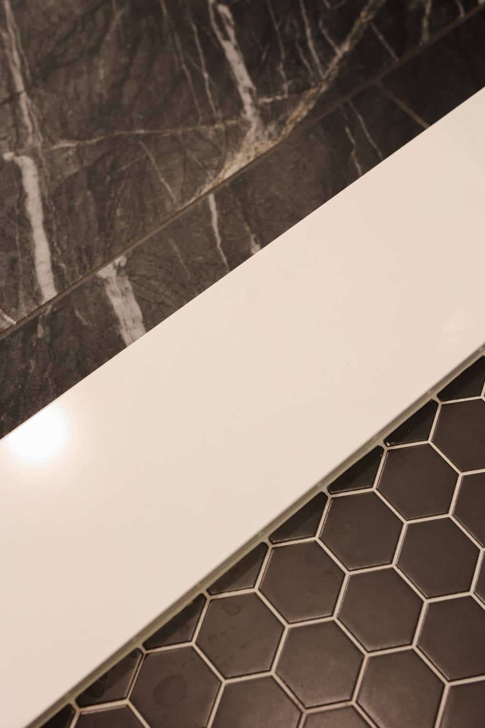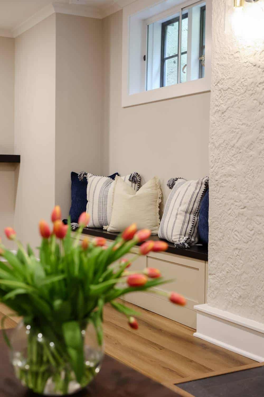 On the opposite wall, a built-in bench offers casual seating near the pool table, while a drink ledge cleverly breaks up the long family room wall, offering function and visual interest. The texture around the original fireplace wall was retained as a nod to the home’s character, with smooth drywall finishing out the remaining space for a clean, modern look.