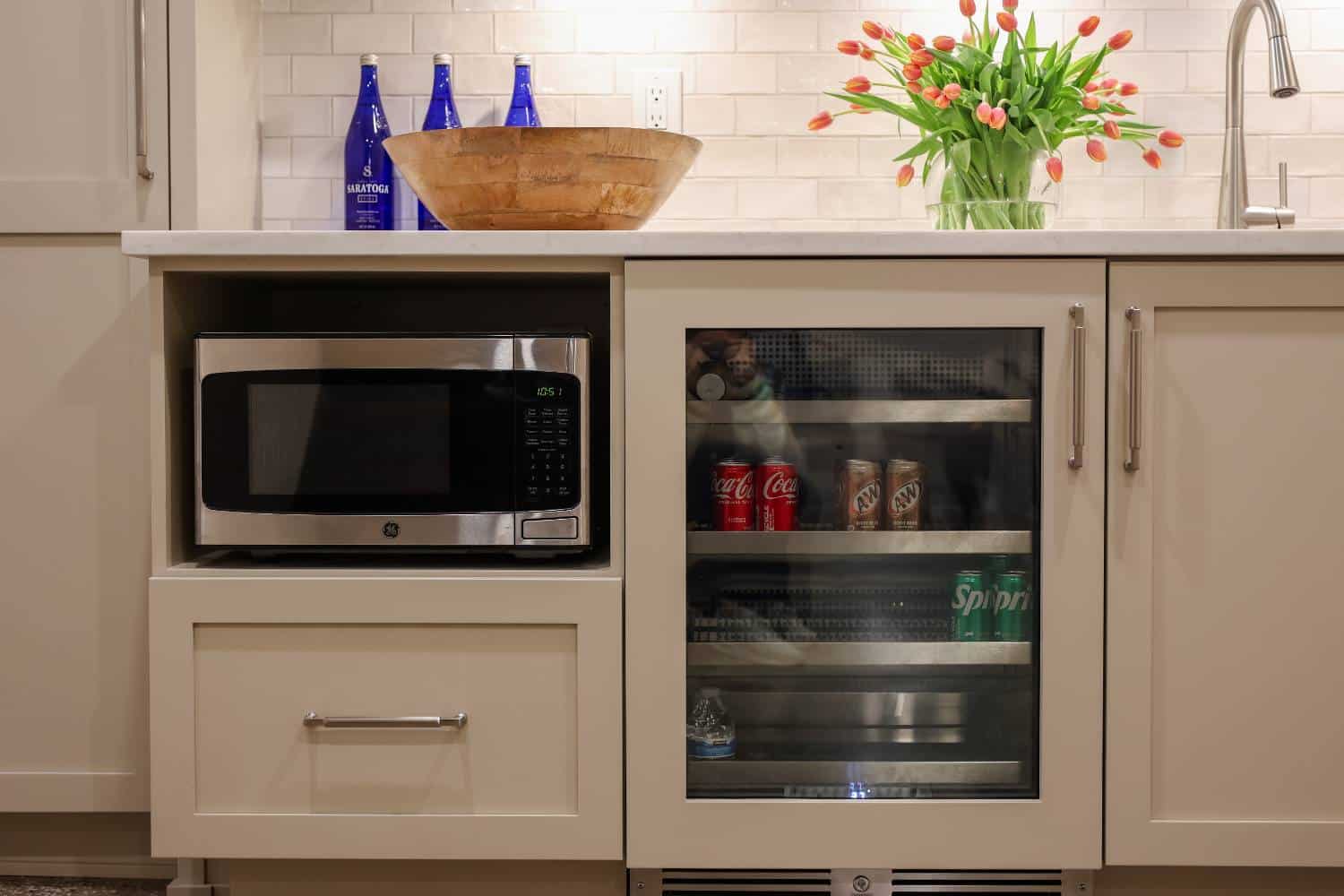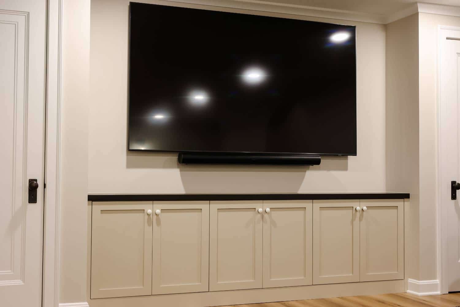 Another major design priority? Hiding exposed mechanical and plumbing components. Our solution was to incorporate a bulkhead system and built-in cabinetry, including closets on either side of the TV, a storage cabinet below, and tall pantry storage and a full-size refrigerator support the main kitchen upstairs.