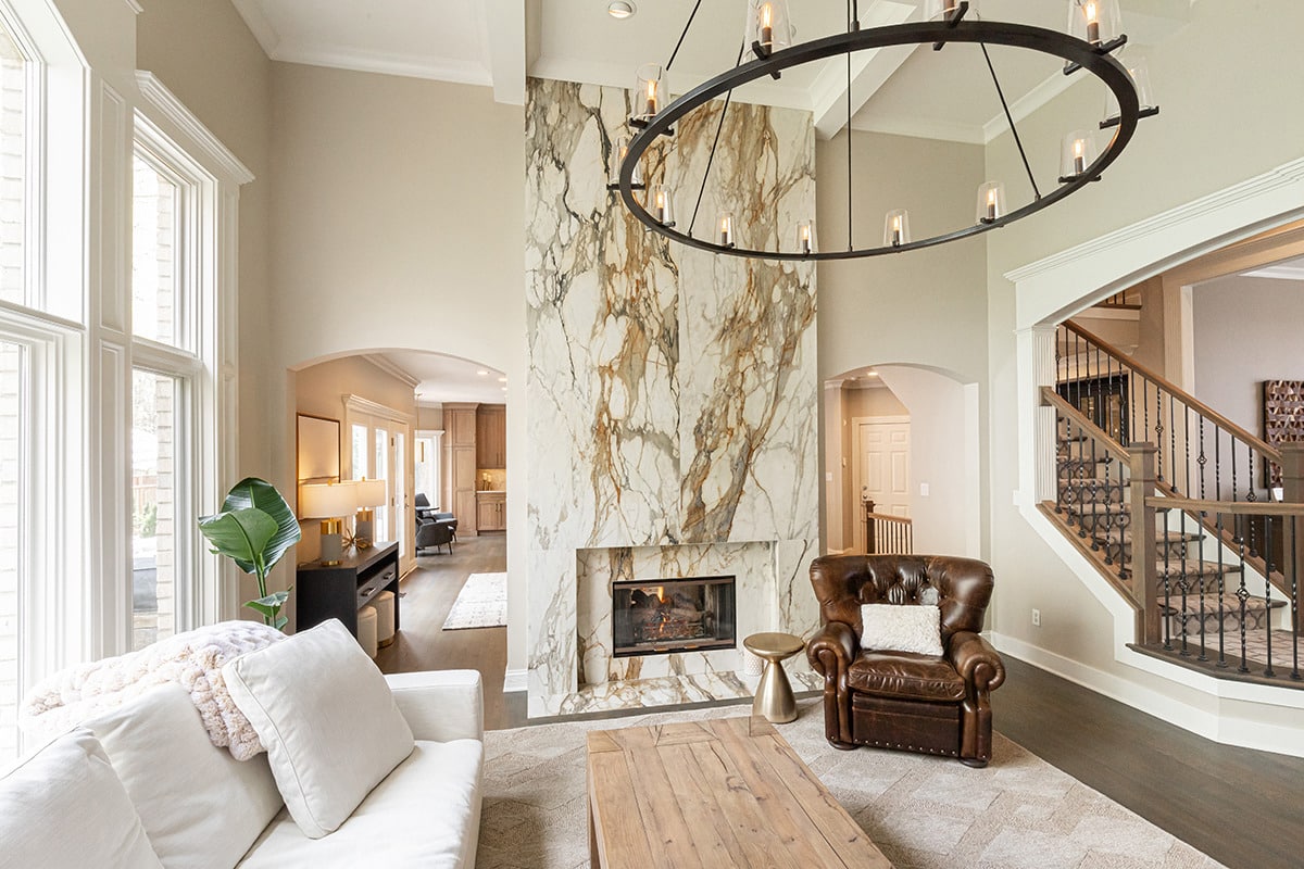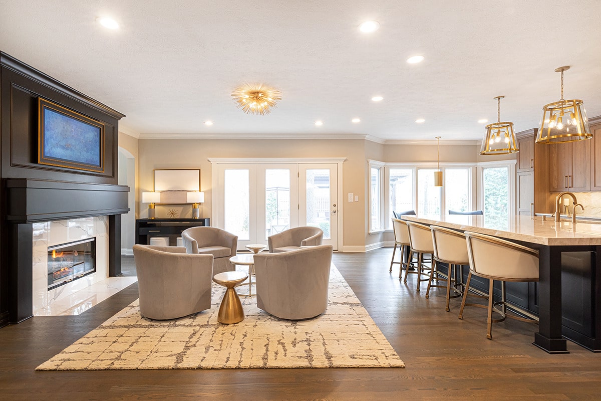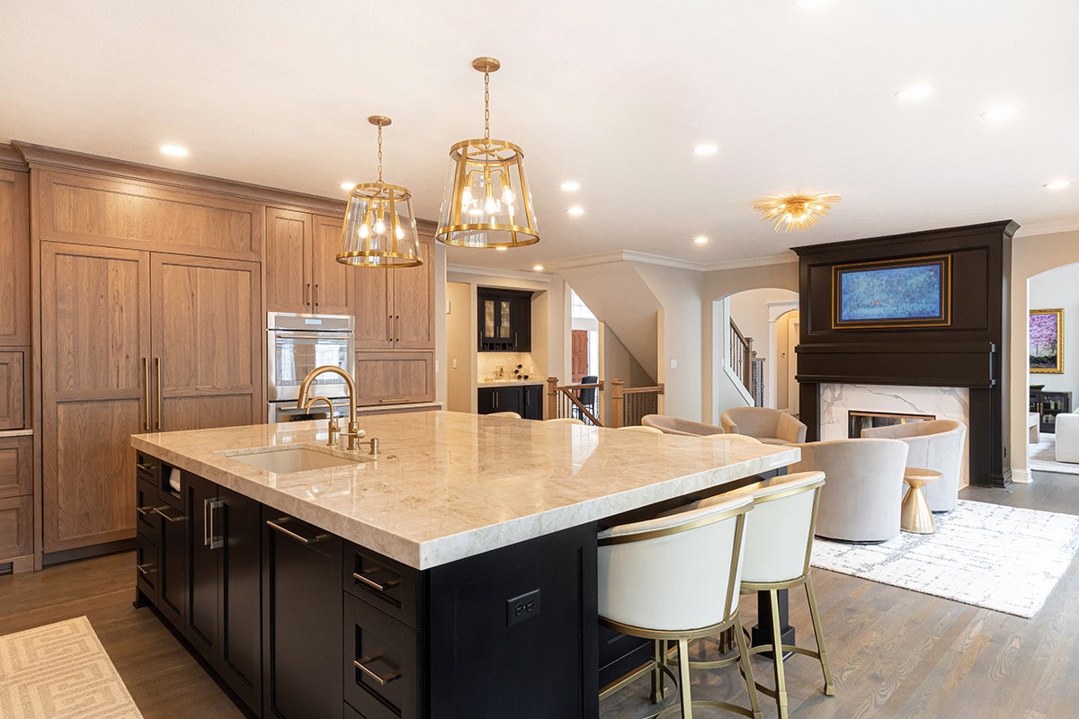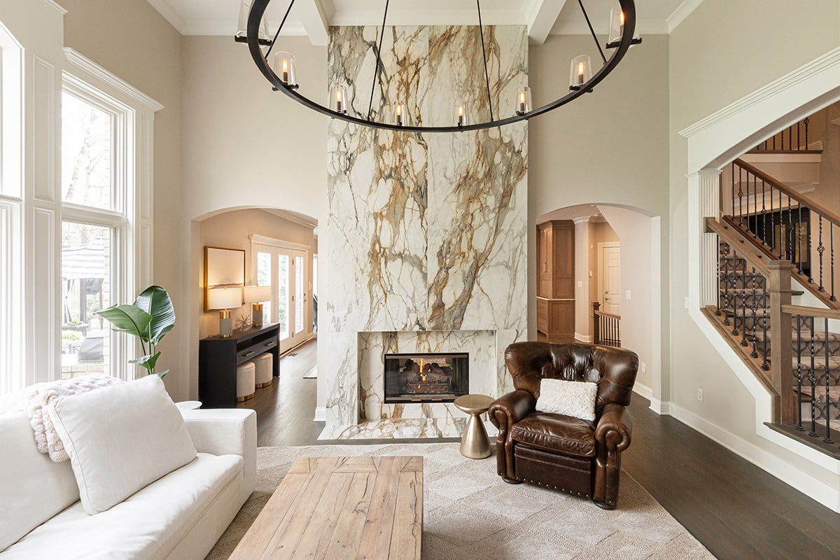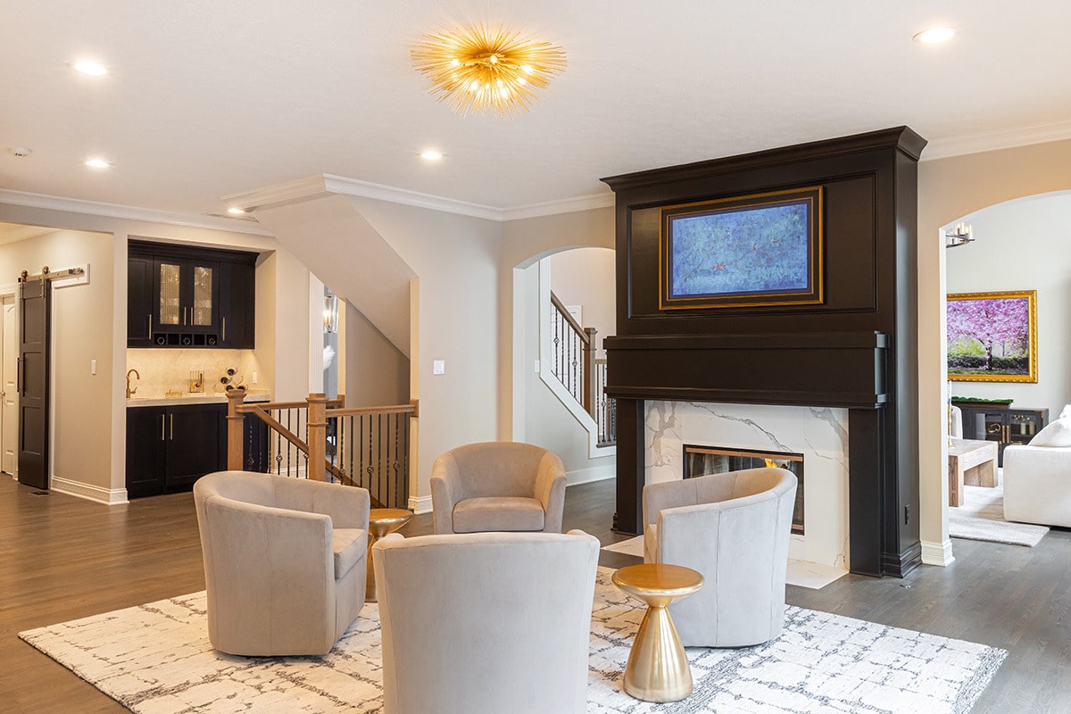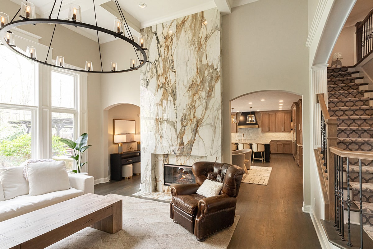 In the 2-storied family room, we knew we wanted the fireplace wall to be our focal point. By building the fireplace wall forward, we created a dimensioned fireplace by recessing the firebox and surround. 5-1/2’ by 10-1/2’ polished Calacatta Topaz porcelain slabs with a polished finish were installed floor to ceiling with matching hearth for a sophisticated impact. With the new fireplace wall, we knew we wanted to elevate the aesthetic of the room, so removing the crown moulding and adding a coffered ceiling with a large bronze chandelier gives the room the impact we wanted. In the entry, we rebuilt the banister and stairs for a modern look, removed the carpet and added a runner. The balustrade was stained to match the kitchen cabinetry and the stair treads match the newly refinished hardwoods. Additionally, we simply added matching chandelier for an interconnected space. The dining room received a fresh paint palette and gold pendants elevate this space as well.