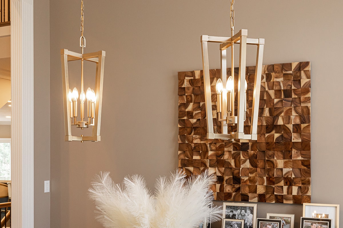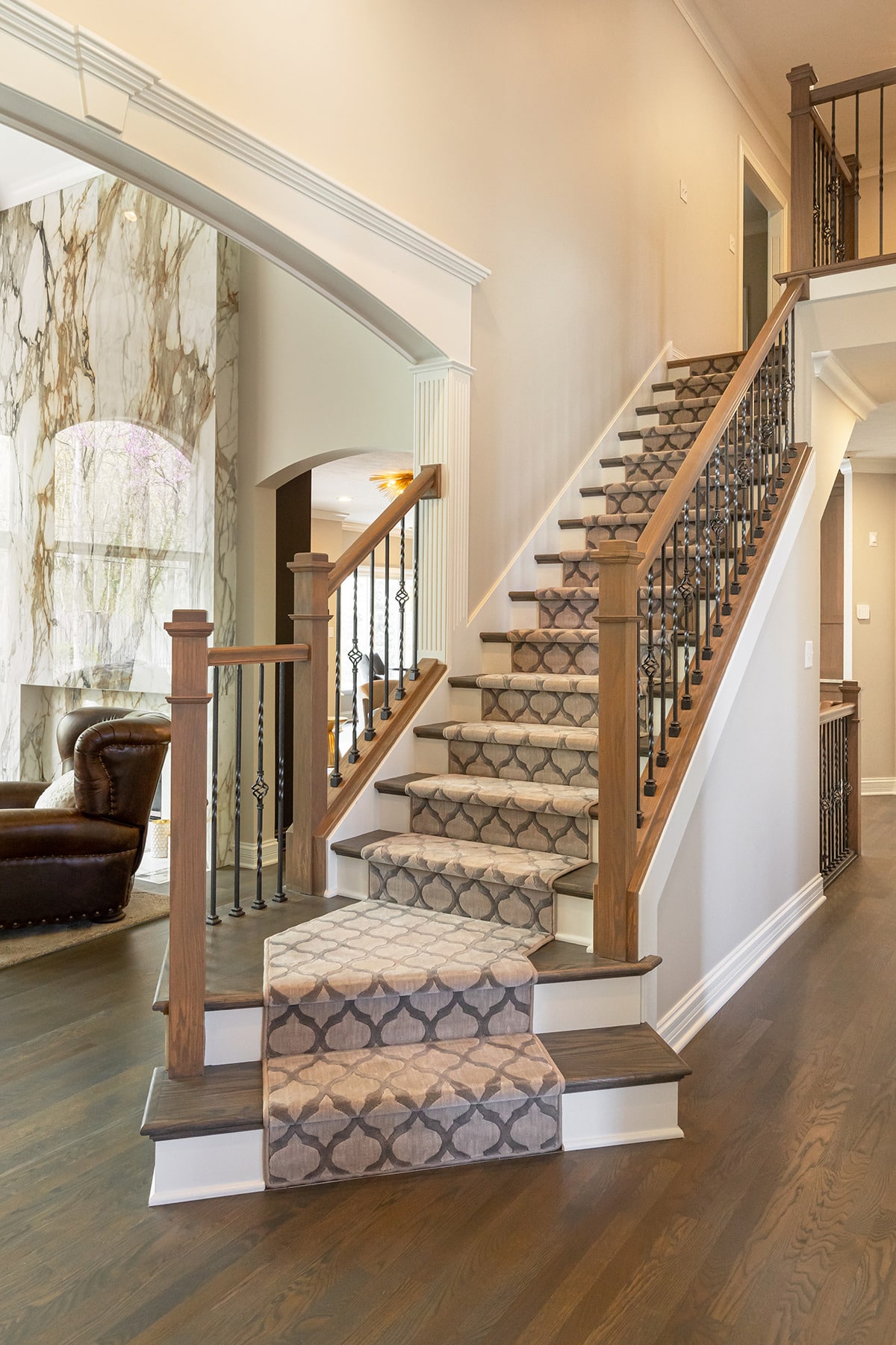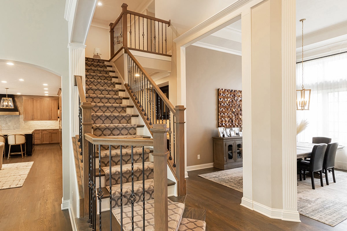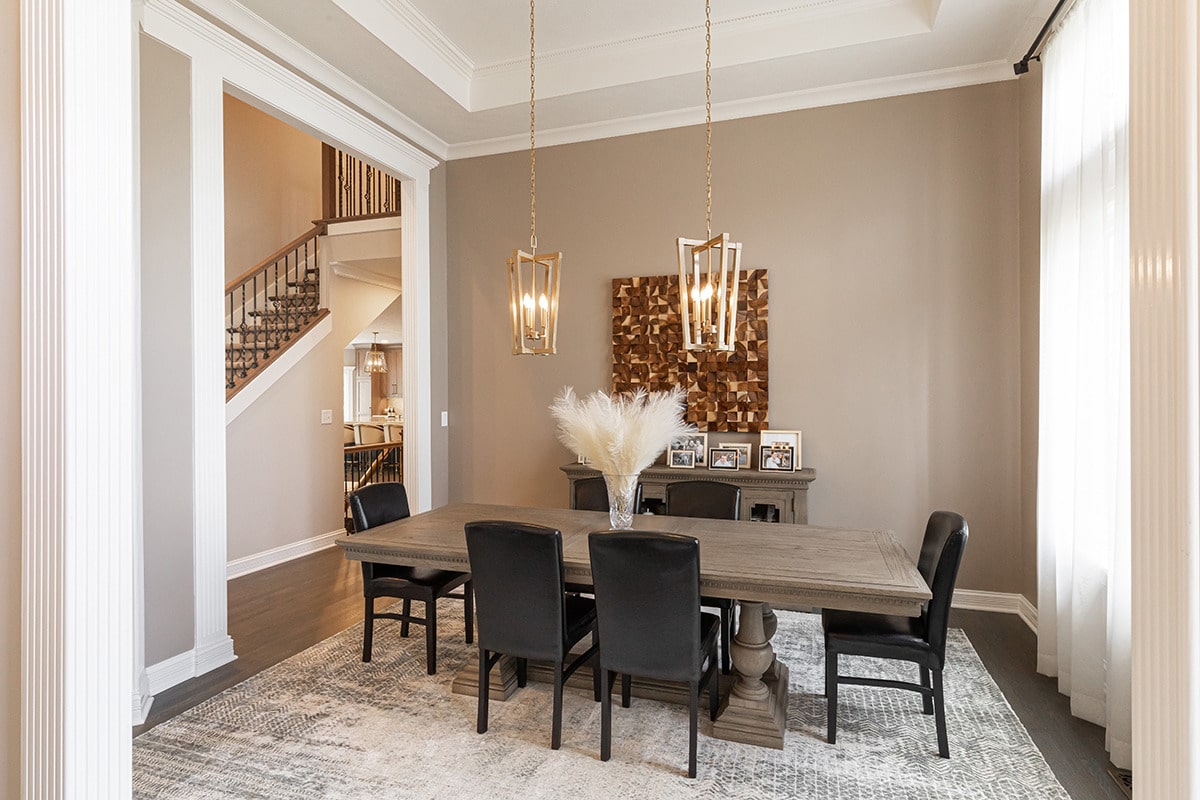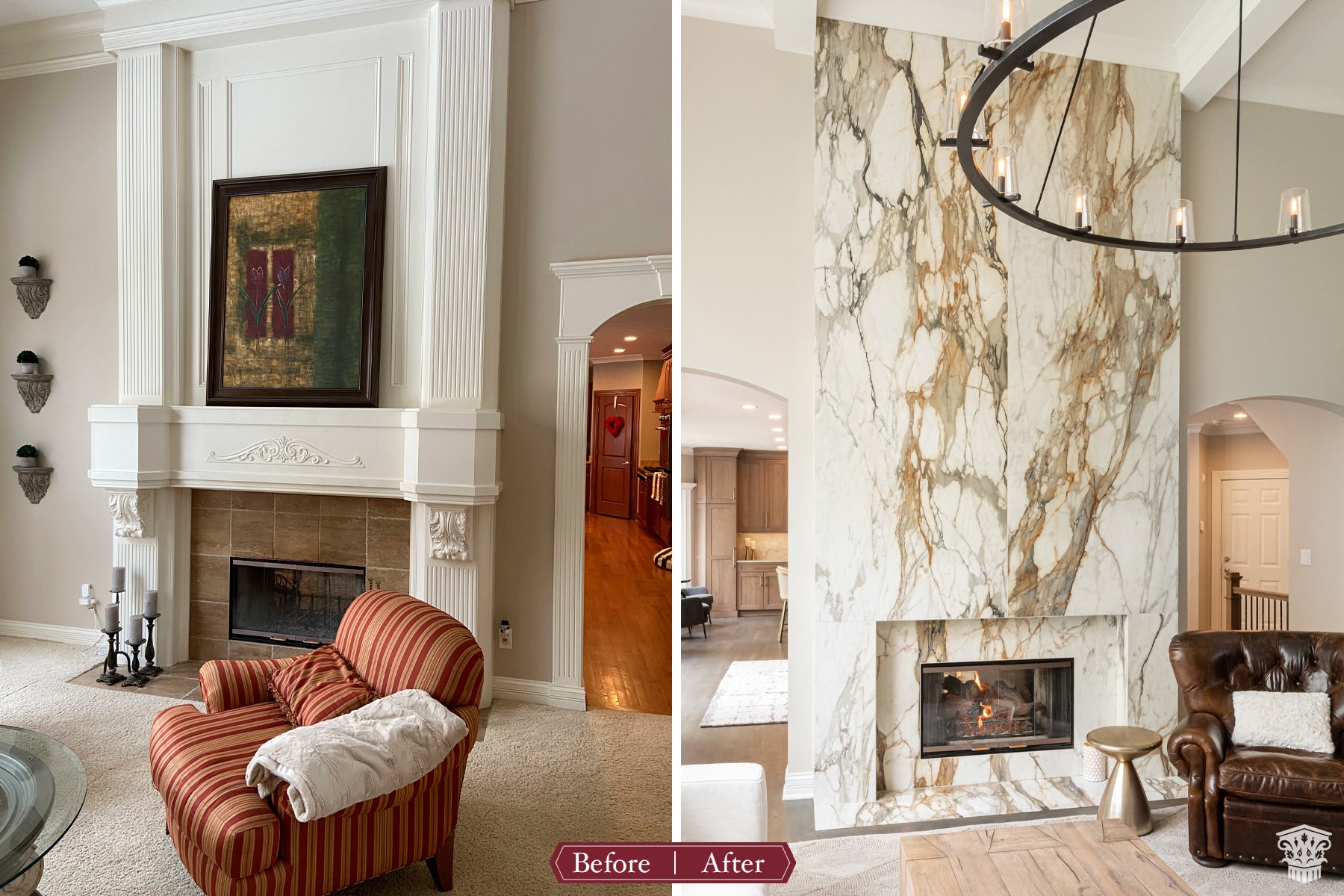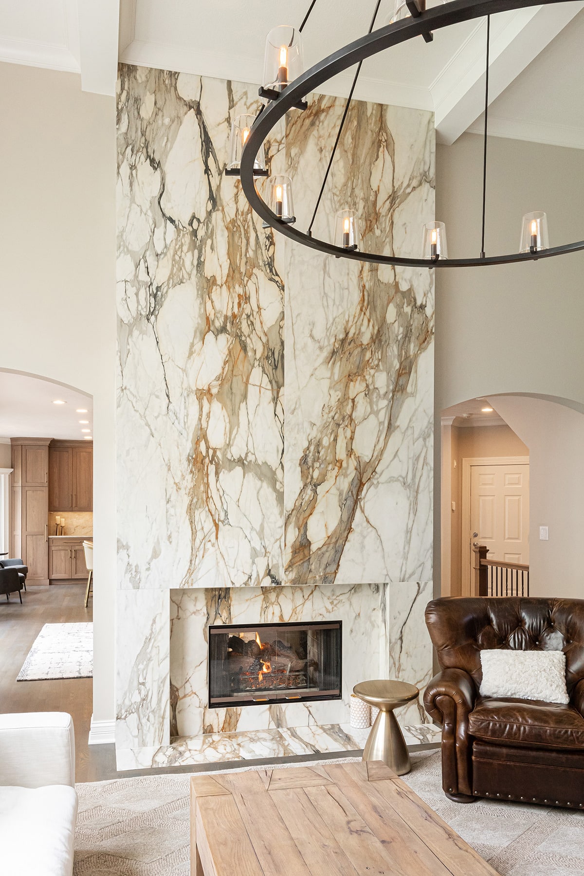 In the 2-storied family room, we knew we wanted the fireplace wall to be our focal point. By building the fireplace wall forward, we created a dimensioned fireplace by recessing the firebox and surround. 5-1/2’ by 10-1/2’ polished Calacatta Topaz porcelain slabs with a polished finish were installed floor to ceiling with matching hearth for a sophisticated impact. With the new fireplace wall, we knew we wanted to elevate the aesthetic of the room, so removing the crown moulding and adding a coffered ceiling with a large bronze chandelier gives the room the impact we wanted. In the entry, we rebuilt the banister and stairs for a modern look, removed the carpet and added a runner. The balustrade was stained to match the kitchen cabinetry and the stair treads match the newly refinished hardwoods. Additionally, we simply added matching chandelier for an interconnected space. The dining room received a fresh paint palette and gold pendants elevate this space as well.