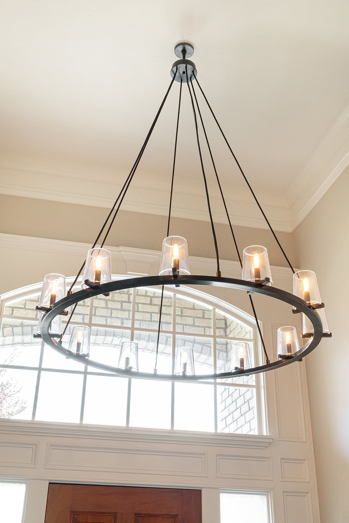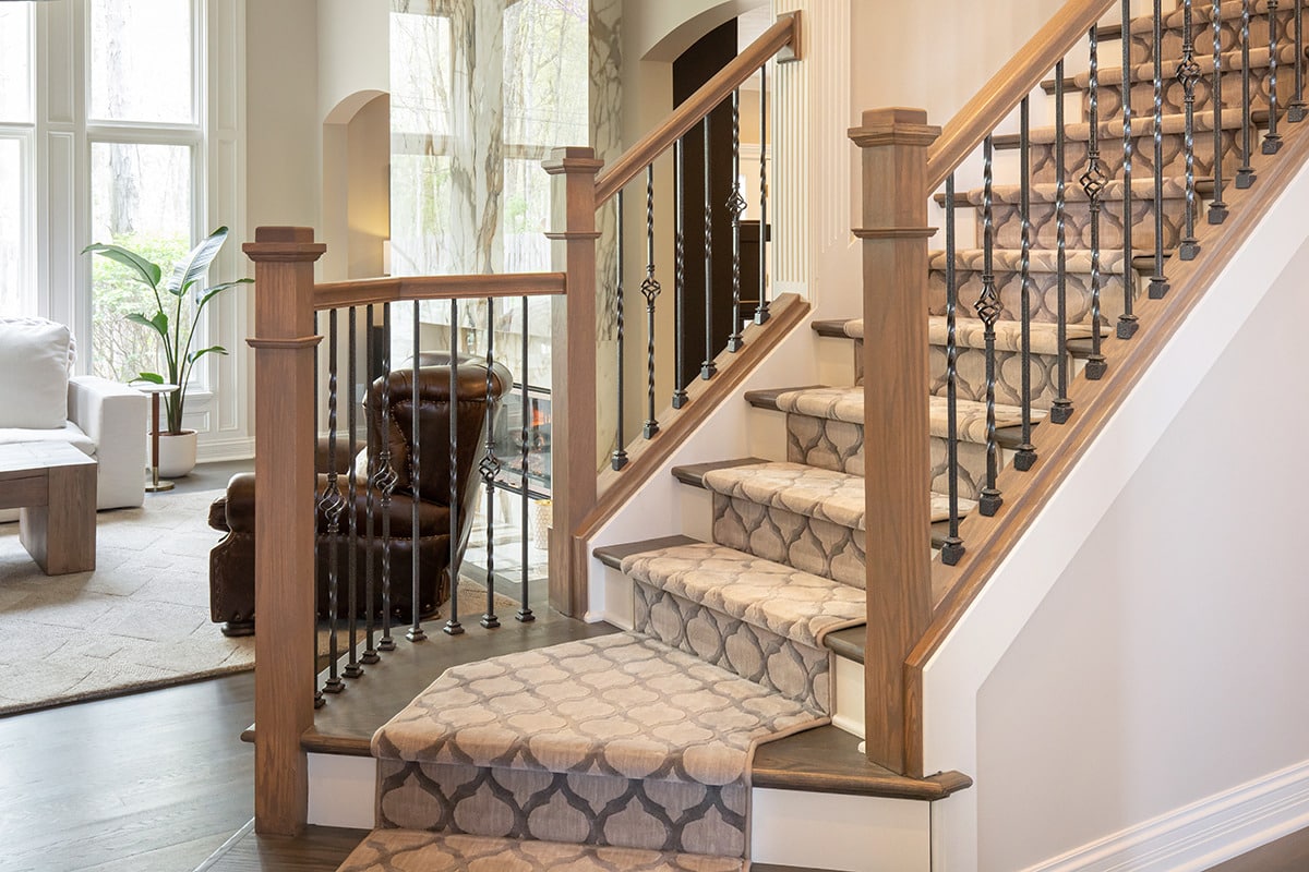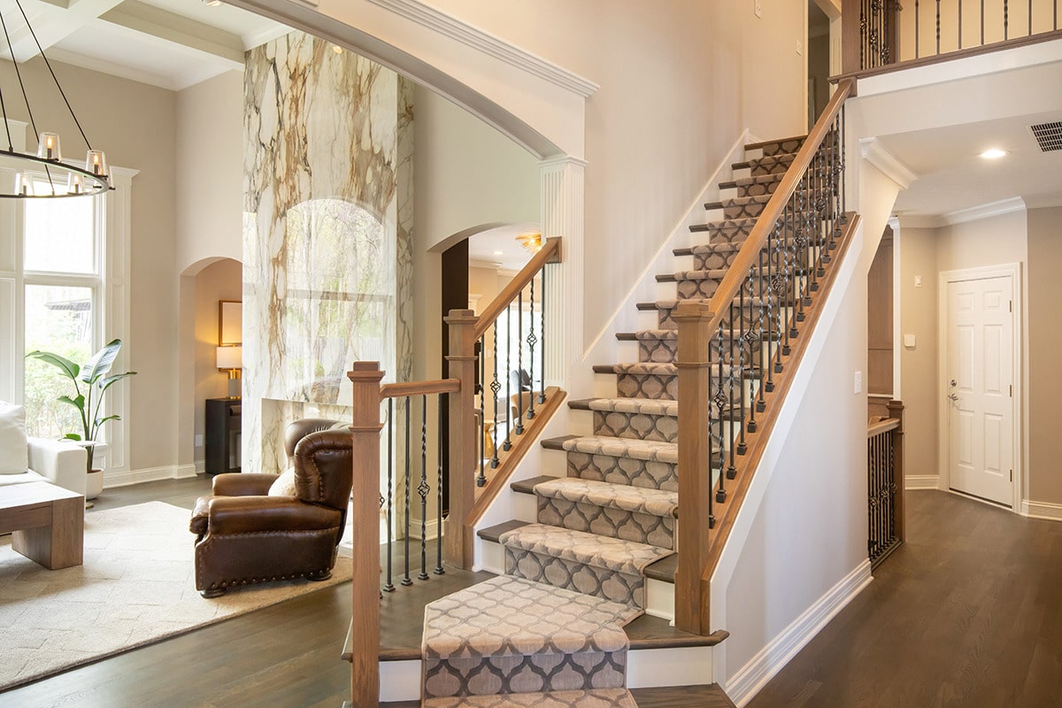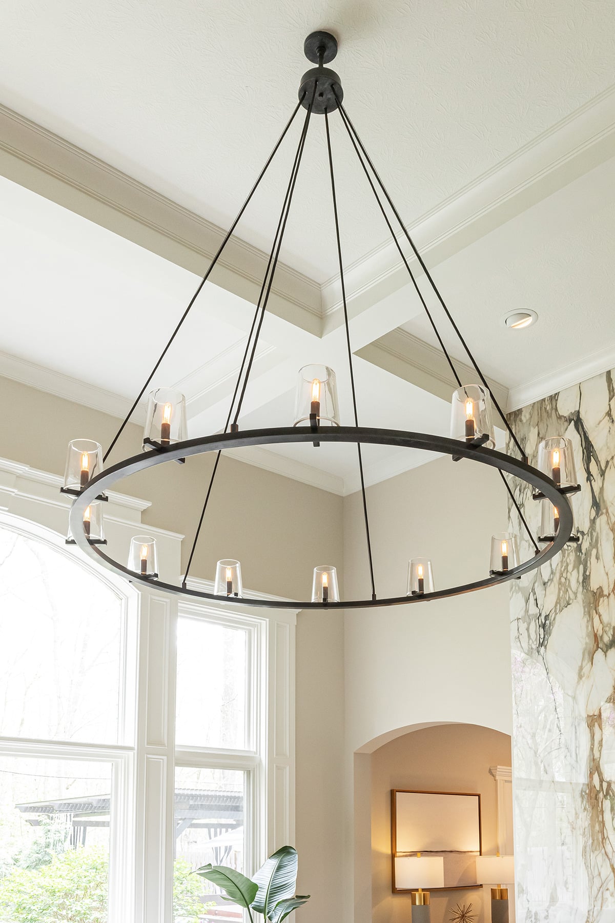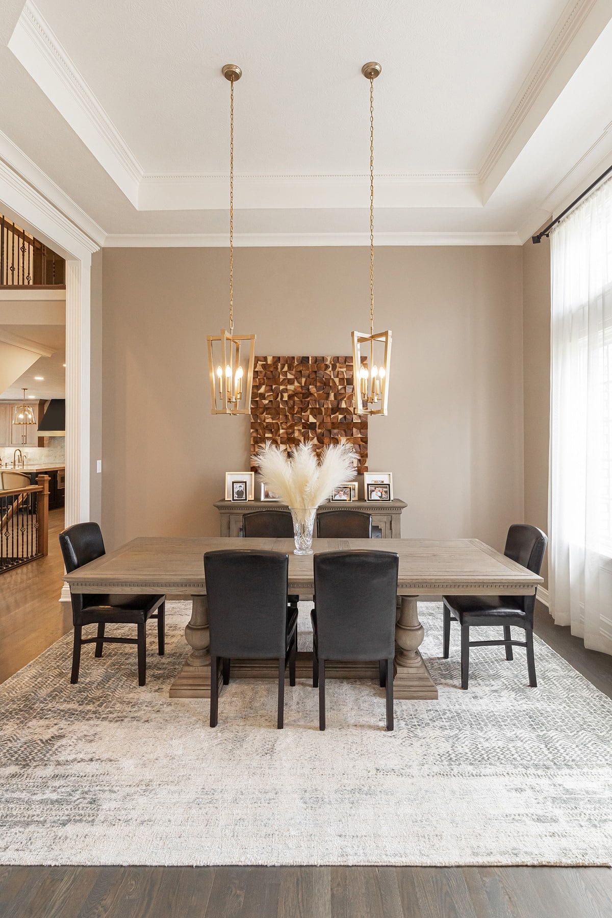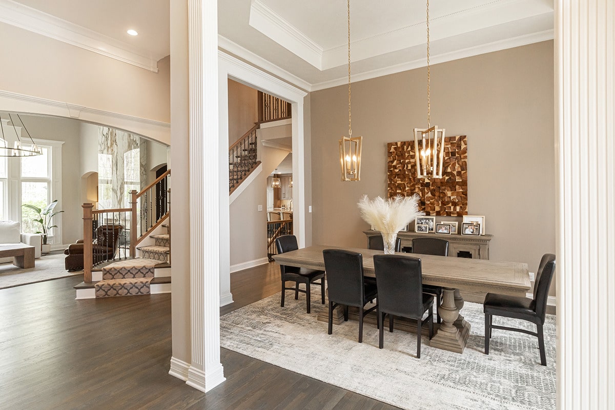 In the 2-storied family room, we knew we wanted the fireplace wall to be our focal point. By building the fireplace wall forward, we created a dimensioned fireplace by recessing the firebox and surround. 5-1/2’ by 10-1/2’ polished Calacatta Topaz porcelain slabs with a polished finish were installed floor to ceiling with matching hearth for a sophisticated impact. With the new fireplace wall, we knew we wanted to elevate the aesthetic of the room, so removing the crown moulding and adding a coffered ceiling with a large bronze chandelier gives the room the impact we wanted. In the entry, we rebuilt the banister and stairs for a modern look, removed the carpet and added a runner. The balustrade was stained to match the kitchen cabinetry and the stair treads match the newly refinished hardwoods. Additionally, we simply added matching chandelier for an interconnected space. The dining room received a fresh paint palette and gold pendants elevate this space as well.
