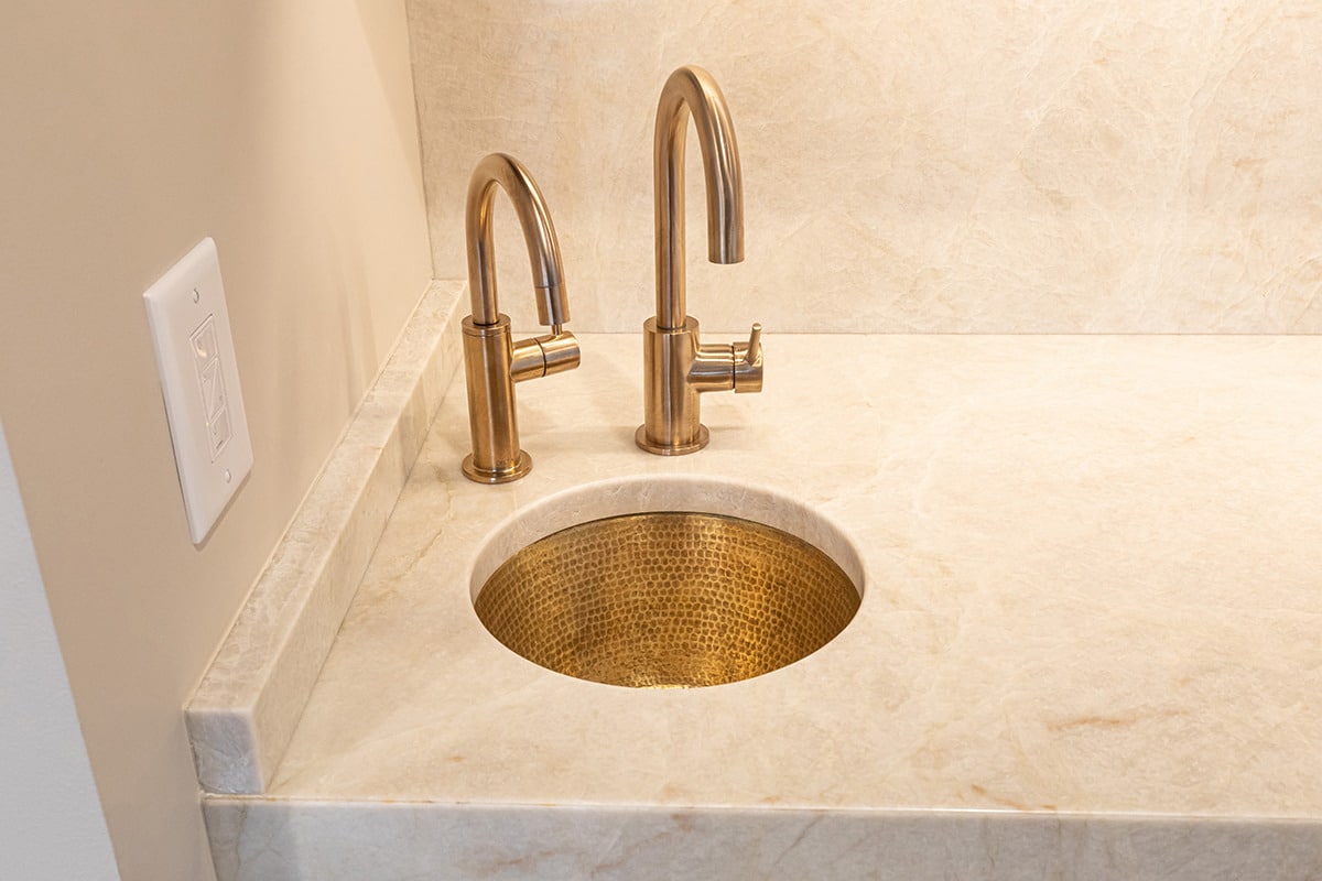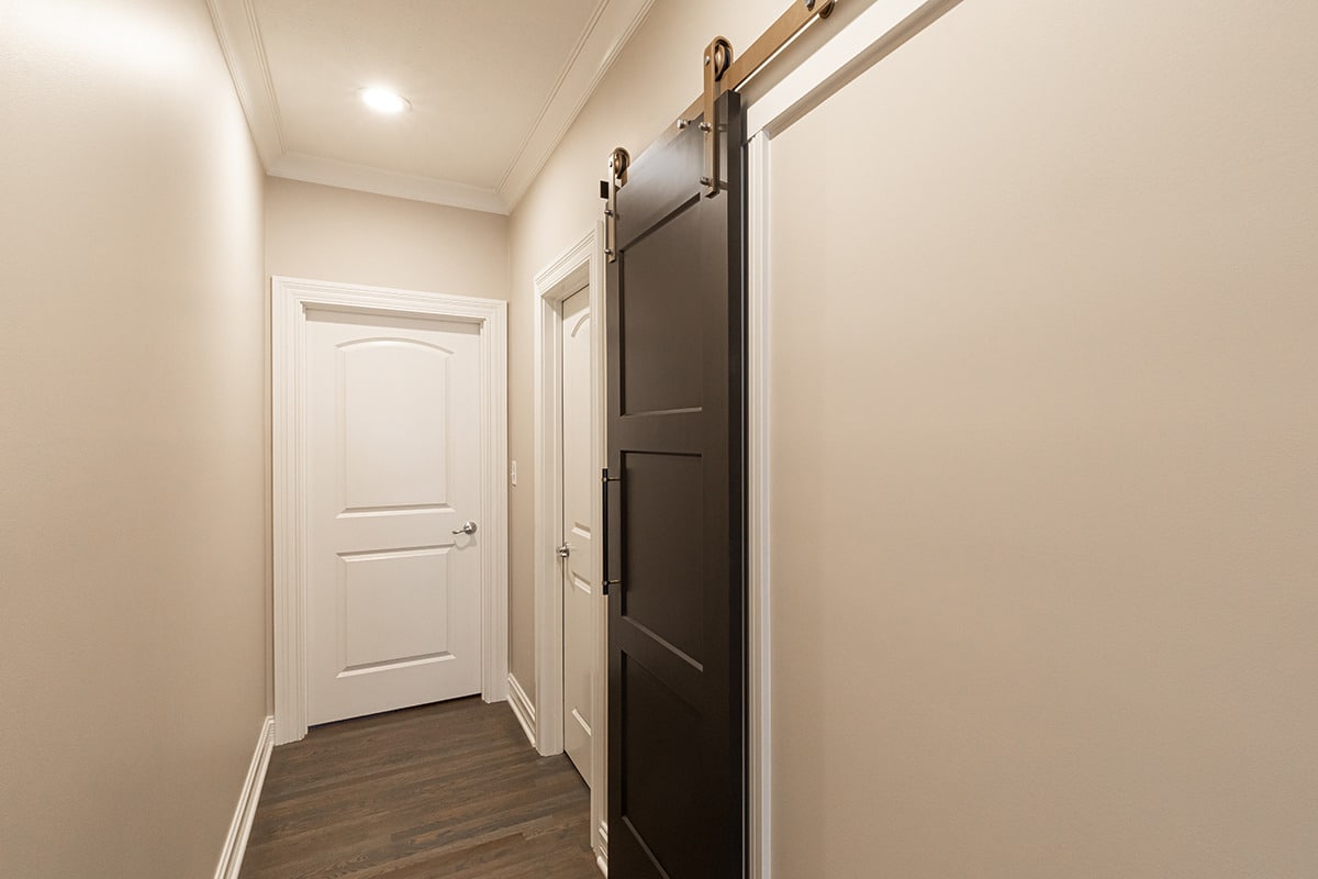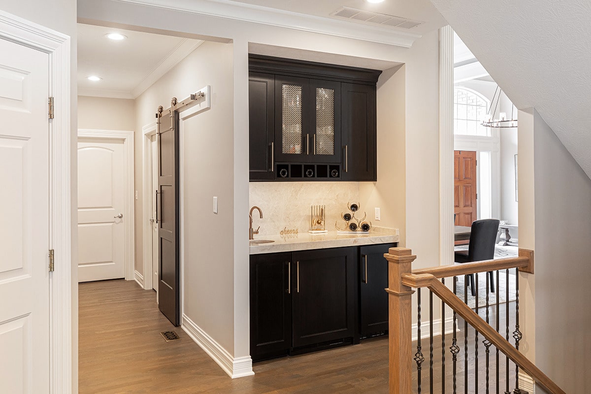 Between the dining room and kitchen, we widened the opening and raised the ceiling to incorporate a wet bar into this entertainers-dream of the first floor. A brass hand hammered sink, beverage faucet with filtered chilled water, and a bar faucet add all you’d want for guests. Paneled ice maker and beverage refrigerator and custom cabinetry make this space a frequent gathering place. Further down the hall an unused “mom’s desk” was repurposed, and a barn-door gives access to a large walk-in pantry, which was a must have for these homeowners. At the end of the hall, we gave a small powder bath an update including Lisel Jane Ashlock blue floral wallpaper as a focal wall. A floating vanity with new champagne bronze plumbing fixtures adds chic warmness and modern lighting brings the elegance this room deserved. Under cabinet lighting creates a special ambience whether overhead lights are on or off.