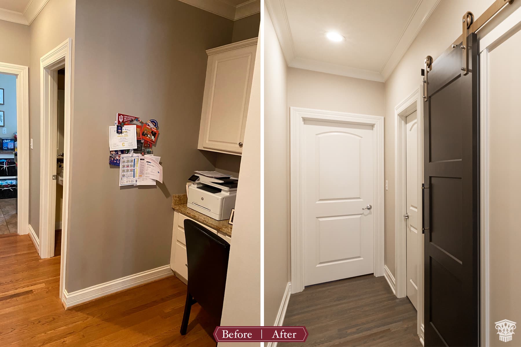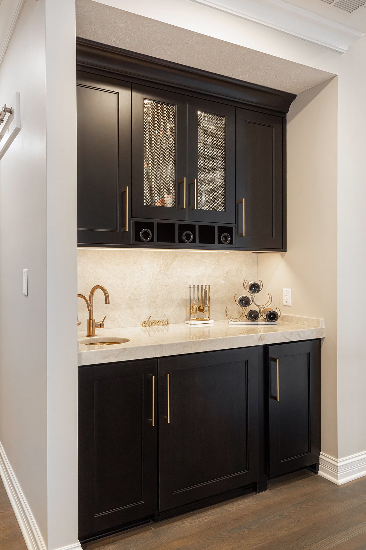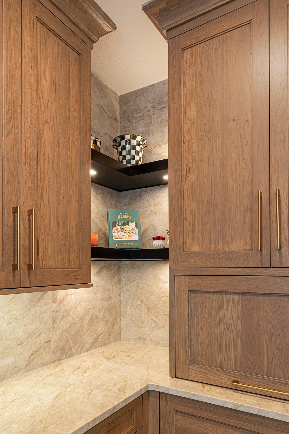 Between the dining room and kitchen, we widened the opening and raised the ceiling to incorporate a wet bar into this entertainers-dream of the first floor. A brass hand hammered sink, beverage faucet with filtered chilled water, and a bar faucet add all you’d want for guests. Paneled ice maker and beverage refrigerator and custom cabinetry make this space a frequent gathering place. Further down the hall an unused “mom’s desk” was repurposed, and a barn-door gives access to a large walk-in pantry, which was a must have for these homeowners. At the end of the hall, we gave a small powder bath an update including Lisel Jane Ashlock blue floral wallpaper as a focal wall. A floating vanity with new champagne bronze plumbing fixtures adds chic warmness and modern lighting brings the elegance this room deserved. Under cabinet lighting creates a special ambience whether overhead lights are on or off.