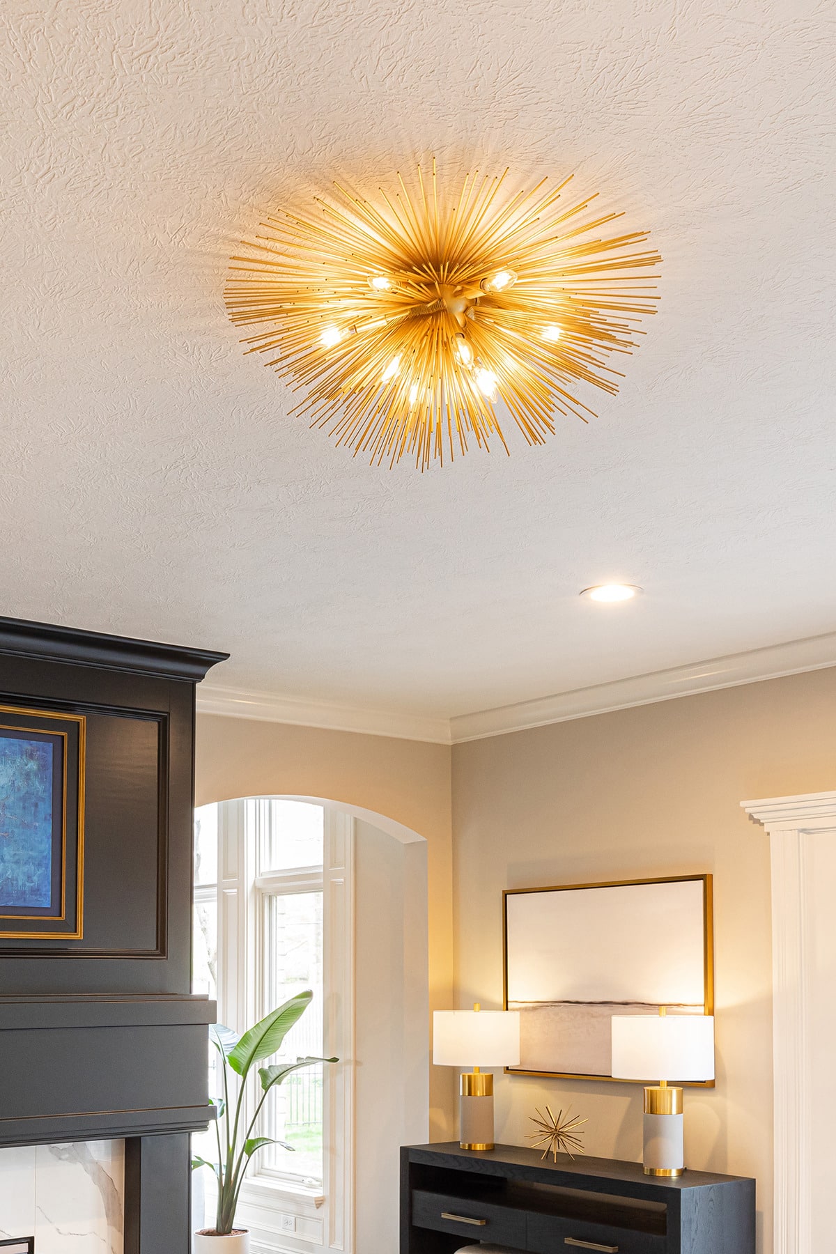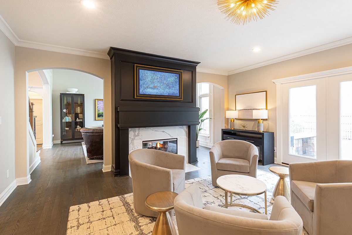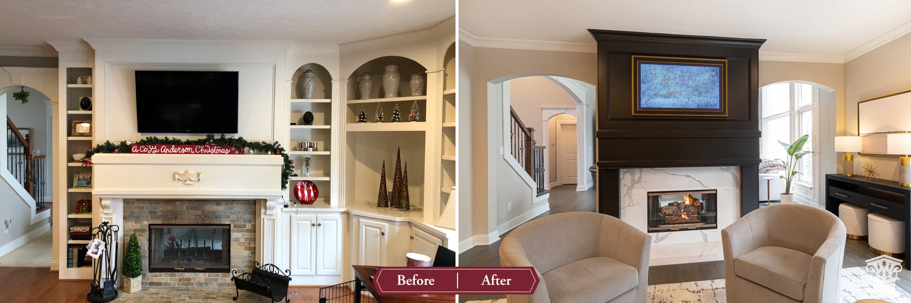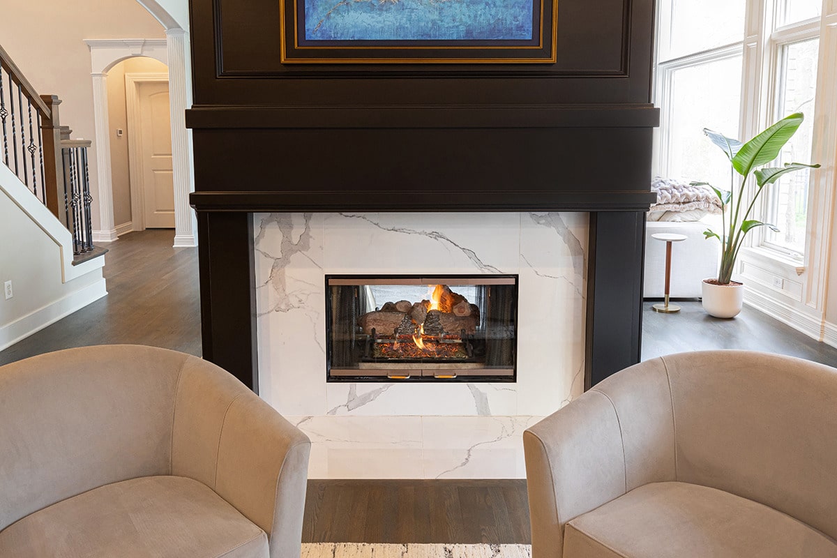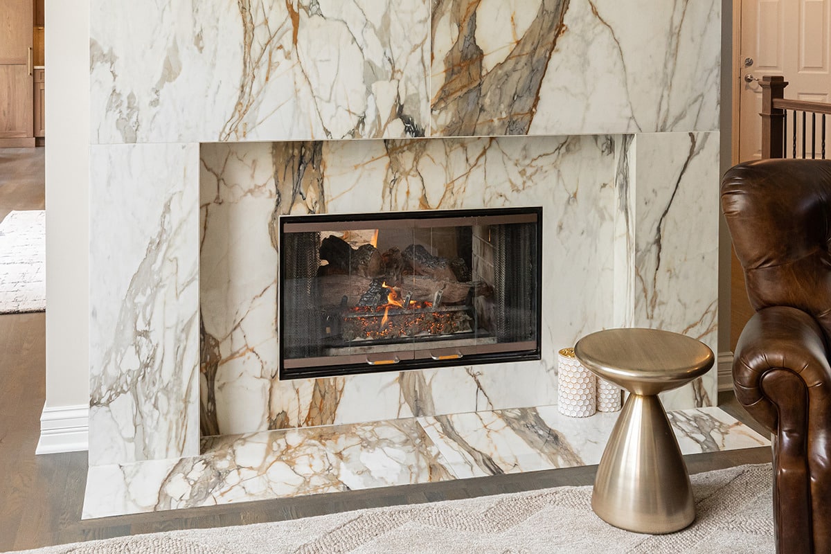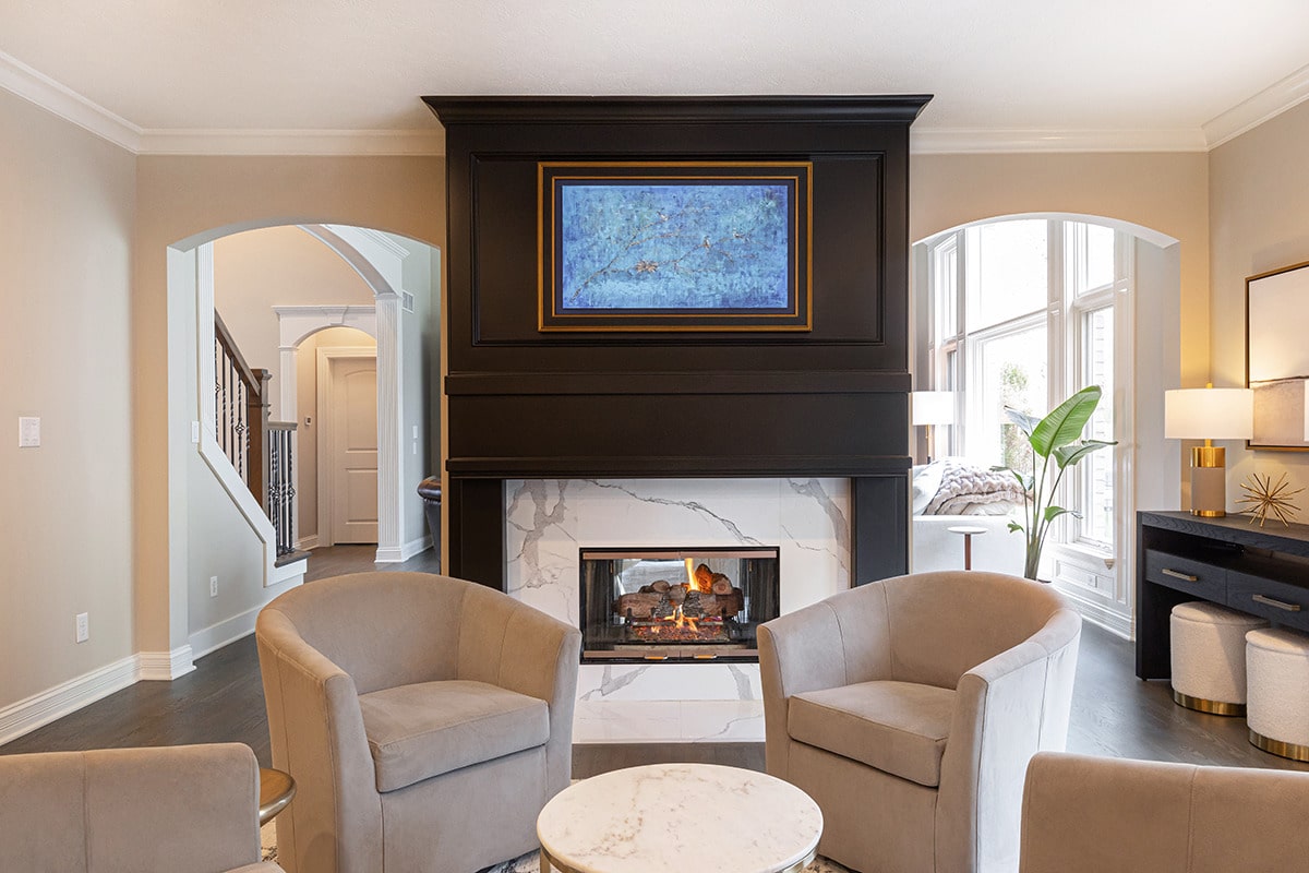 We removed built-in cabinetry around the hearth room fireplace and created a new entry into the family room. Both doorways were widened and now sport clean modern arches for consistency with the arches throughout the home. The circular traffic flow allows an openness for entertaining in the kitchen, hearth room and family room. We eliminated built-ins on either side of the hearth room fireplace, simplified the design, and painted the original fireplace black. We installed polished marbled white tile on the face and hearth, which gives it a modern aesthetic that coordinates well with the kitchen cabinetry.