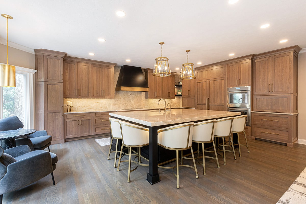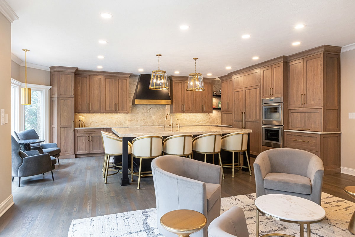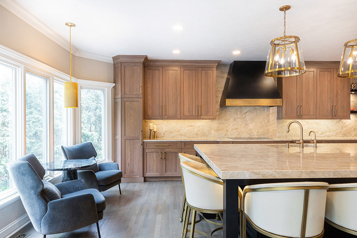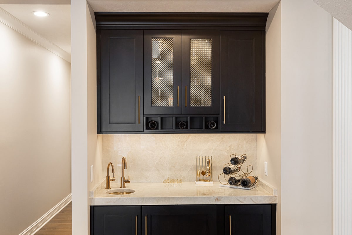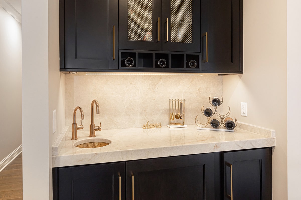 Their kitchen had an awkward angled island that limited its functional use and usable space in the room. The angled pantry they had was not user friendly, and the layout of the space was not ideal. We completely redesigned the kitchen layout, allowing for a large kitchen island, cabinetry taken to the eat-in nook, and relocated all the appliances. Taj Mahal Quartzite counters and full height splash create impact on the island, and the sink sports a kitchen faucet as well an insta-hot beverage faucet. A custom hood, finished to match the island, is now the focal point of the room and is symmetrical with the new sink, lighting, and the hearth room fireplace. Seating for two creates a cozy area for morning coffee and the kitchen area seating has doubled for this couple who enjoy entertaining. A large walk-in pantry with modern barn door access was designed with specificity to the homeowners needs. It also houses the chiller for the bar chilled water faucet.