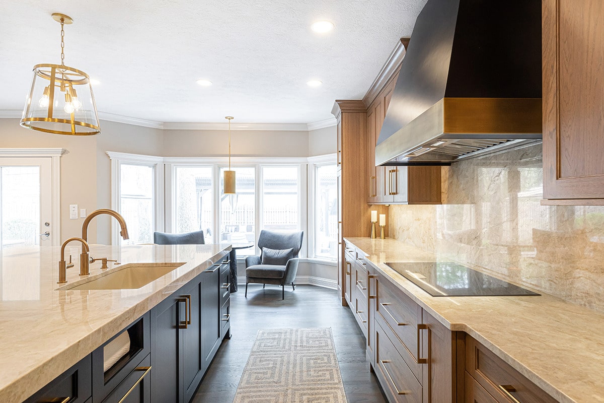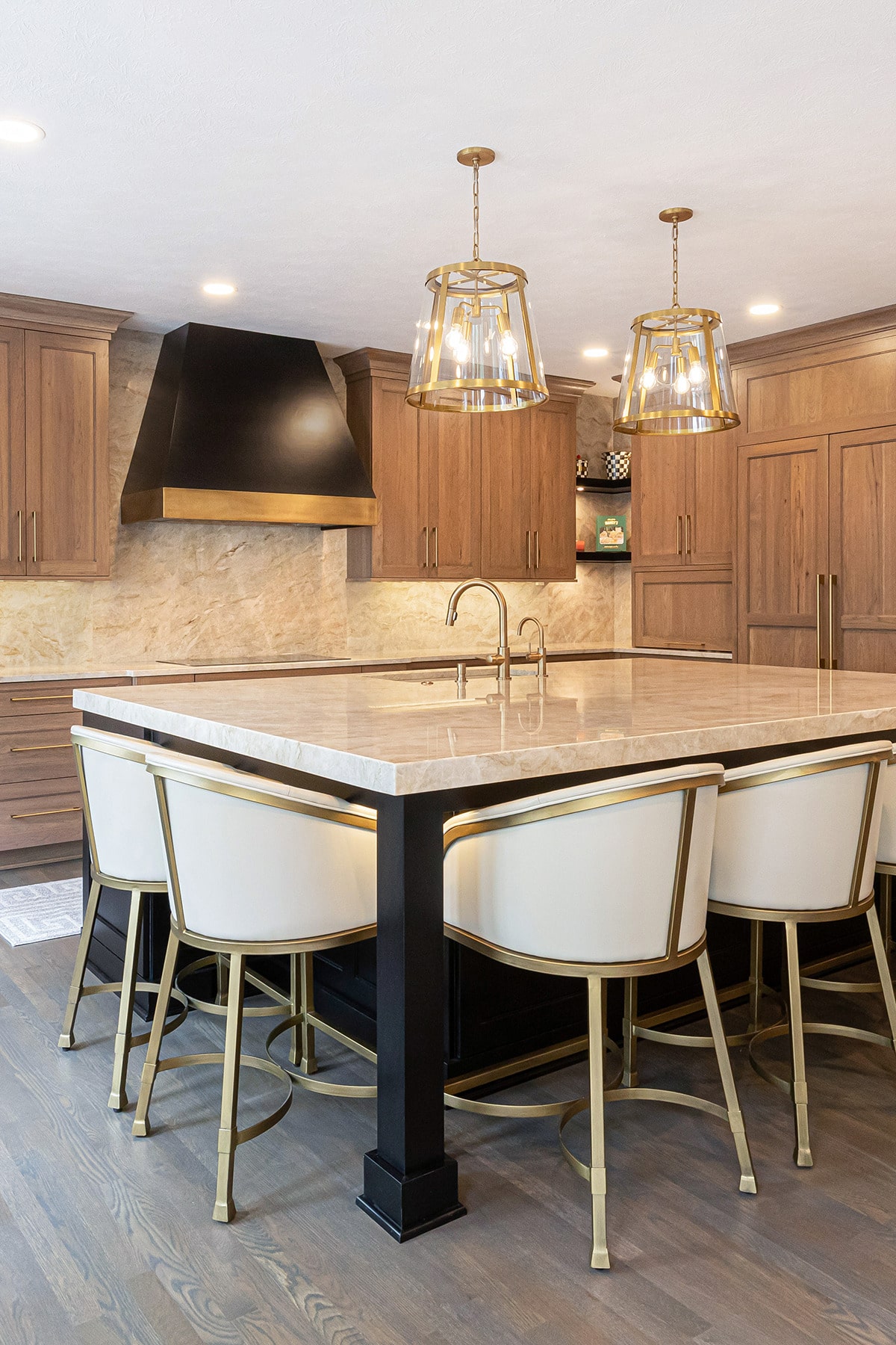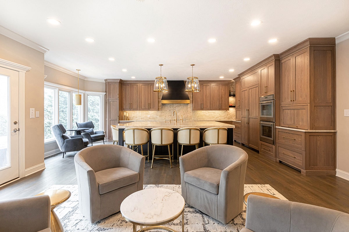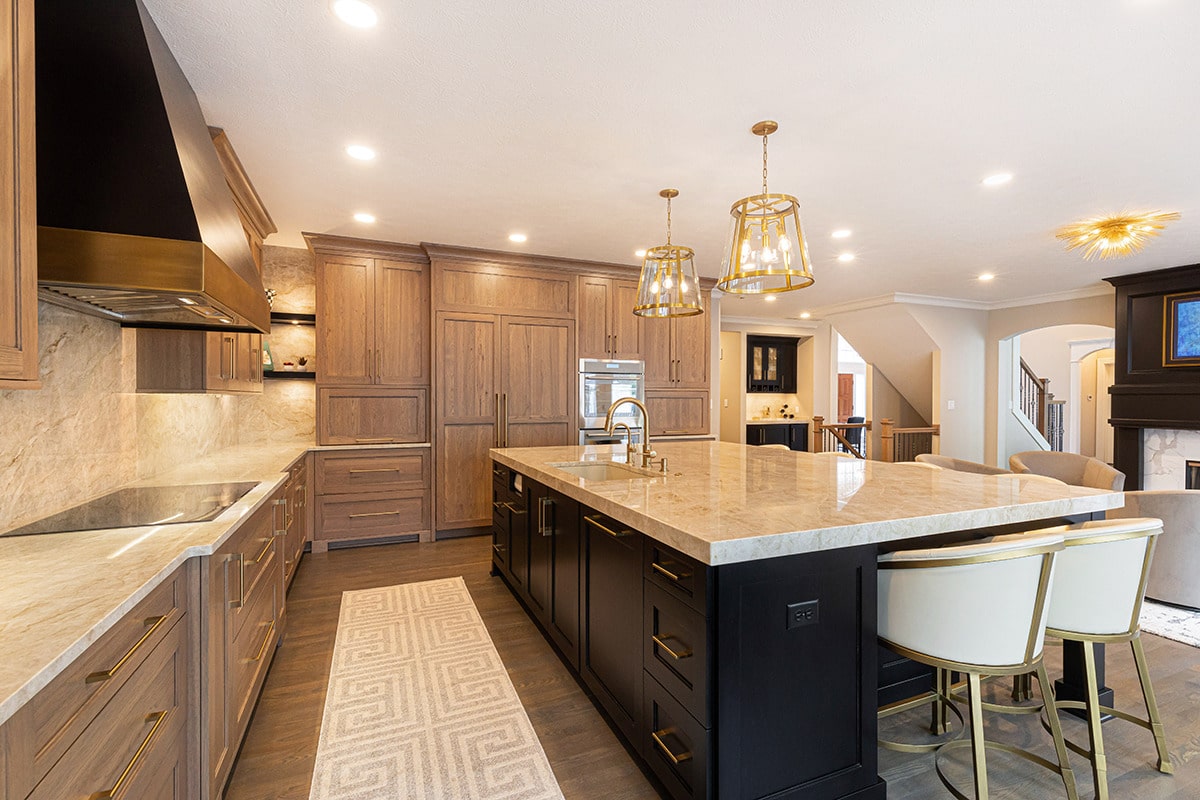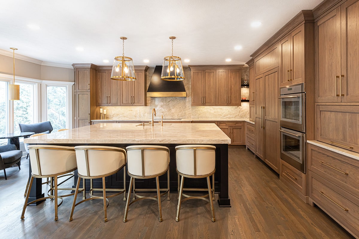 Their kitchen had an awkward angled island that limited its functional use and usable space in the room. The angled pantry they had was not user friendly, and the layout of the space was not ideal. We completely redesigned the kitchen layout, allowing for a large kitchen island, cabinetry taken to the eat-in nook, and relocated all the appliances. Taj Mahal Quartzite counters and full height splash create impact on the island, and the sink sports a kitchen faucet as well an insta-hot beverage faucet. A custom hood, finished to match the island, is now the focal point of the room and is symmetrical with the new sink, lighting, and the hearth room fireplace. Seating for two creates a cozy area for morning coffee and the kitchen area seating has doubled for this couple who enjoy entertaining. A large walk-in pantry with modern barn door access was designed with specificity to the homeowners needs. It also houses the chiller for the bar chilled water faucet.