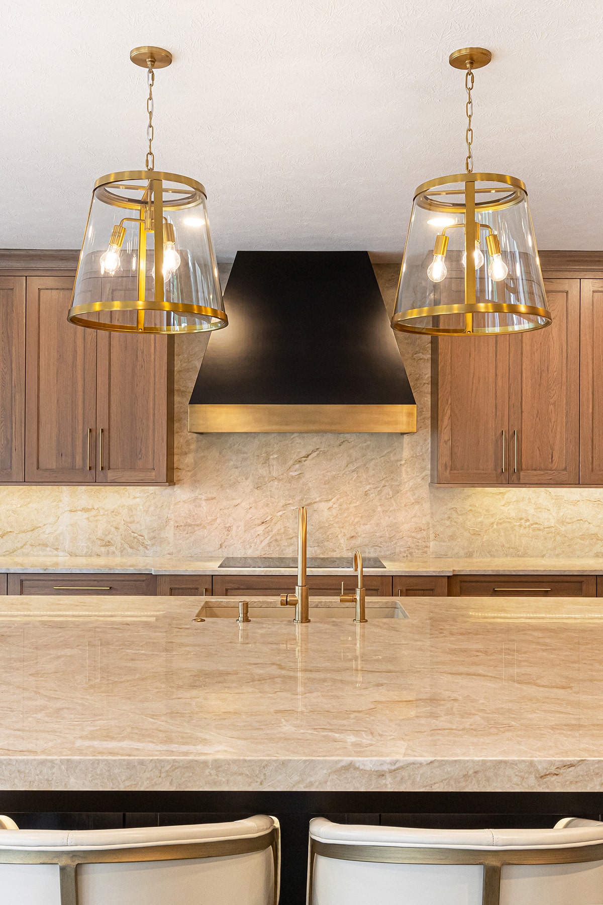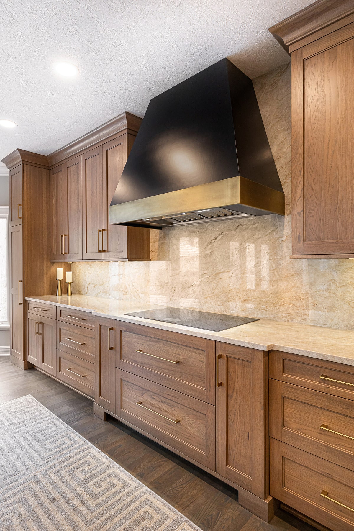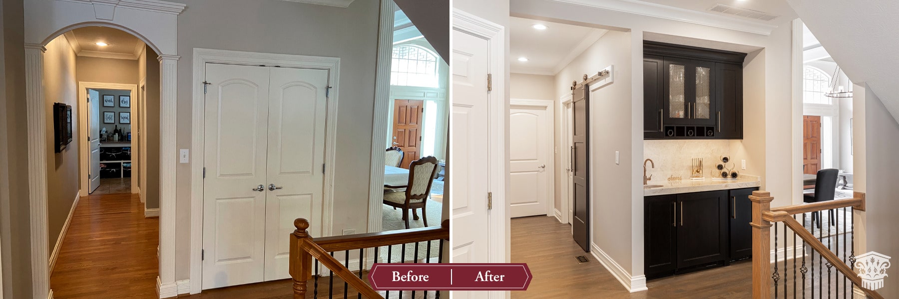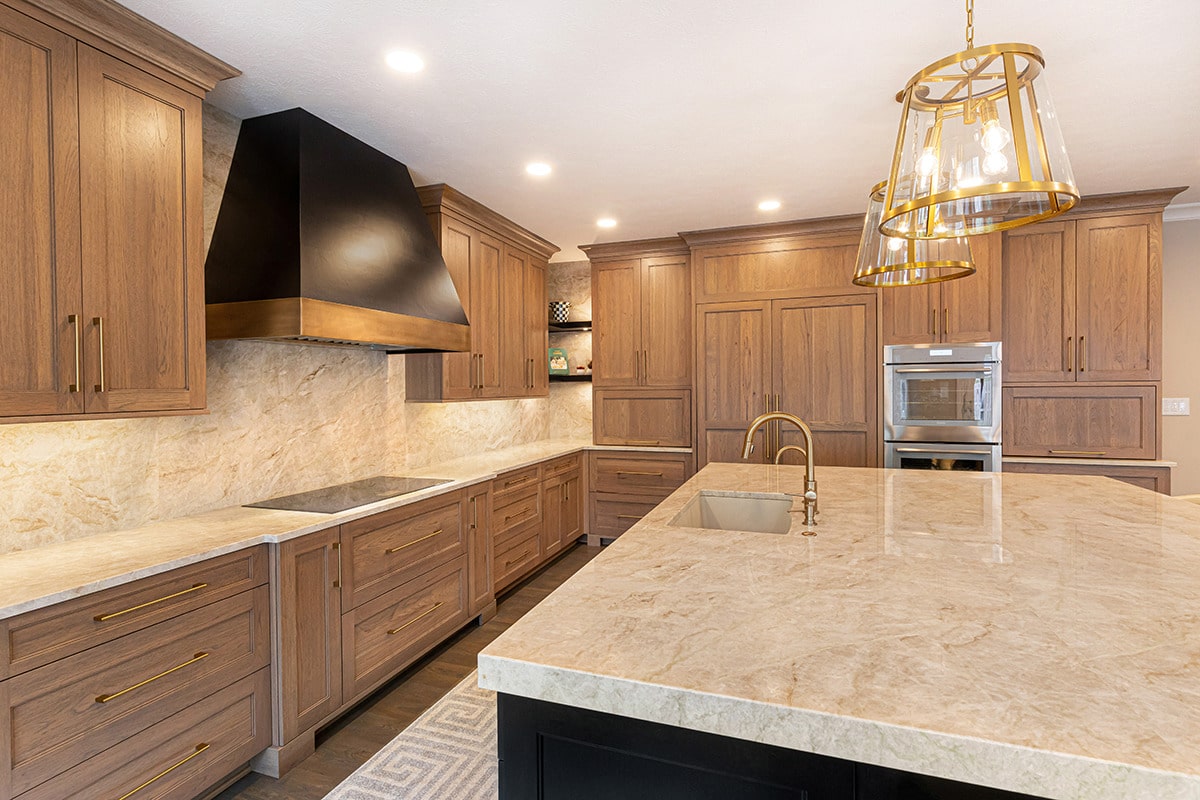 Their kitchen had an awkward angled island that limited its functional use and usable space in the room. The angled pantry they had was not user friendly, and the layout of the space was not ideal. We completely redesigned the kitchen layout, allowing for a large kitchen island, cabinetry taken to the eat-in nook, and relocated all the appliances. Taj Mahal Quartzite counters and full height splash create impact on the island, and the sink sports a kitchen faucet as well an insta-hot beverage faucet. A custom hood, finished to match the island, is now the focal point of the room and is symmetrical with the new sink, lighting, and the hearth room fireplace. Seating for two creates a cozy area for morning coffee and the kitchen area seating has doubled for this couple who enjoy entertaining. A large walk-in pantry with modern barn door access was designed with specificity to the homeowners needs. It also houses the chiller for the bar chilled water faucet.