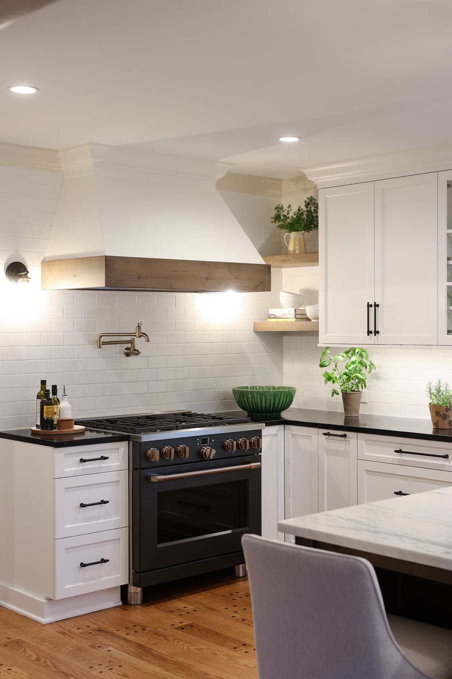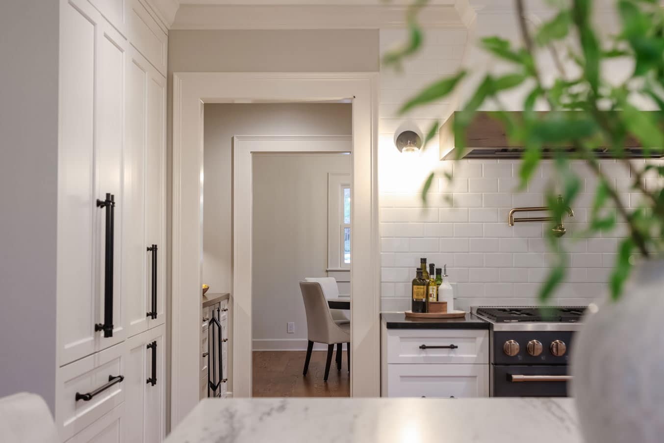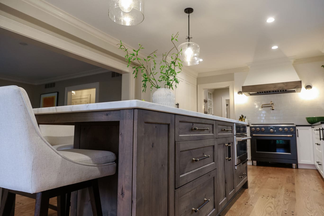 The original kitchen was too small and lacked a clear path for expansion. Our solution? Flip the kitchen and dining areas to create an open floor plan that maximizes space and flow. A large multipurpose island became the heart of the kitchen—perfect for food prep, casual dining, and entertaining. Fully integrated appliances, a pro-style range with brass knobs, a pot filler, and a high-speed cooking oven elevated the cooking experience, while custom cabinetry offered smart storage solutions.