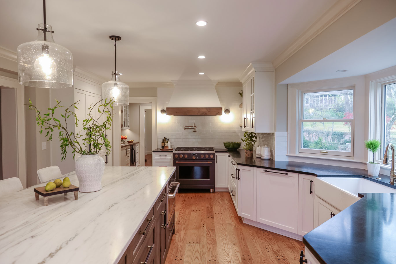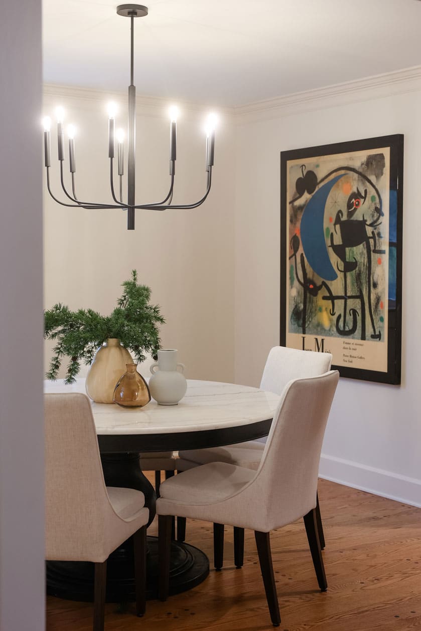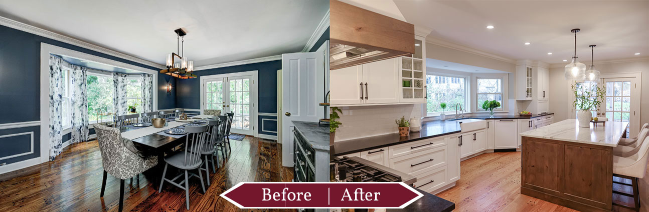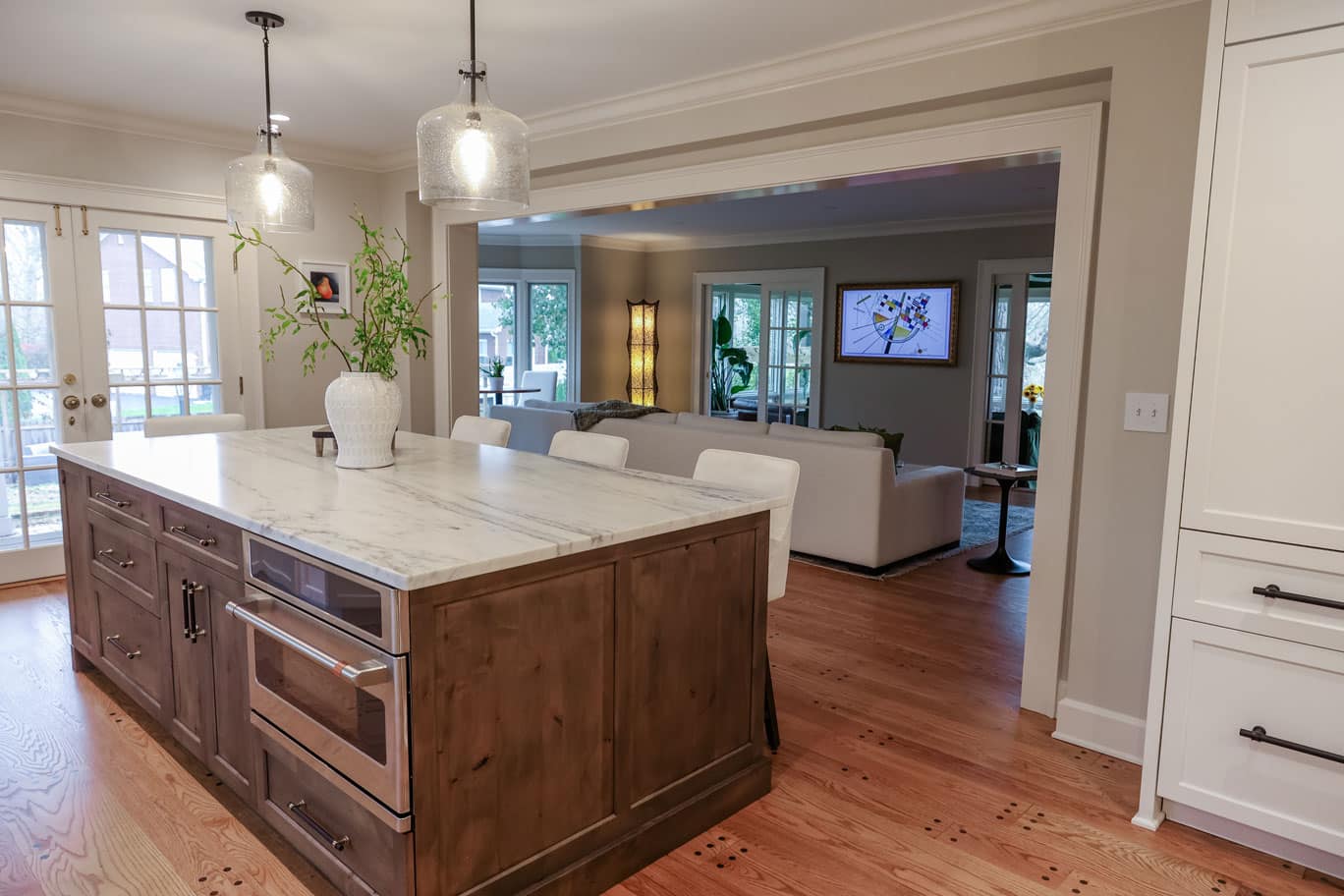 The original kitchen was too small and lacked a clear path for expansion. Our solution? Flip the kitchen and dining areas to create an open floor plan that maximizes space and flow. A large multipurpose island became the heart of the kitchen—perfect for food prep, casual dining, and entertaining. Fully integrated appliances, a pro-style range with brass knobs, a pot filler, and a high-speed cooking oven elevated the cooking experience, while custom cabinetry offered smart storage solutions.