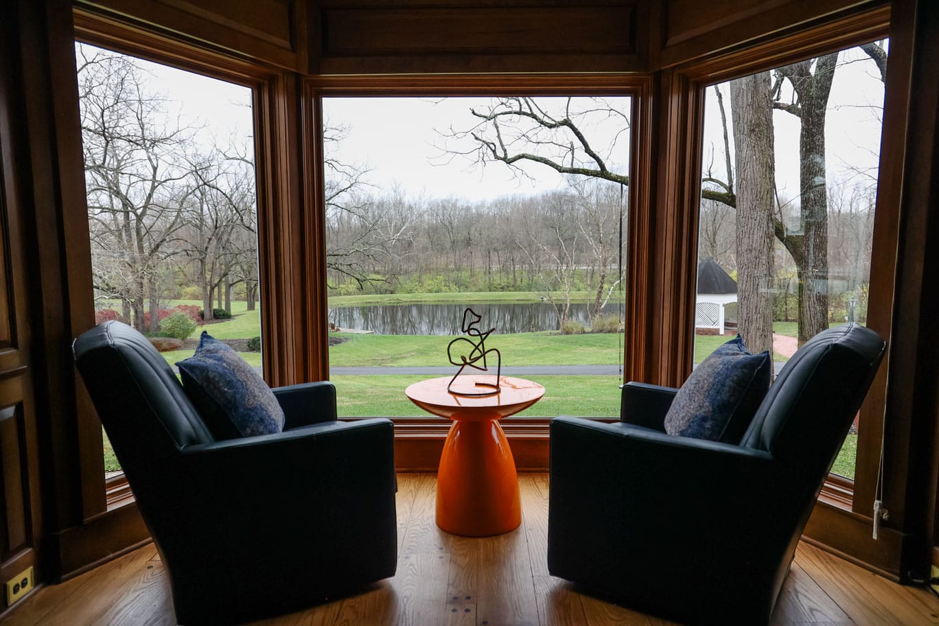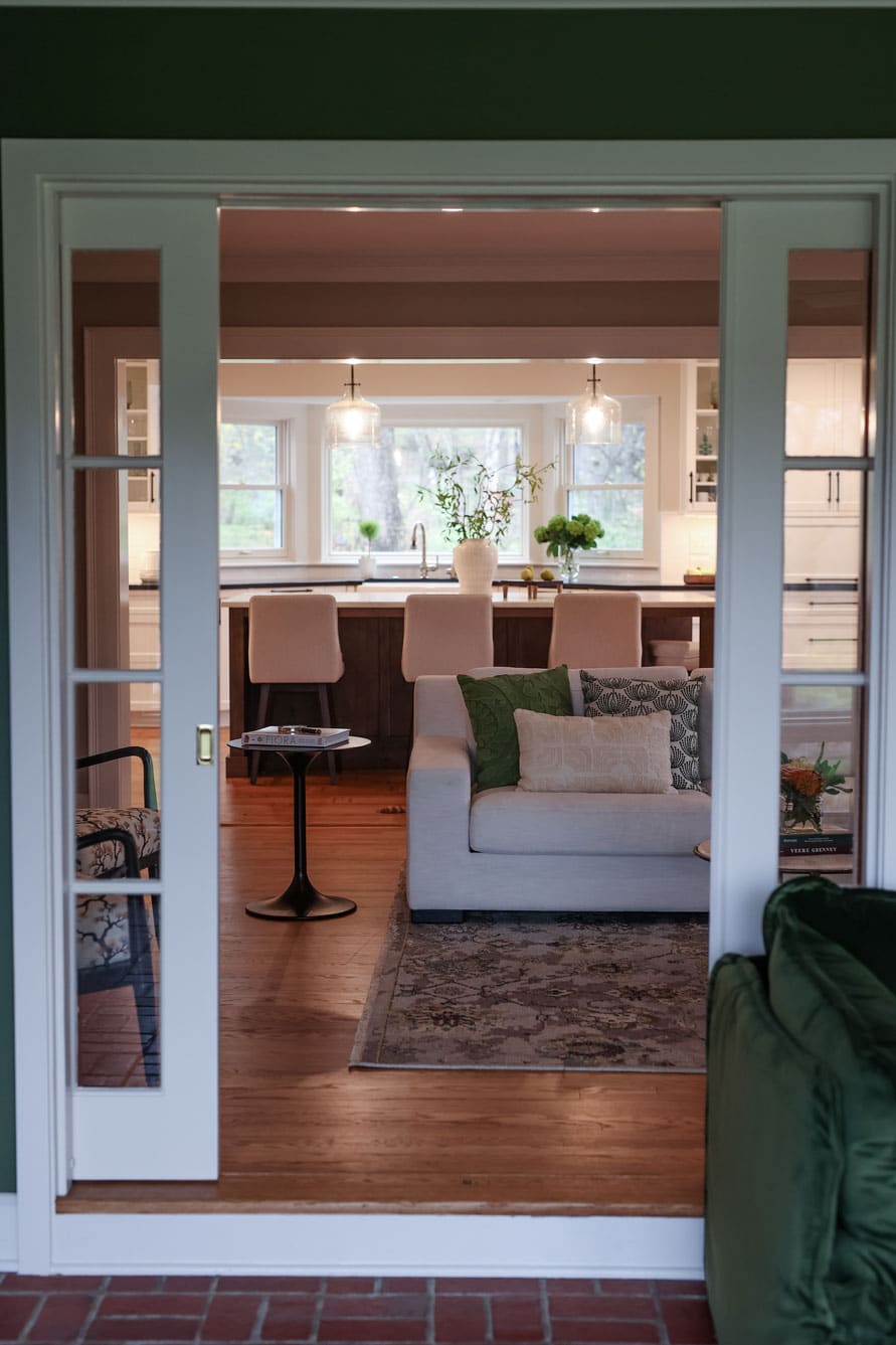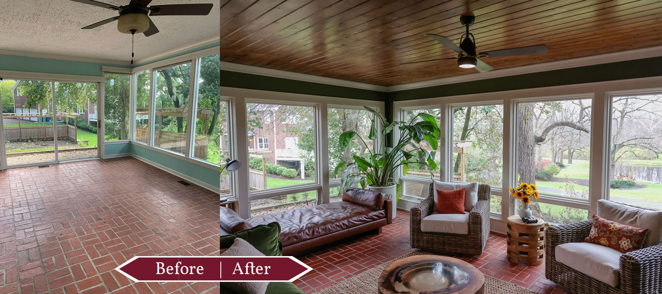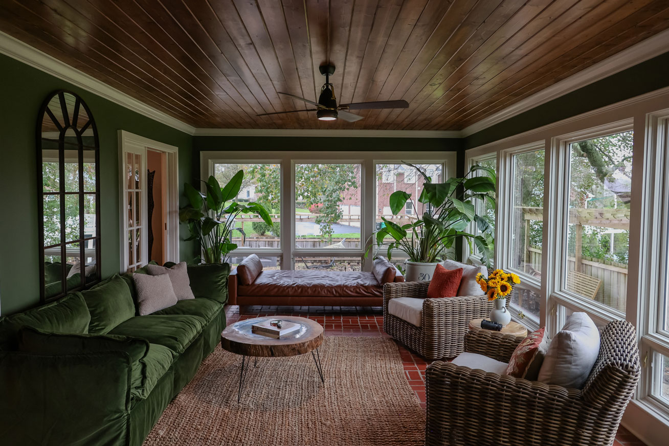 To bring warmth and character to the sunroom, we replaced all the windows with a fixed upper and operable awning window that frame the stunning outdoor views. A stained plank ceiling and rich green walls add an inviting, nature-inspired touch.