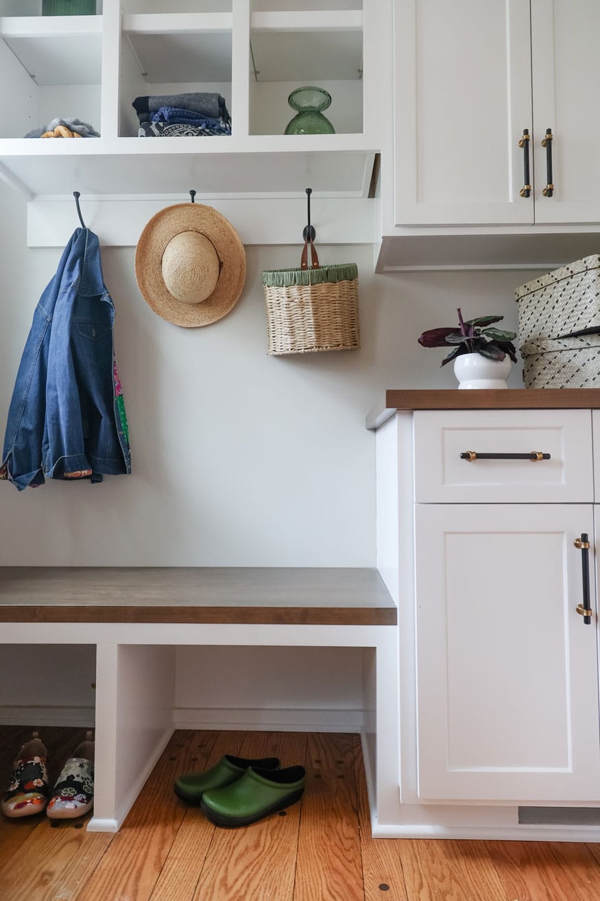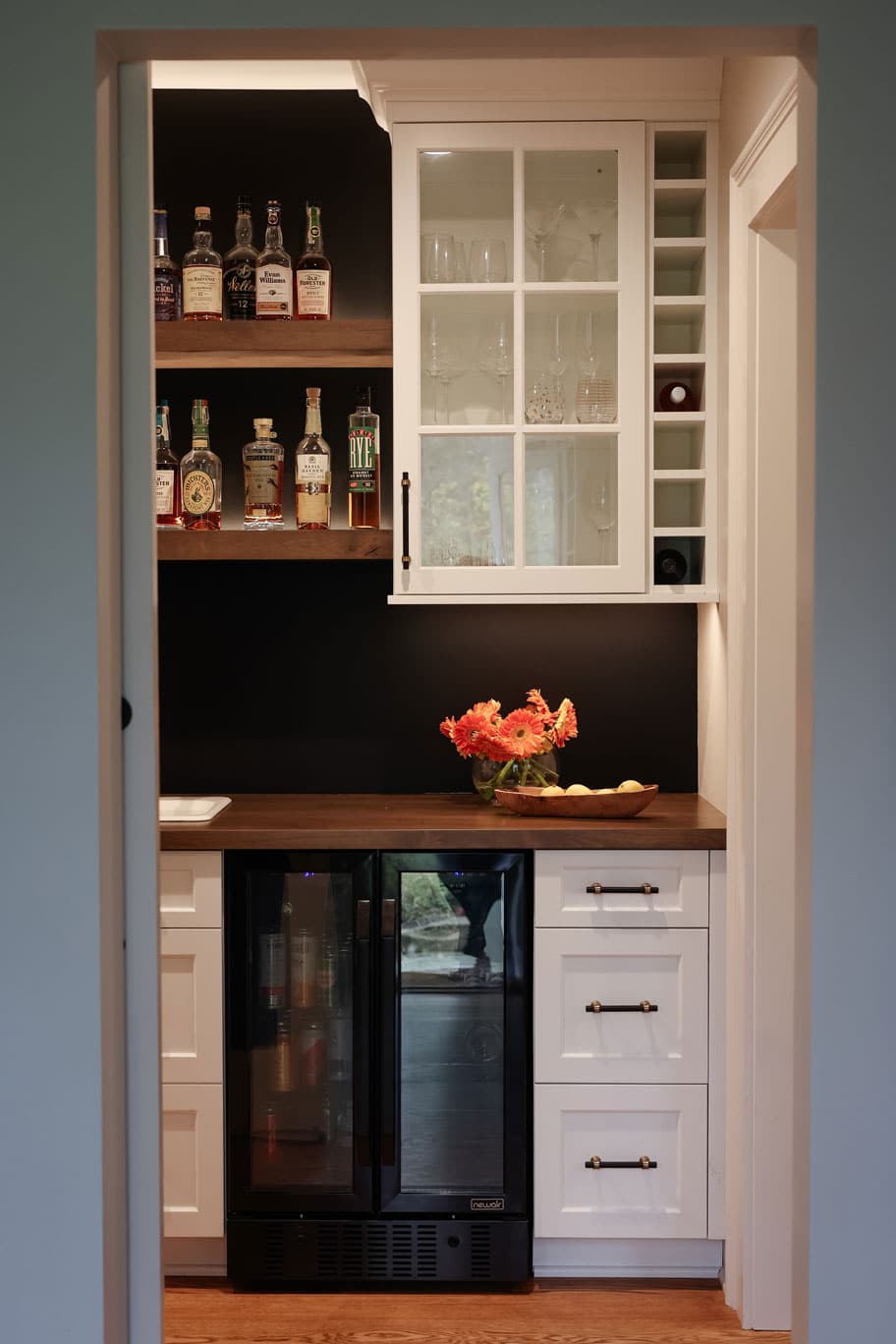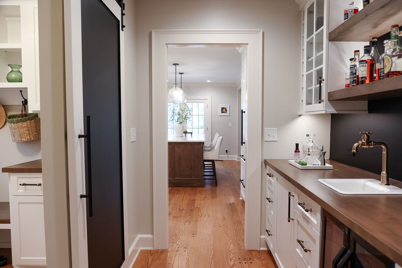 Since a walk-in pantry wasn’t a priority, we designed a butler’s pantry that doubles as a bar and serving area, complete with a beverage refrigerator, open shelving, glass-door cabinetry, and wine storage cubbies. A barn door separates this space from the mudroom, which was a key addition to keep the front foyer clutter-free and provide an easy-access spot for their pets.