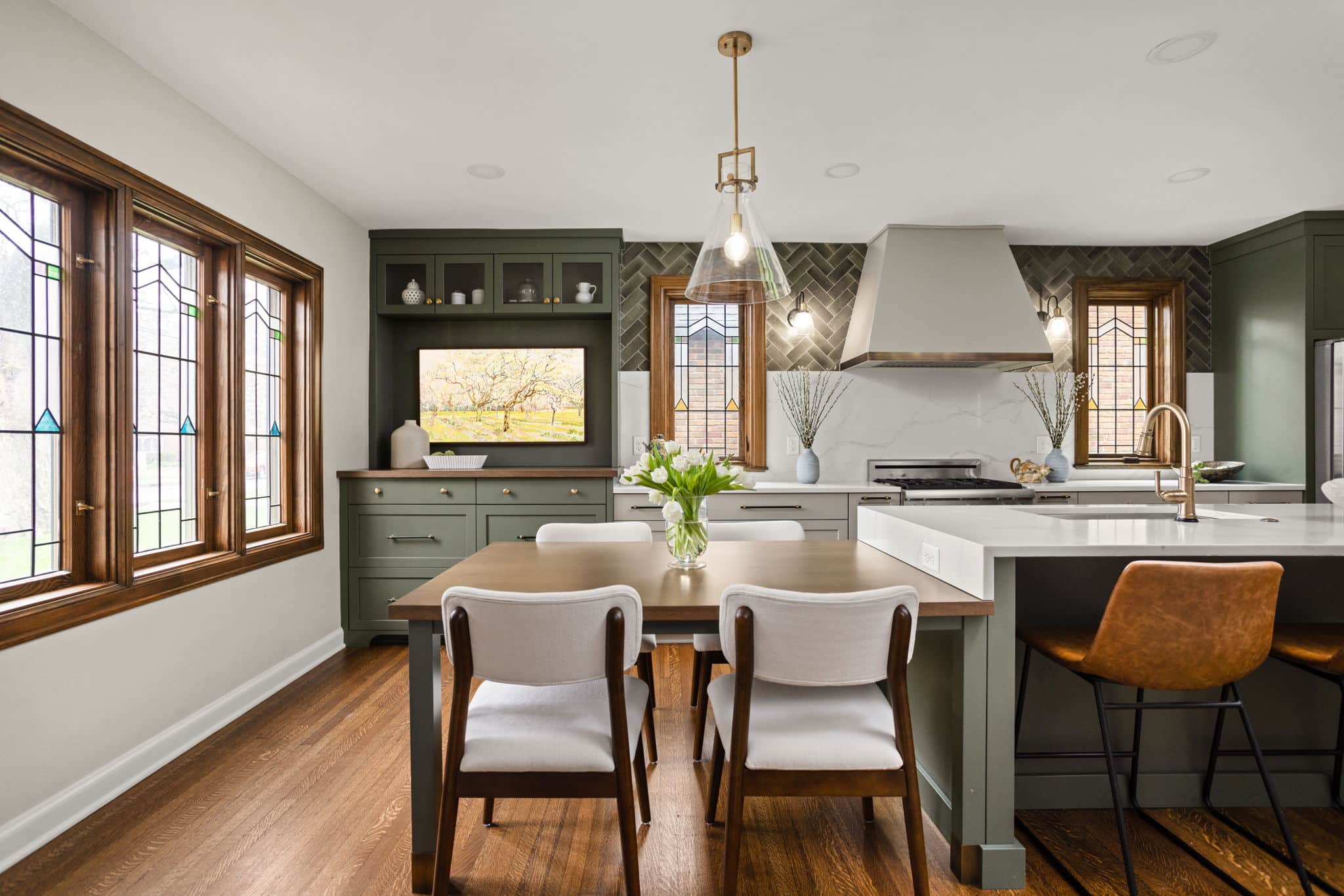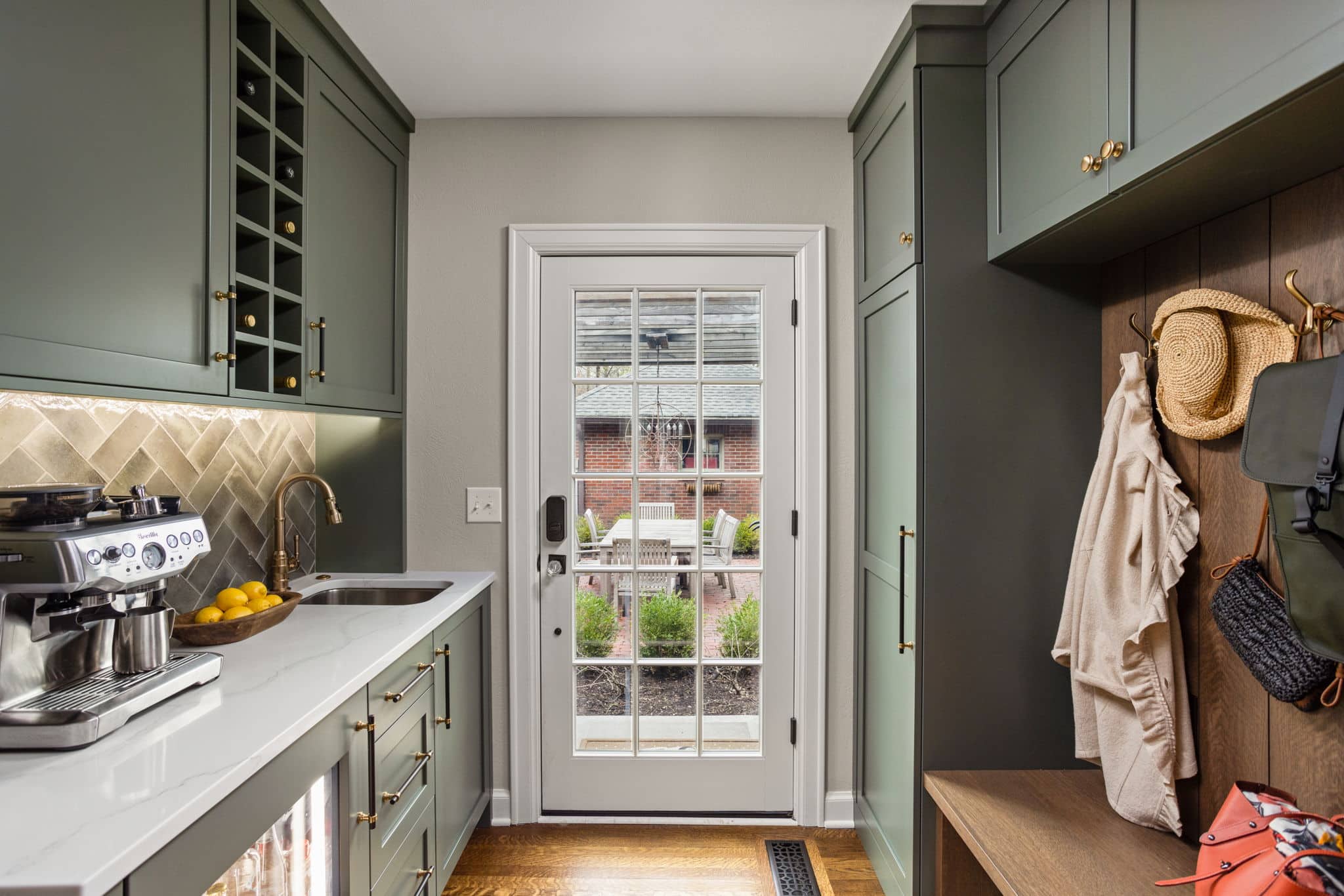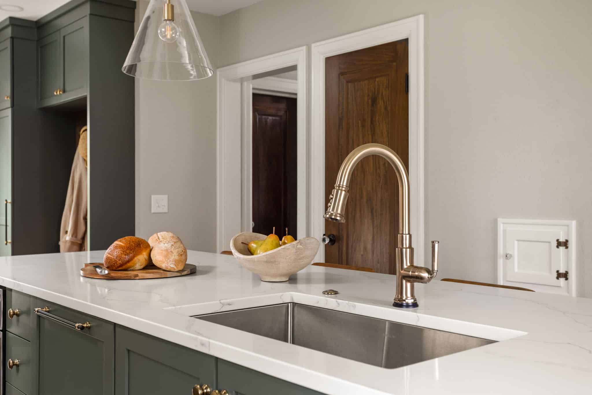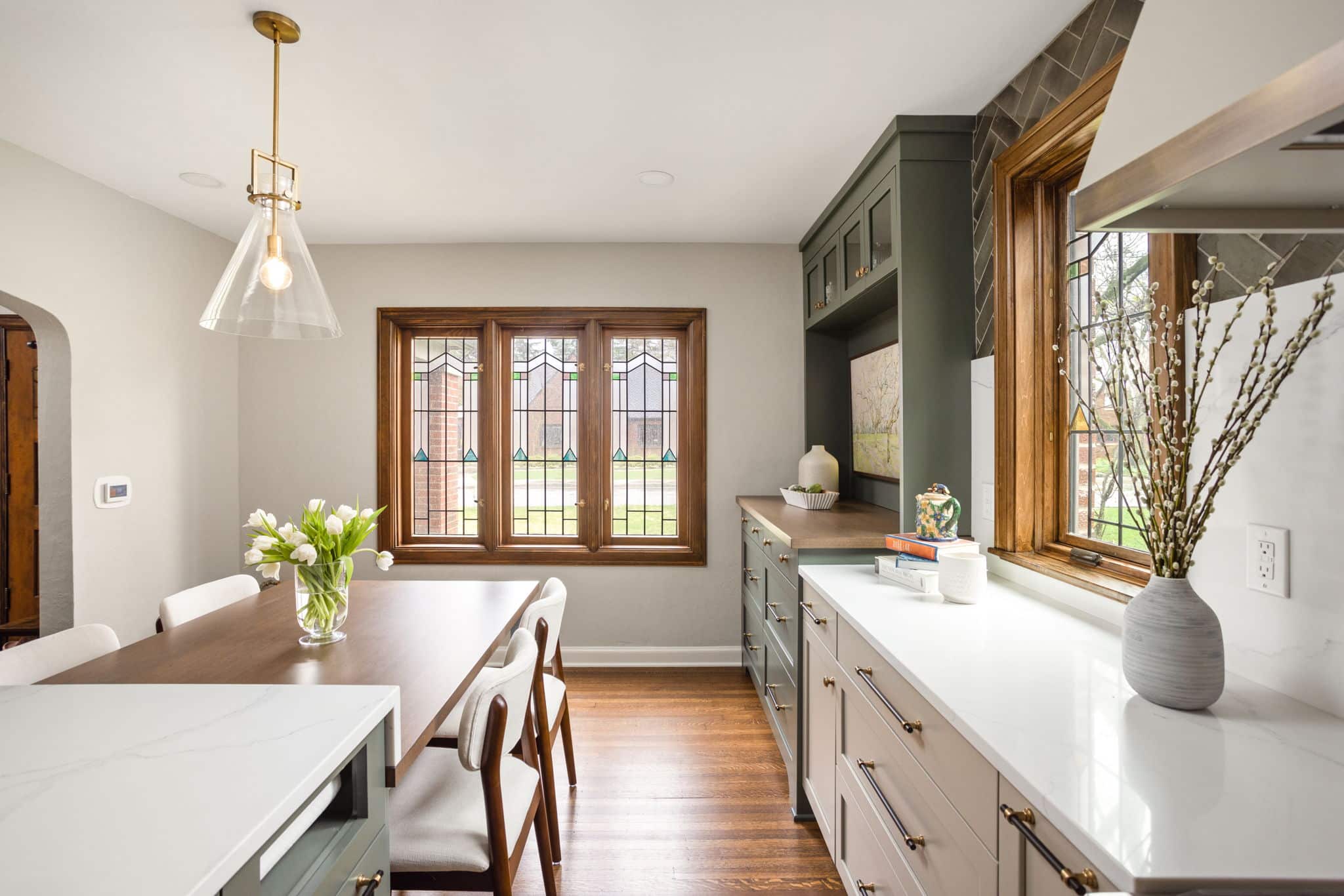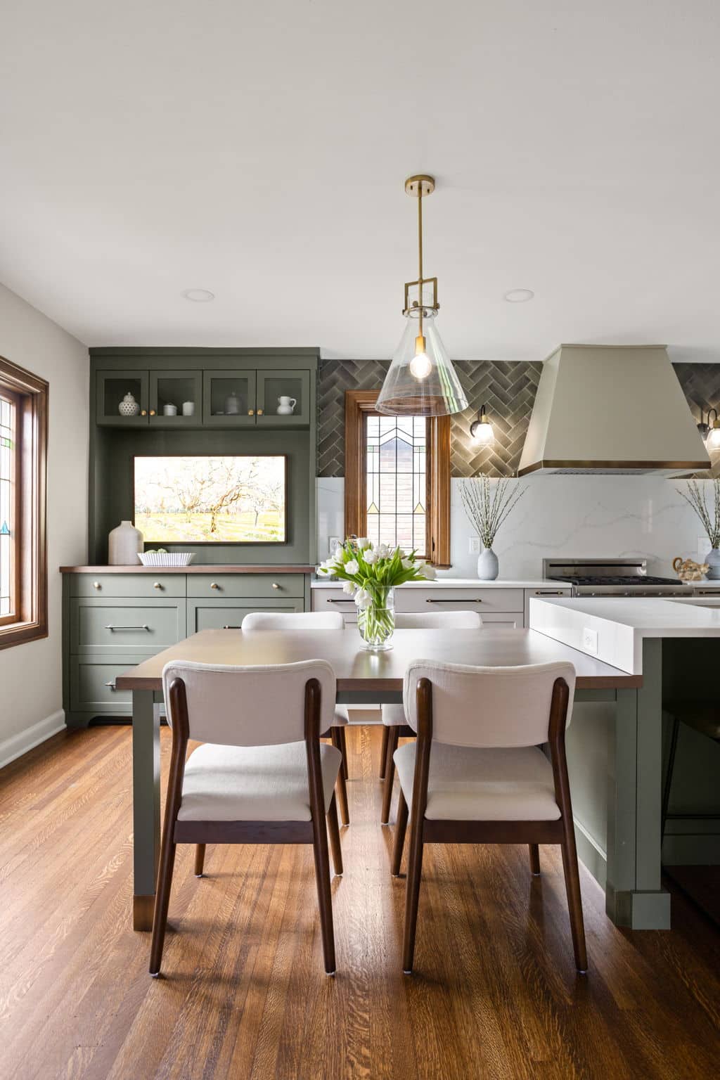 A light, airy color palette of green, light gray and natural wood incorporates elements of biophilic design while golden bronze hardware and fixtures give a nod to the home’s history and original aesthetic. As in every remodel we complete, each aspect of our design took into consideration this family’s desire to maximize their time together by creating an enjoyable and convenient living space in the areas where they spend the most time after busy days at work and school.