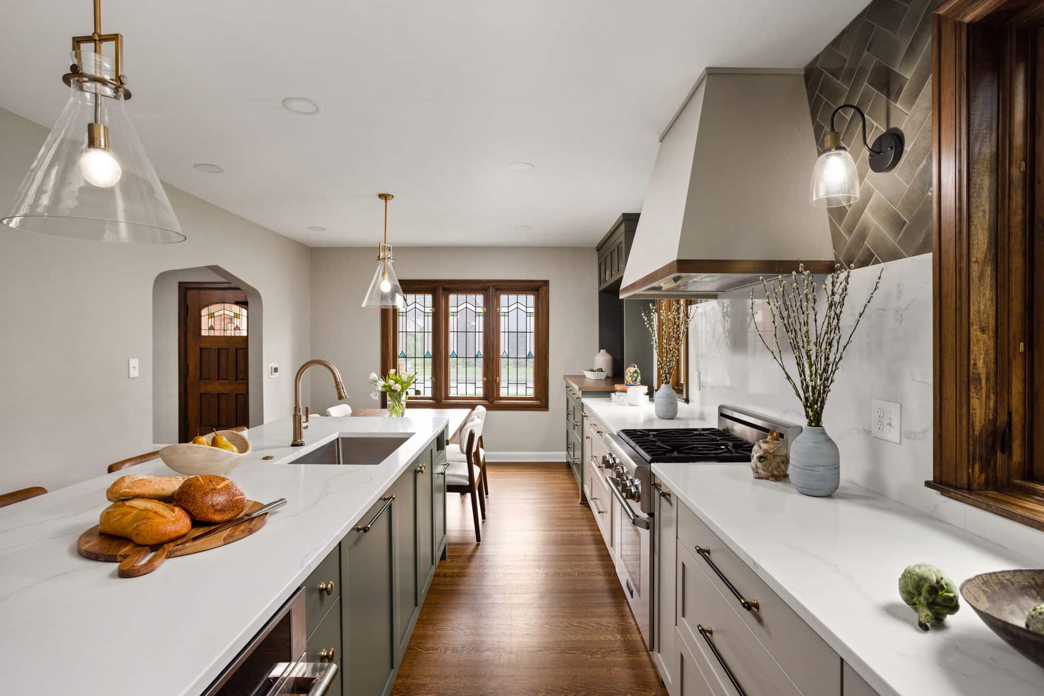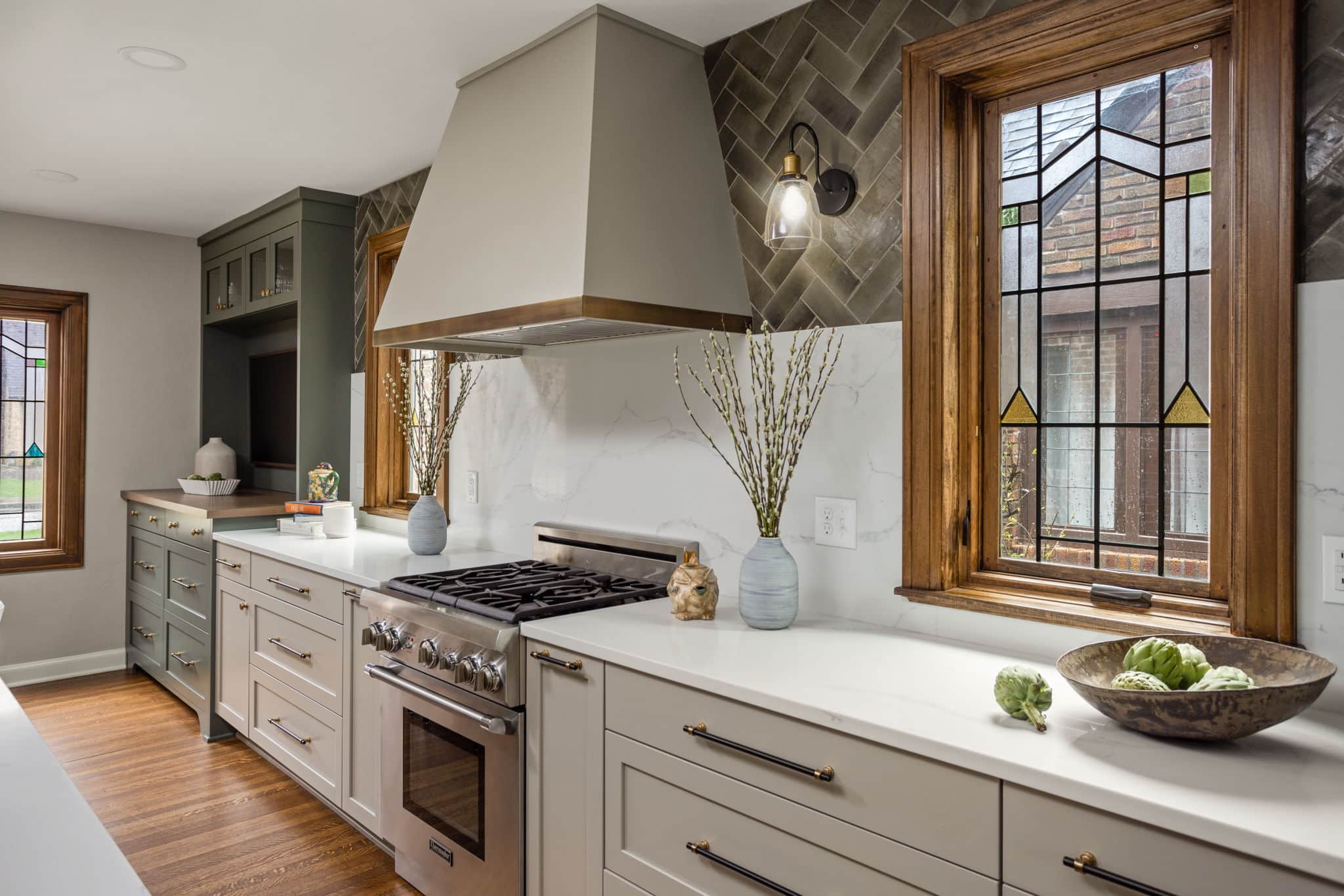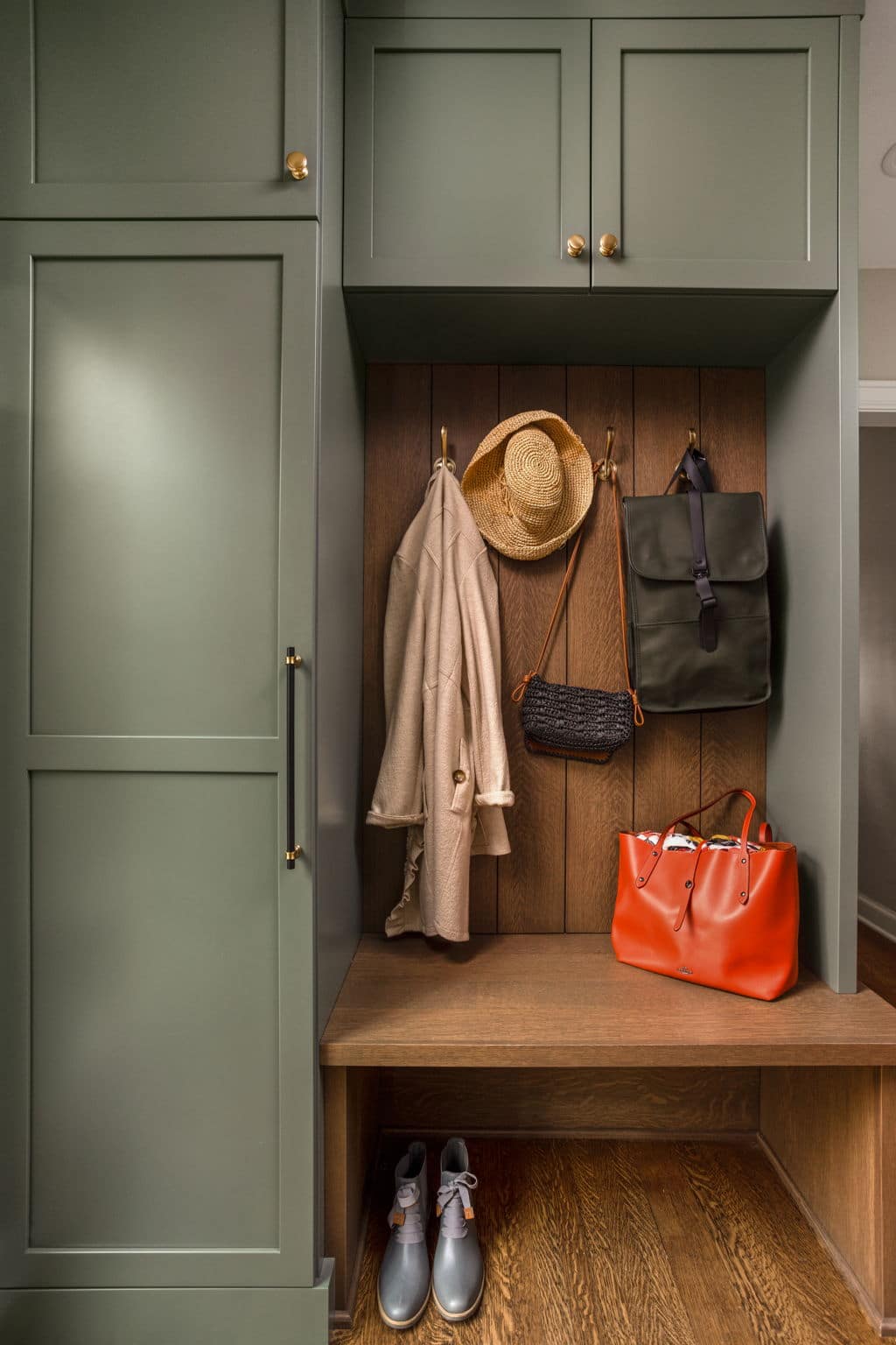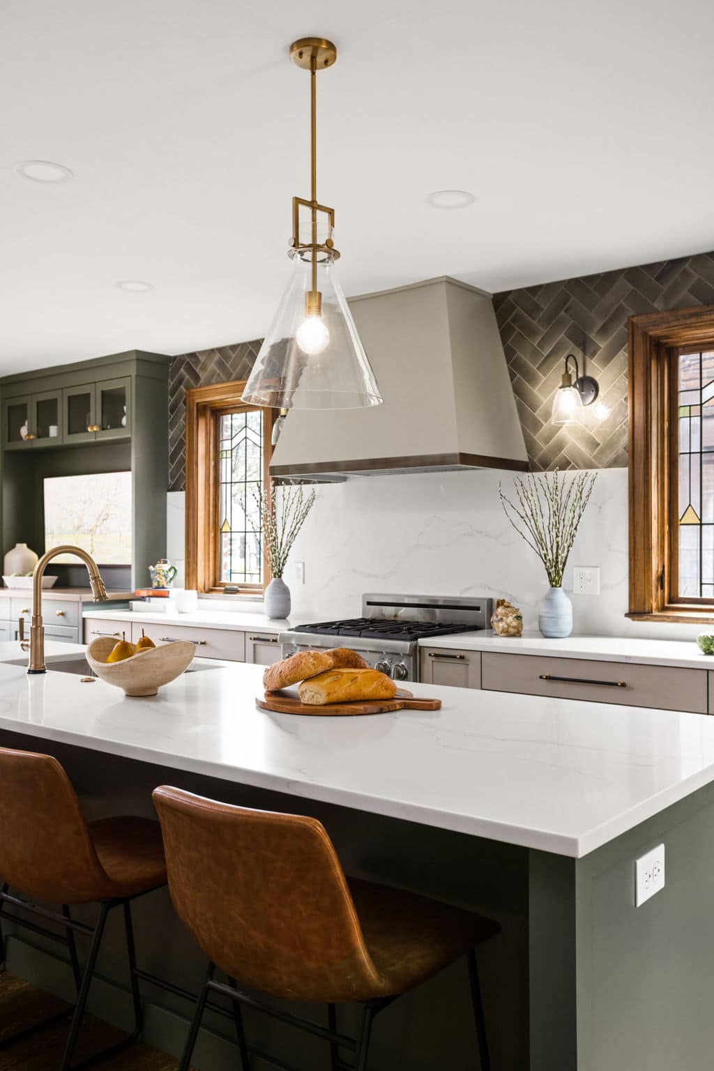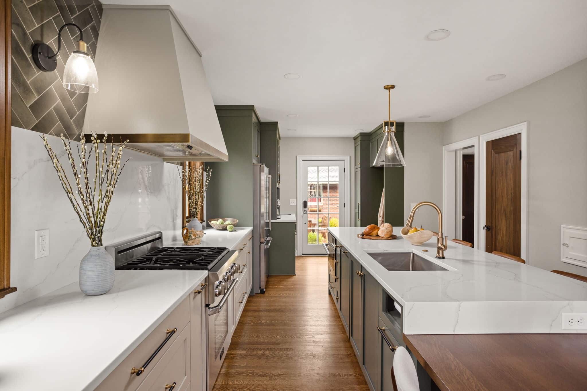 A light, airy color palette of green, light gray and natural wood incorporates elements of biophilic design while golden bronze hardware and fixtures give a nod to the home’s history and original aesthetic. As in every remodel we complete, each aspect of our design took into consideration this family’s desire to maximize their time together by creating an enjoyable and convenient living space in the areas where they spend the most time after busy days at work and school.