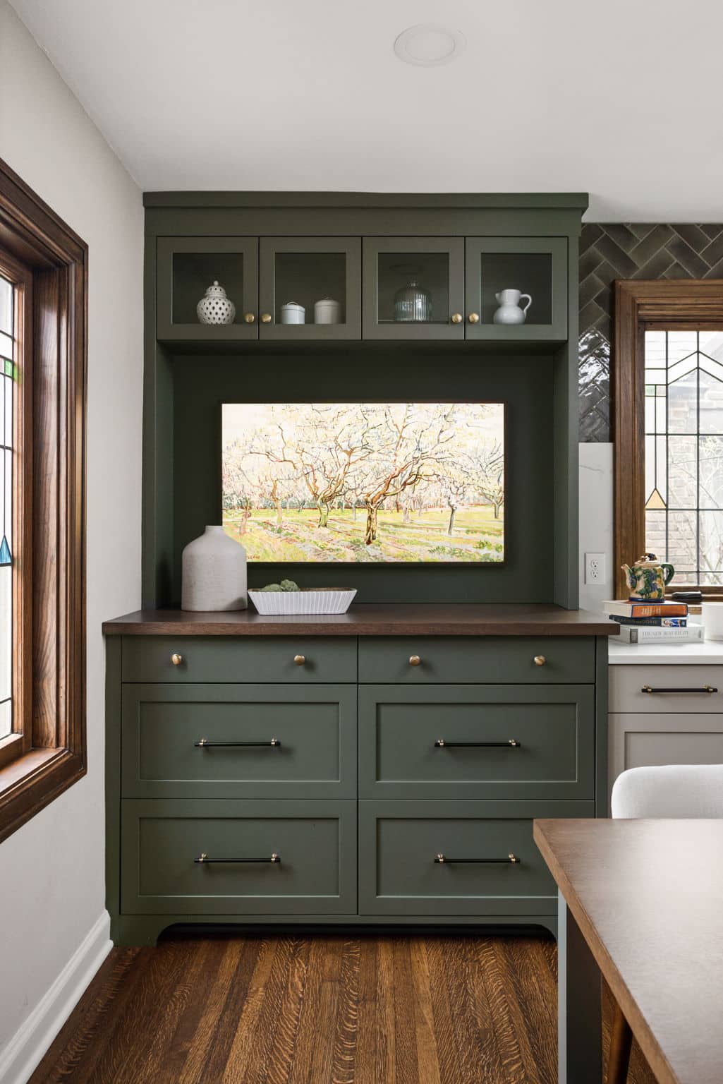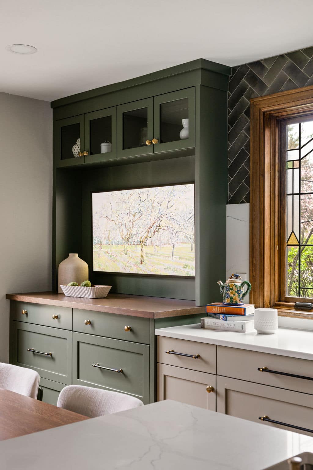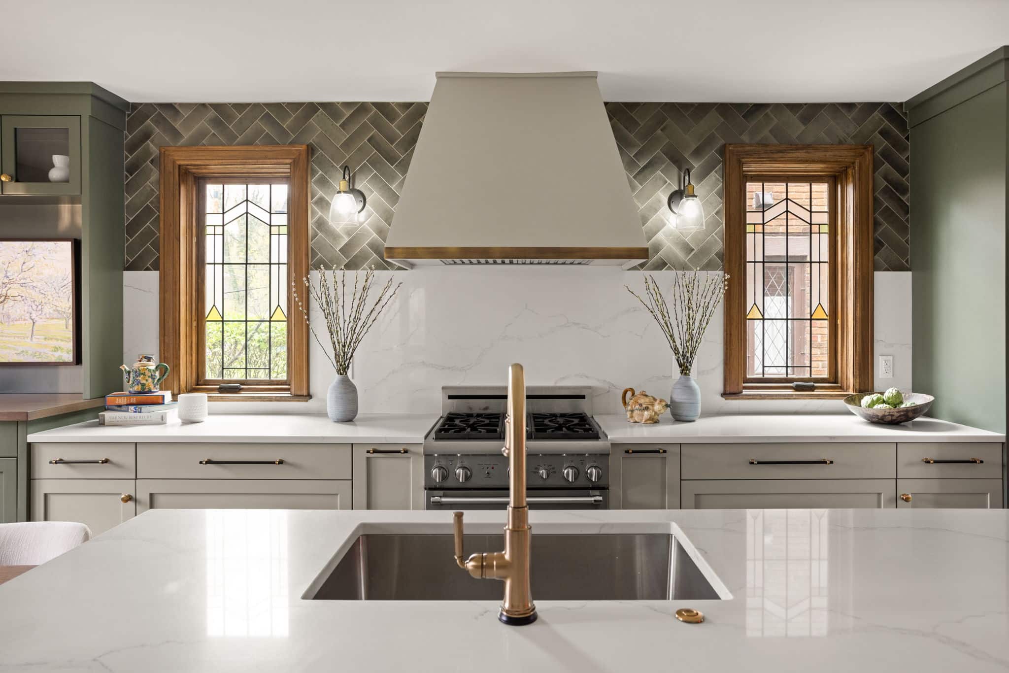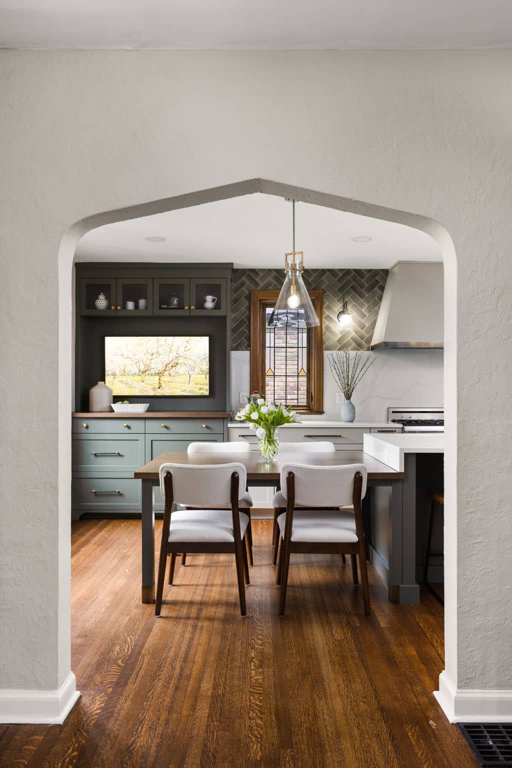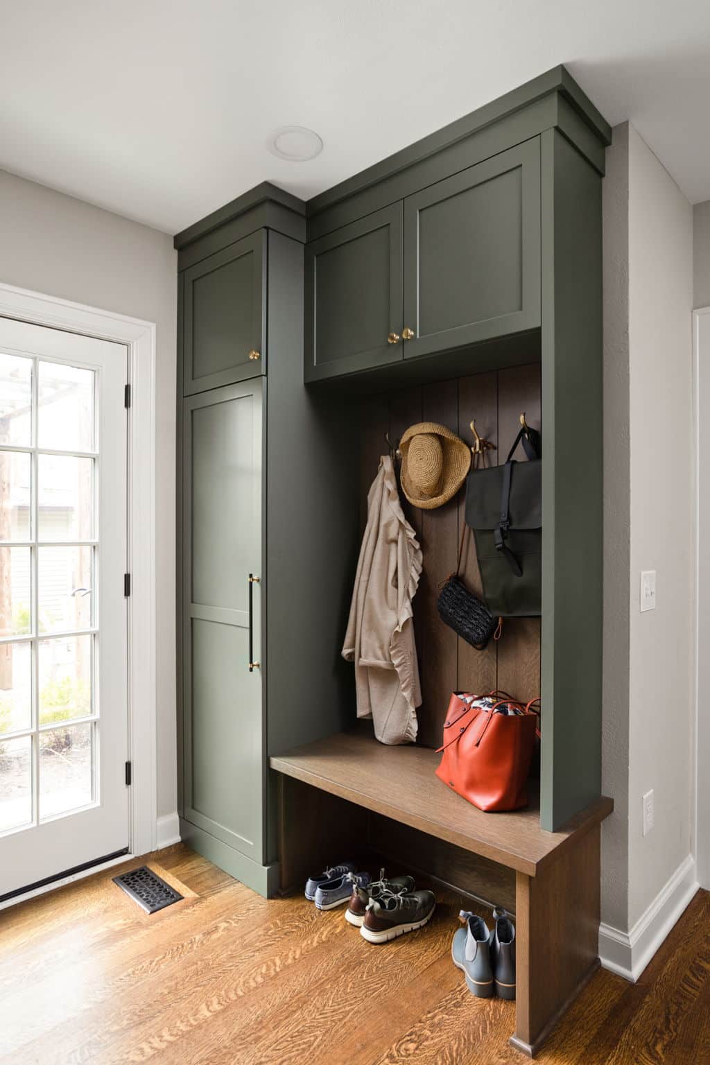 A light, airy color palette of green, light gray and natural wood incorporates elements of biophilic design while golden bronze hardware and fixtures give a nod to the home’s history and original aesthetic. As in every remodel we complete, each aspect of our design took into consideration this family’s desire to maximize their time together by creating an enjoyable and convenient living space in the areas where they spend the most time after busy days at work and school.