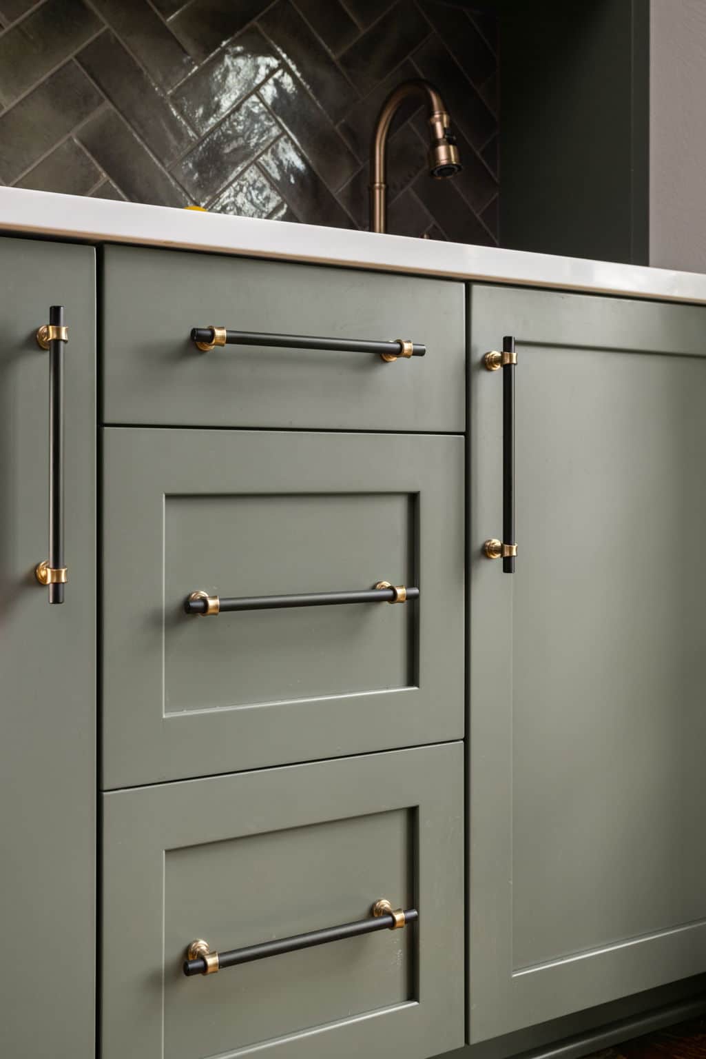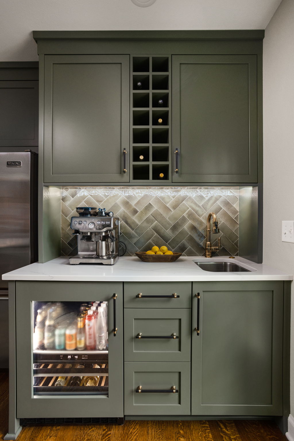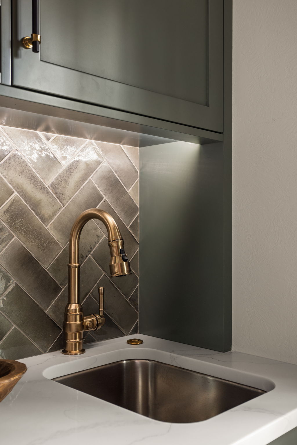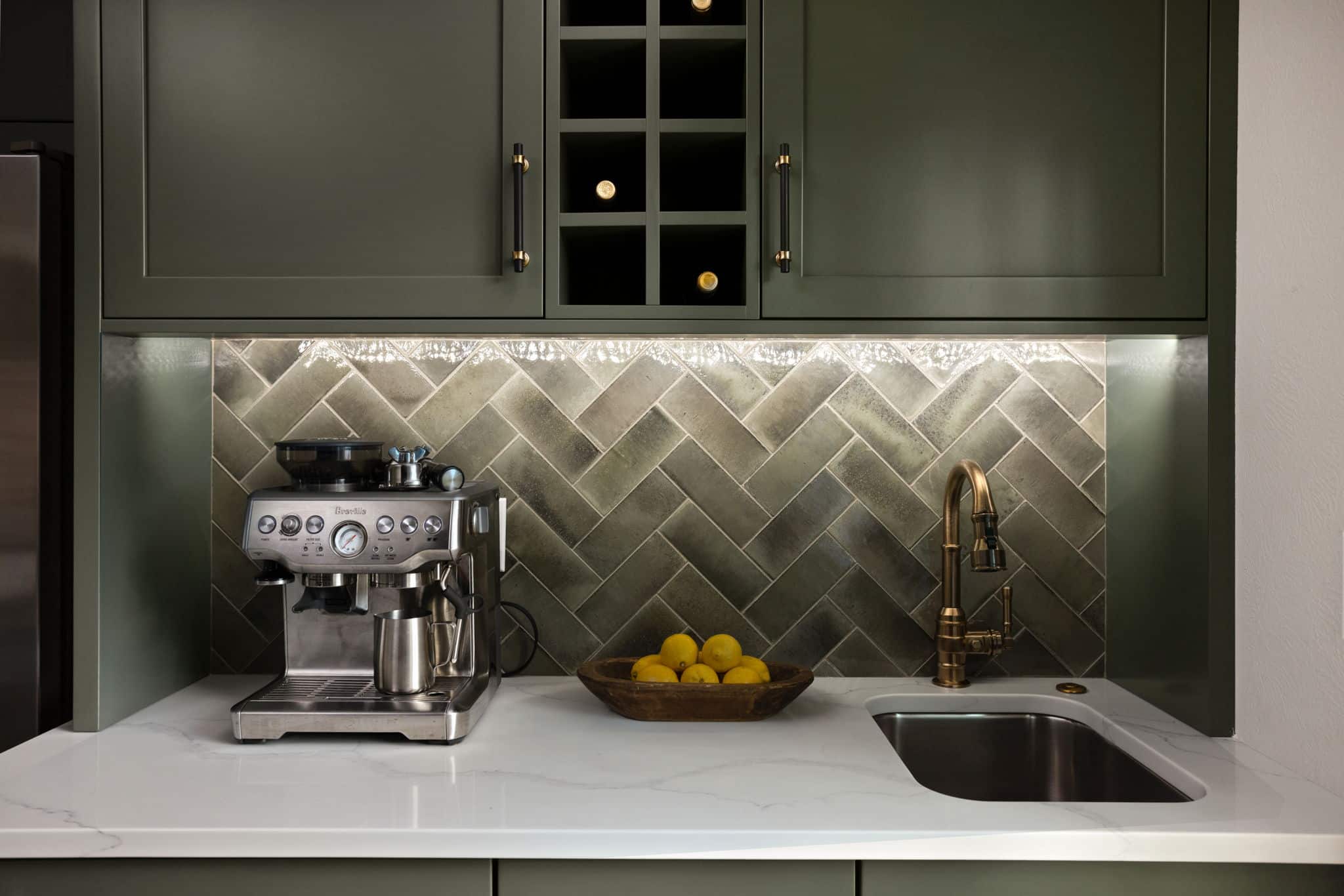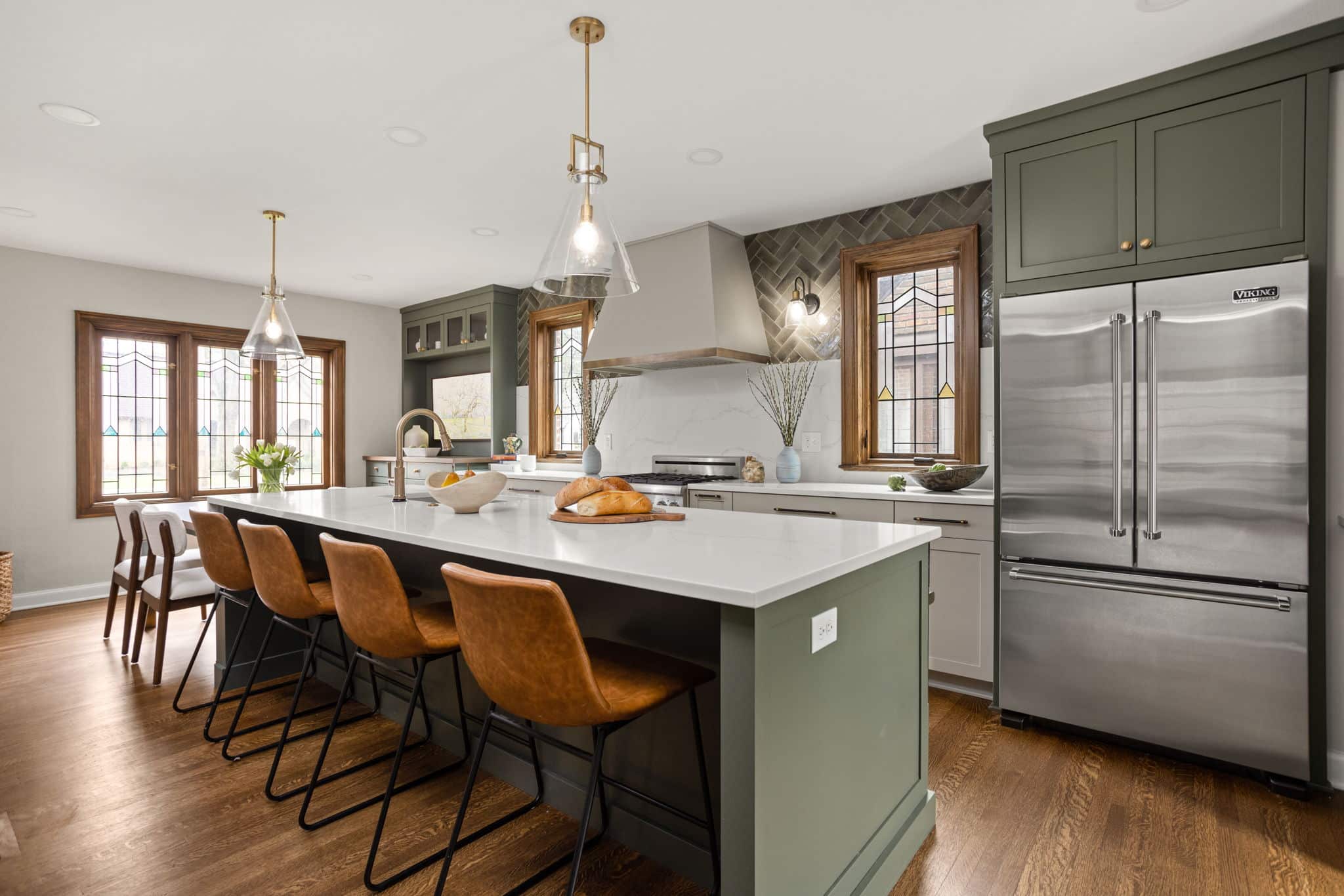 A light, airy color palette of green, light gray and natural wood incorporates elements of biophilic design while golden bronze hardware and fixtures give a nod to the home’s history and original aesthetic. As in every remodel we complete, each aspect of our design took into consideration this family’s desire to maximize their time together by creating an enjoyable and convenient living space in the areas where they spend the most time after busy days at work and school.