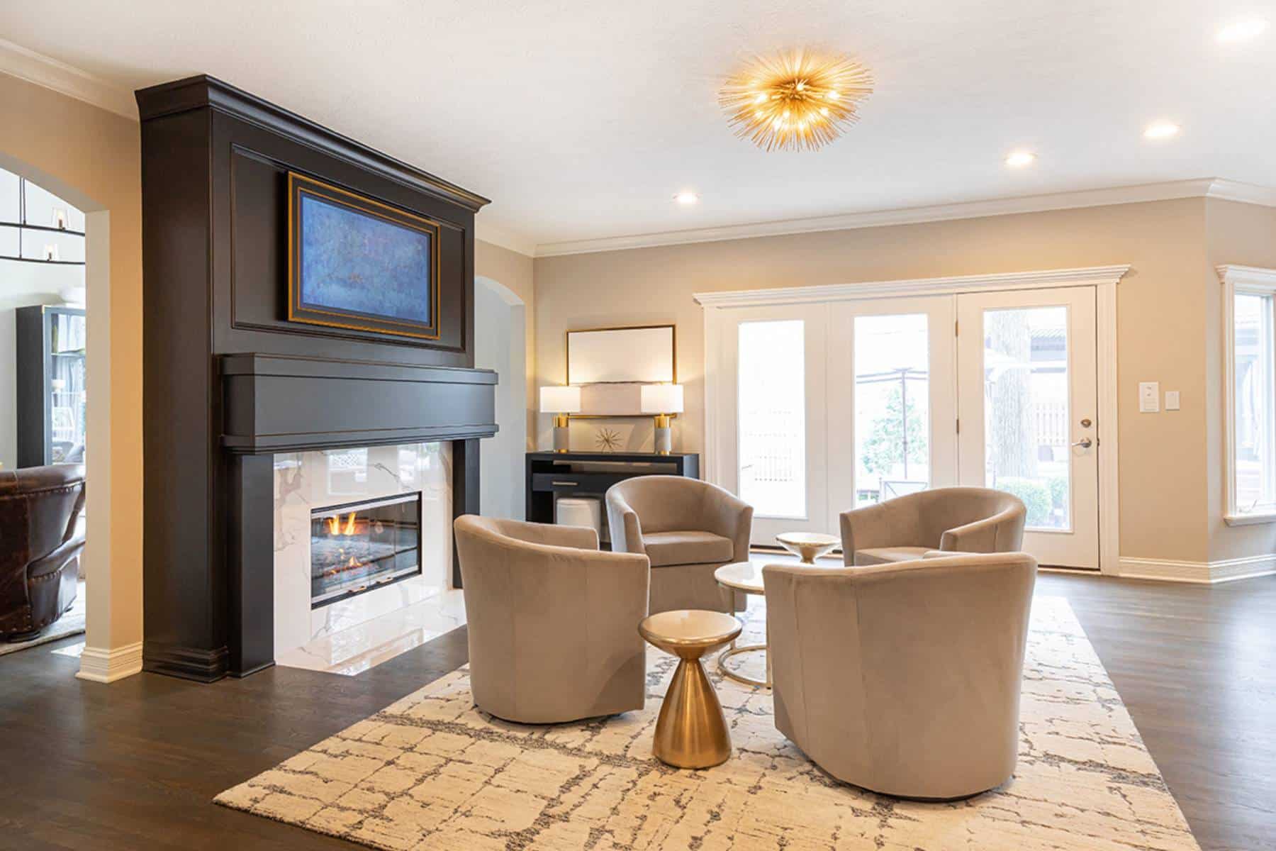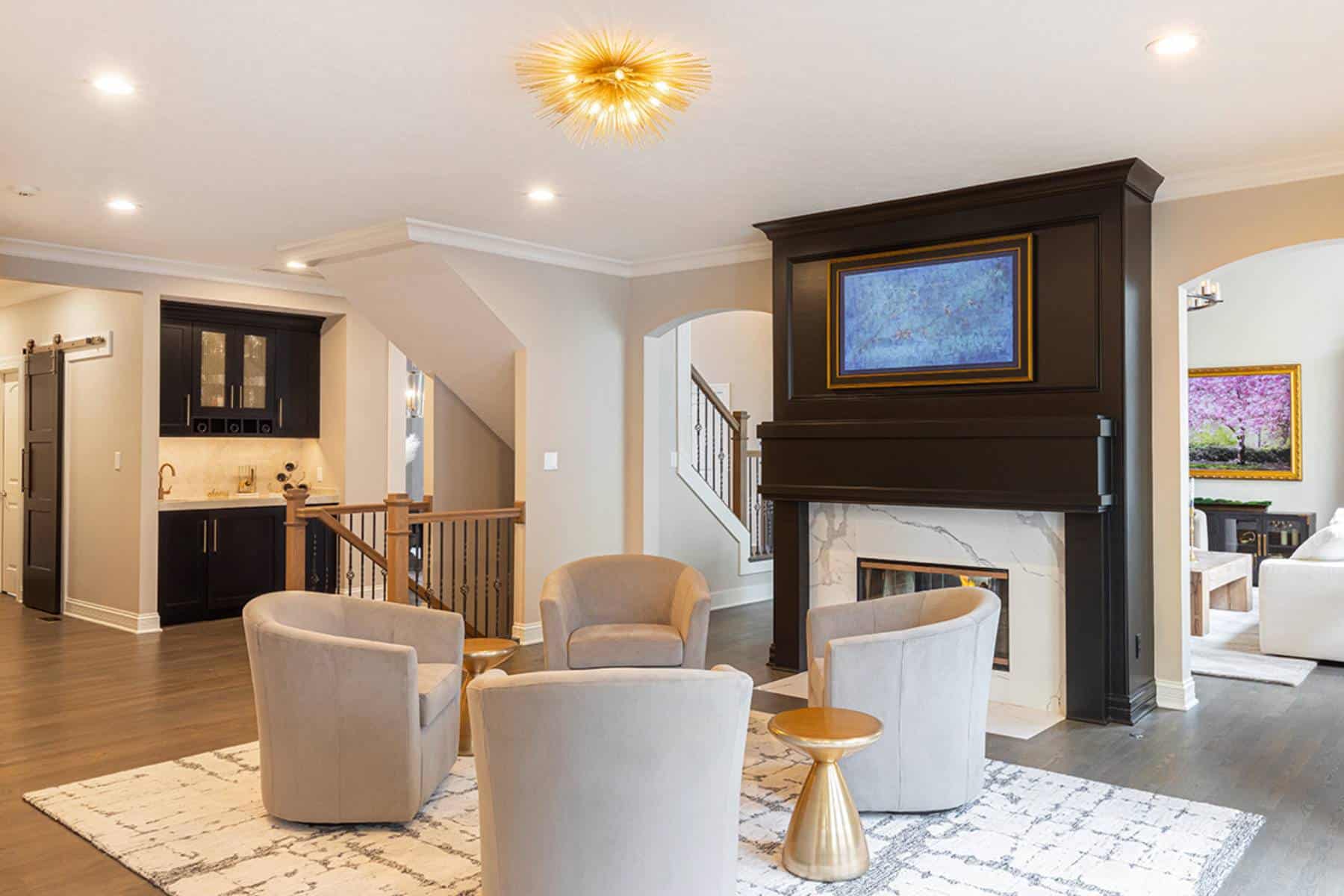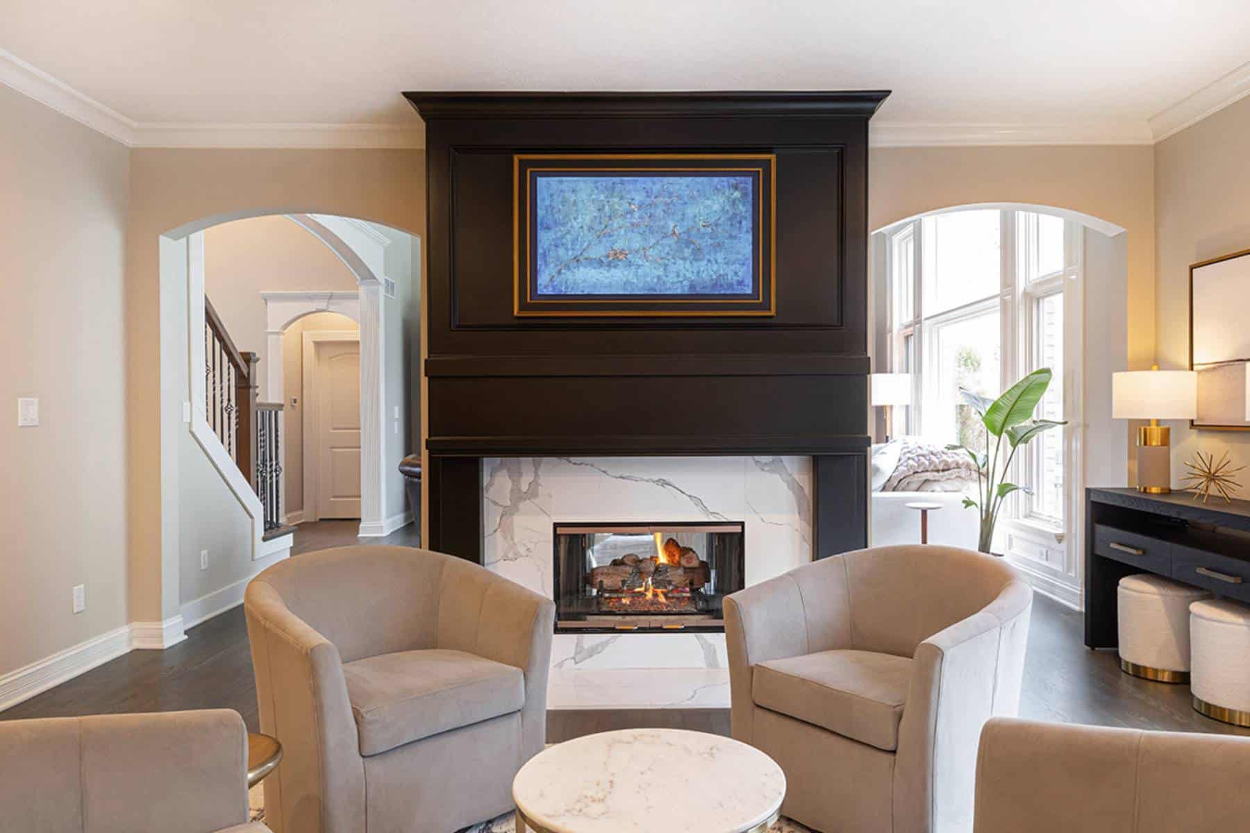 We removed built-in cabinetry around the hearth room fireplace and created a new entry into the family room. Both doorways were widened and now flaunt clean modern arches for consistency with the arches throughout the home. The circular traffic flow allows an openness for entertaining in the kitchen, hearth room and family room. We eliminated built-ins on either side of the hearth room fireplace, simplified the design, and painted the original fireplace black. We installed polished marbled white tile on the face and hearth, which gives it a modern aesthetic that coordinates well with the kitchen cabinetry.