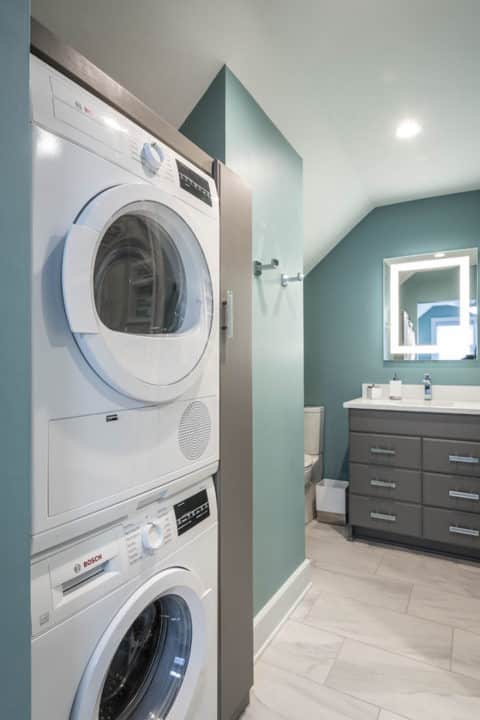 Her master bathroom was small, dated and inefficient with a corner shower. She used a couple small areas for storage, but wanted a more formal master closet and designated space for her shoes. Additionally, we worked with severely sloped ceilings, which required us to be creative in utilizing the space for a hallway as well as prized shoe storage while stealing space from the bedroom. She also asked for a laundry room on this floor, which we were able to create using stackable units. Custom closet cabinetry allowed for closed storage and a fun light fixture complete the space. Her new master bathroom allowed for a large shower with fun tile and bench, custom cabinetry with transitional plumbing fixtures, and a sliding barn door for privacy.