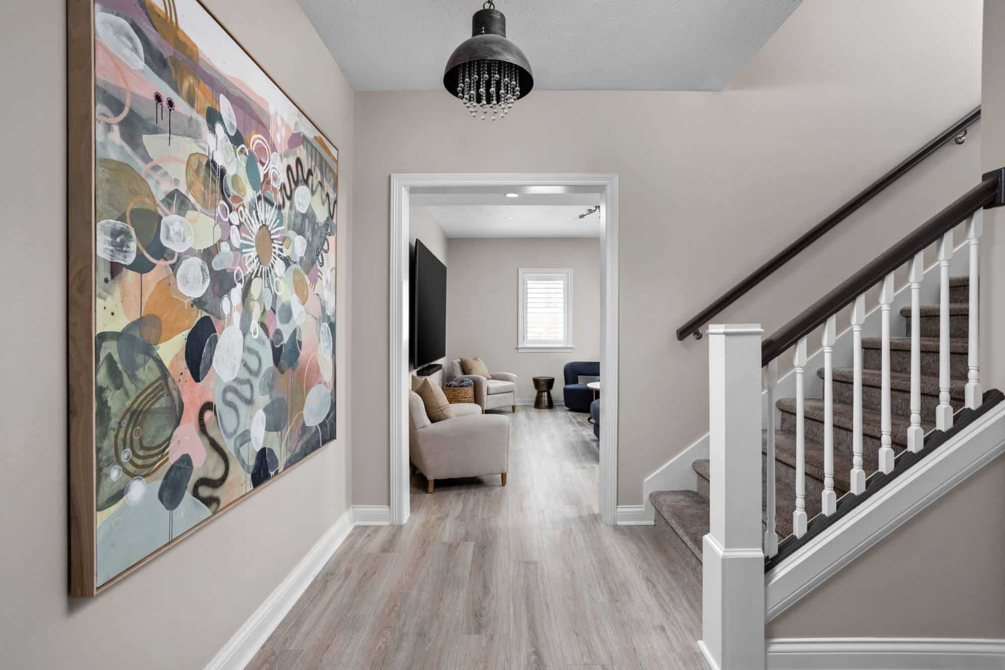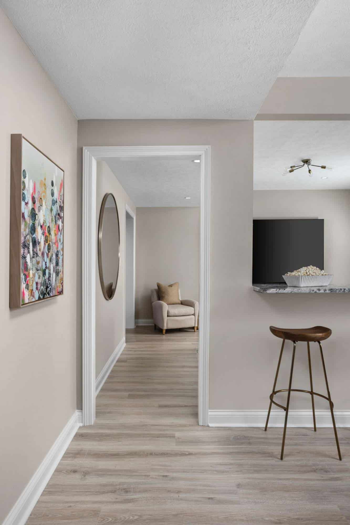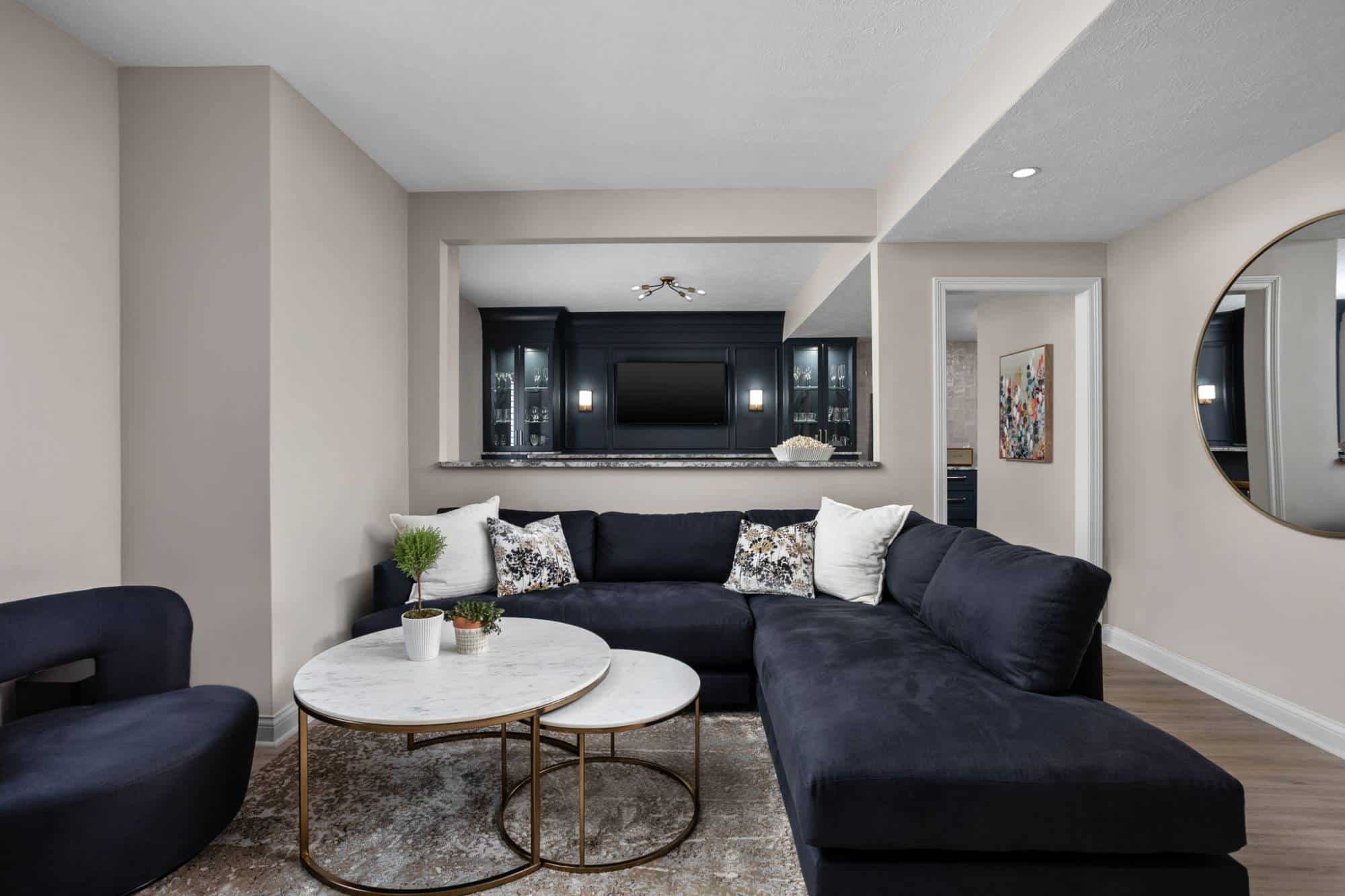 The two rooms were opened up to create a seamless lounge and bar area, but they still maintain their own distinct vibe. By keeping the original framing, we were able to carve out a large walkway and a framed opening, making the space feel connected without losing definition. Now, thanks to some smart sightlines, you can catch the giant TV from almost anywhere in the room. And with a second TV over the back bar, you’ll never miss a second of the action—no more fighting for the best seat in the house!