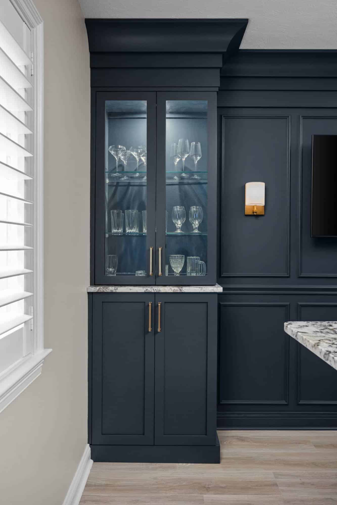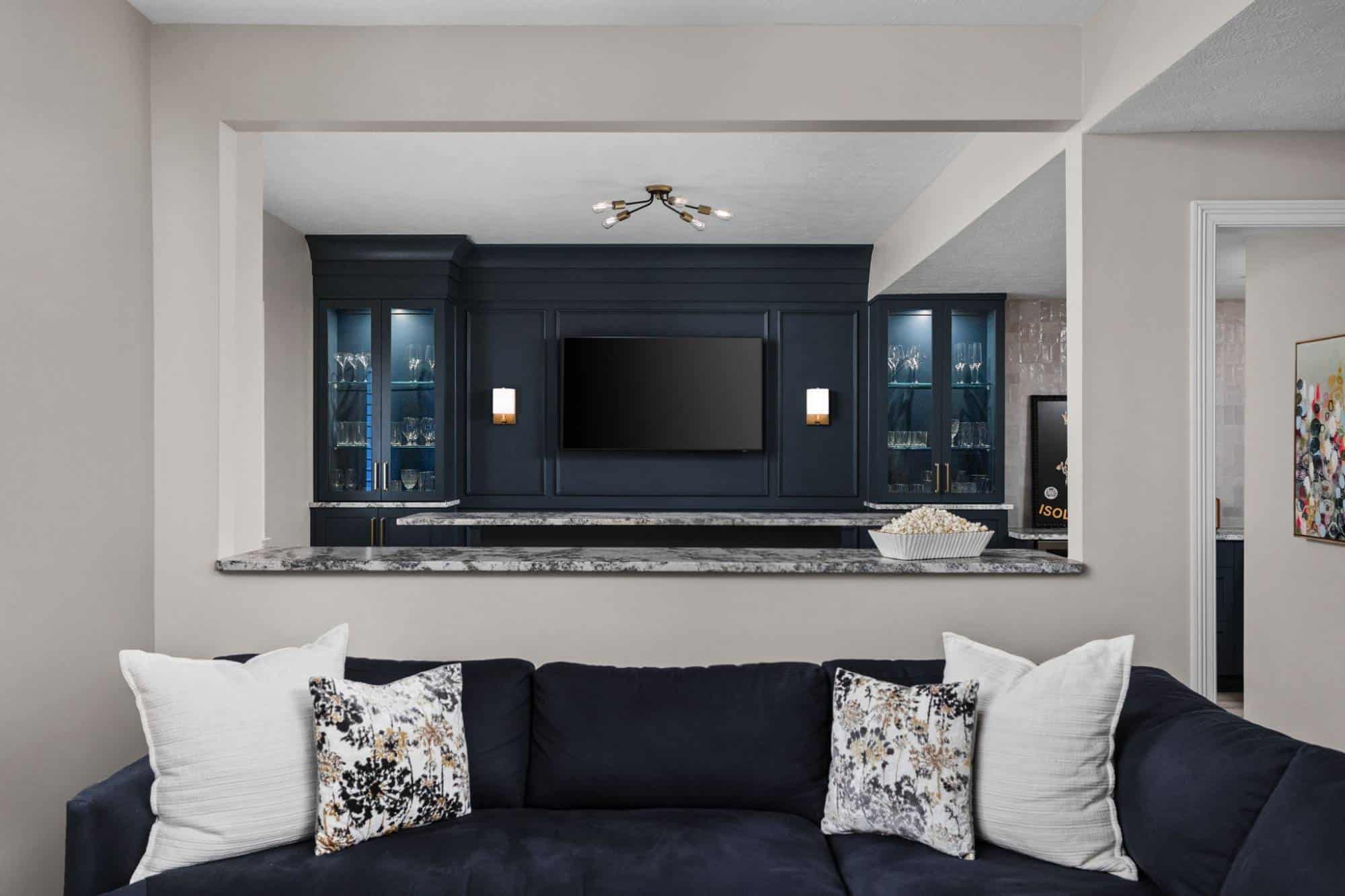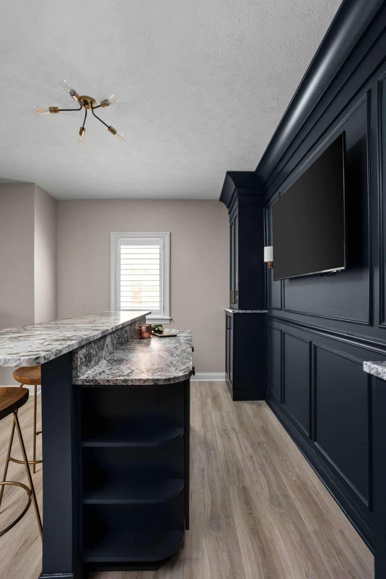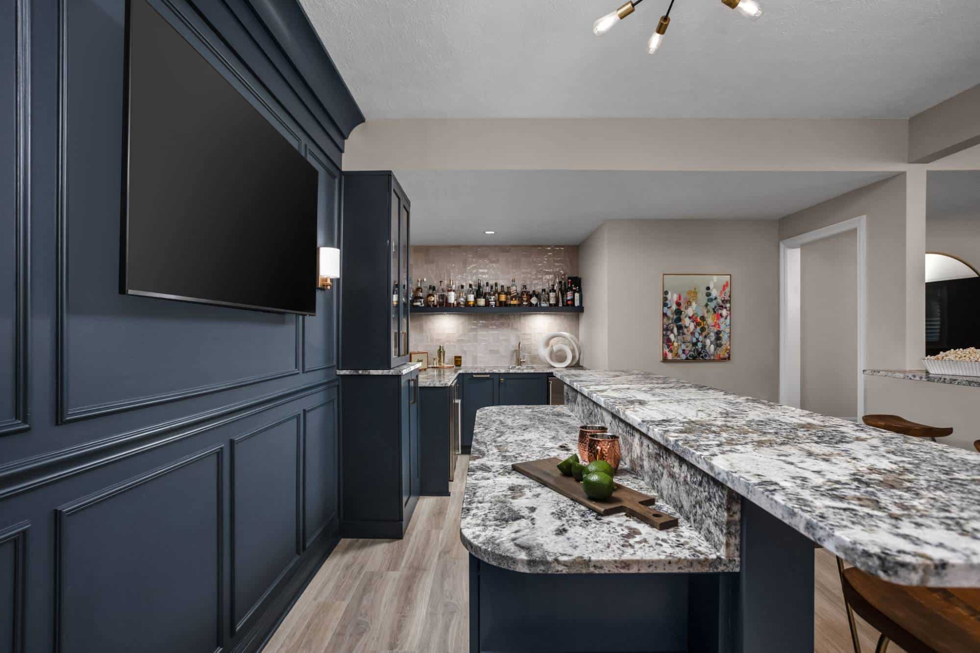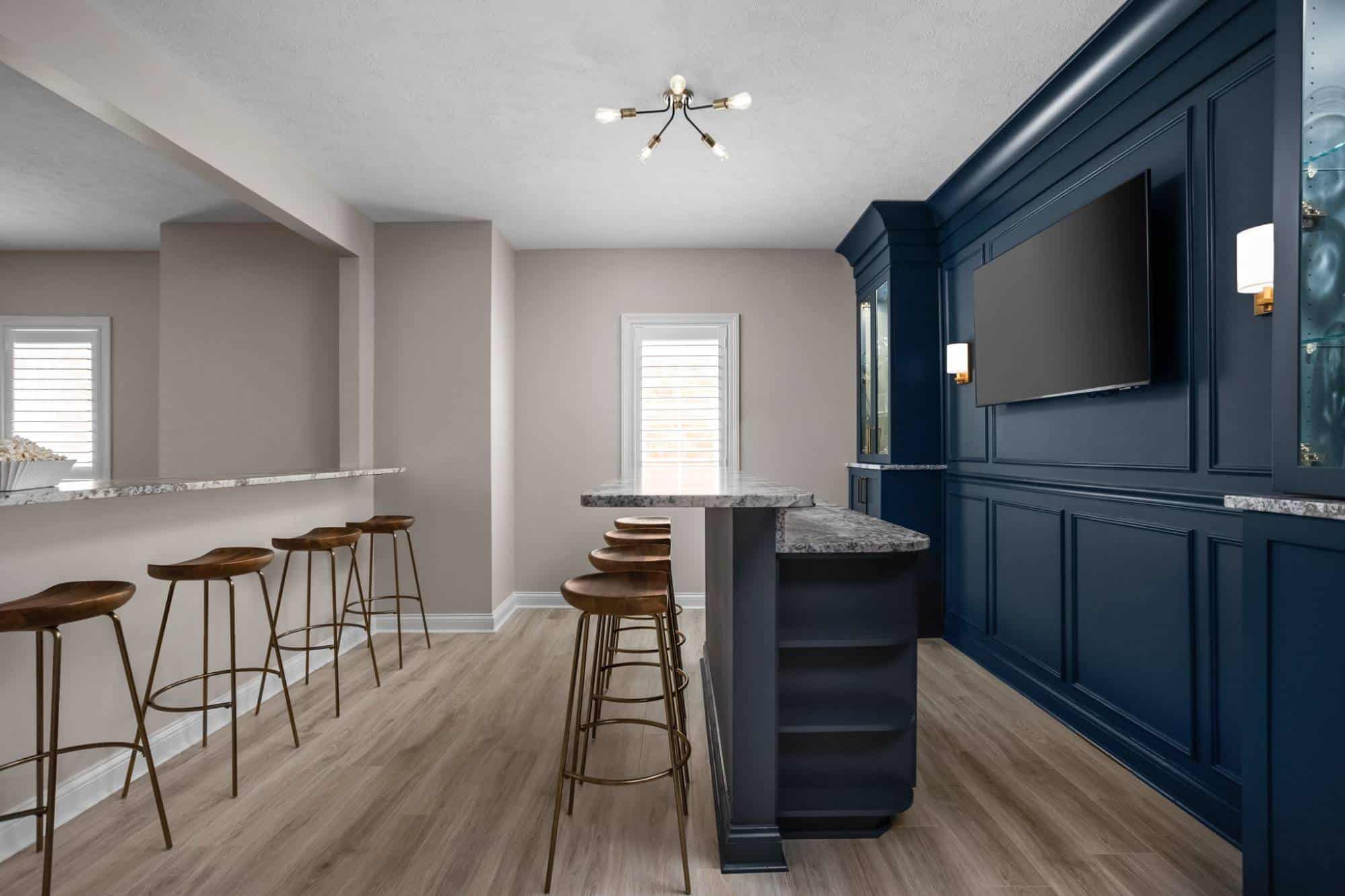 Of course, what’s an entertainment space without a bar? The freestanding bar is the perfect spot for the homeowner to channel their inner mixologist, complete with hidden storage inside the bar and two tall cabinets behind it for all the essentials. We even tricked the eye by using a drywall and molding treatment painted to match the Sea Serpent Blue cabinetry—giving the illusion of a fully built-in bar without the hefty price tag. The finishing touch? The cabinet crown molding extends across the wall, making everything feel even more polished.