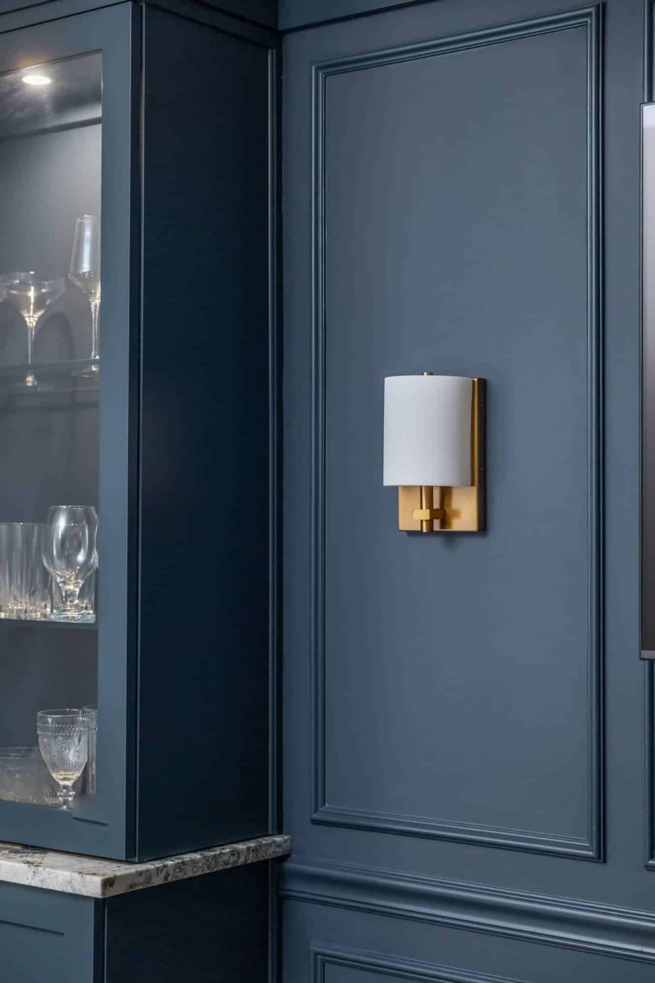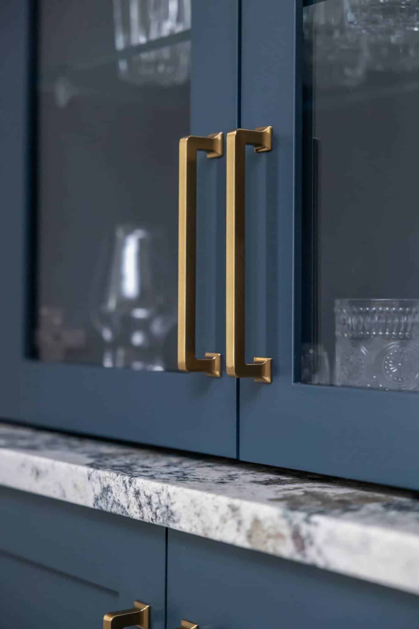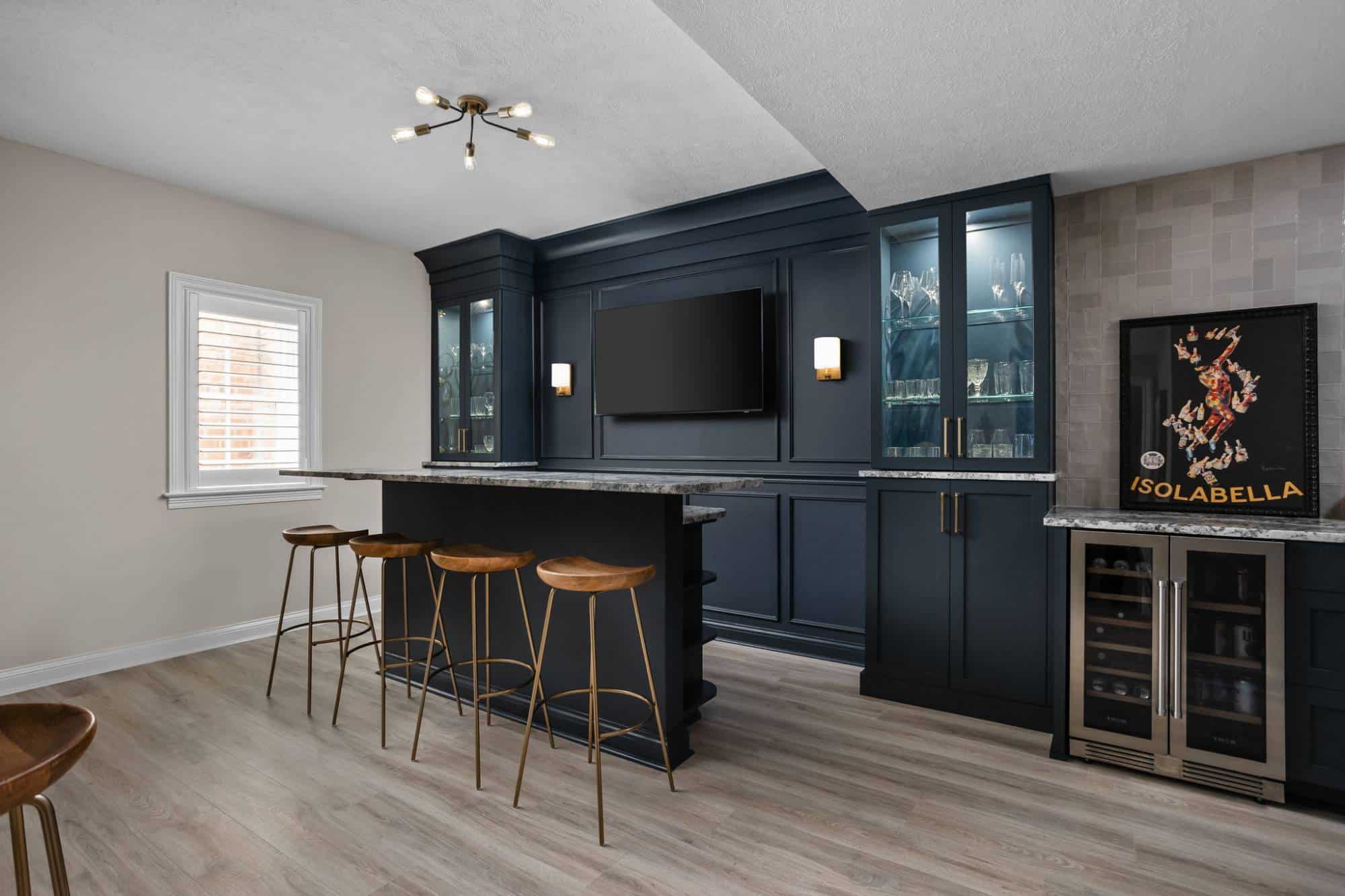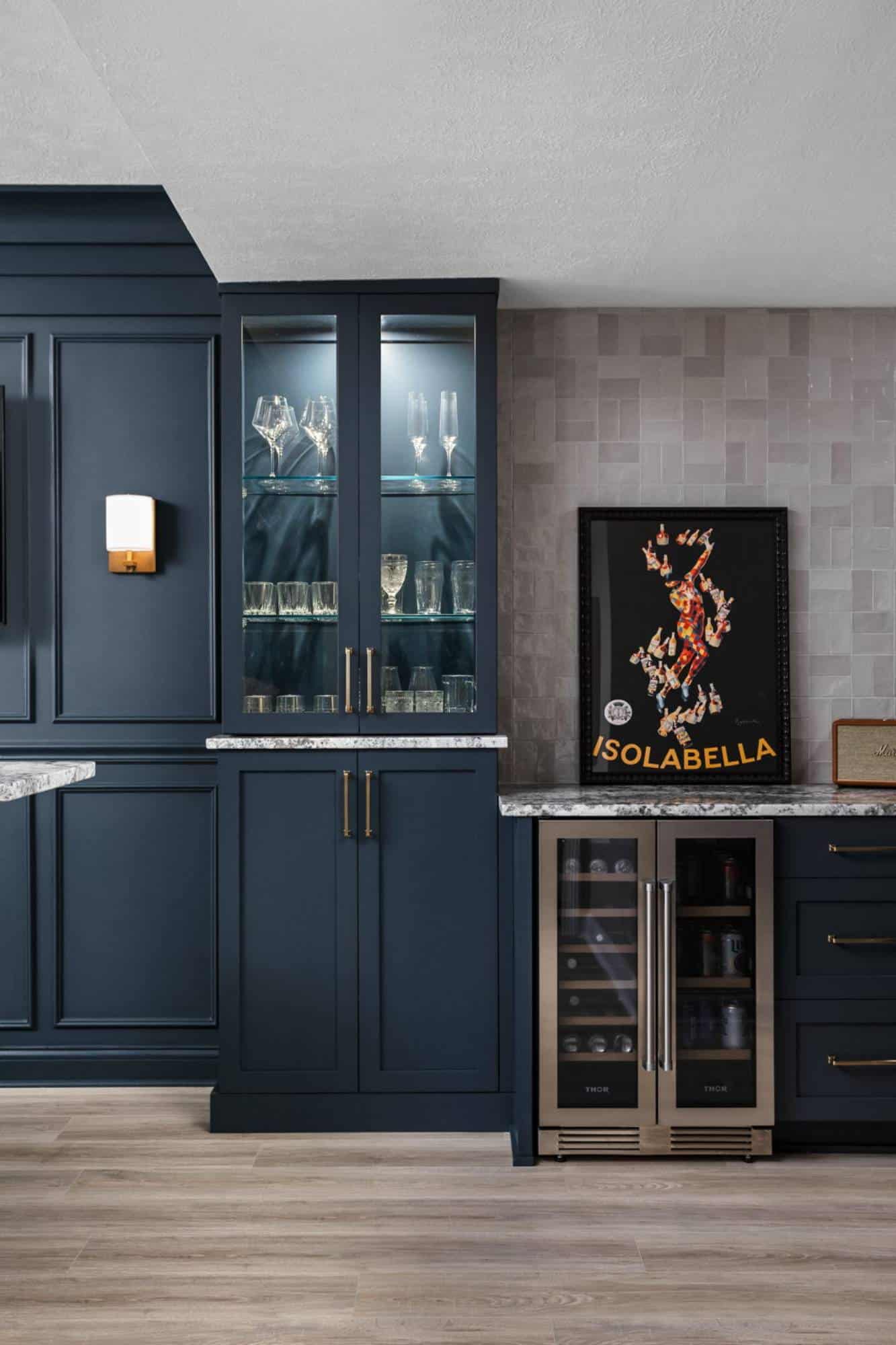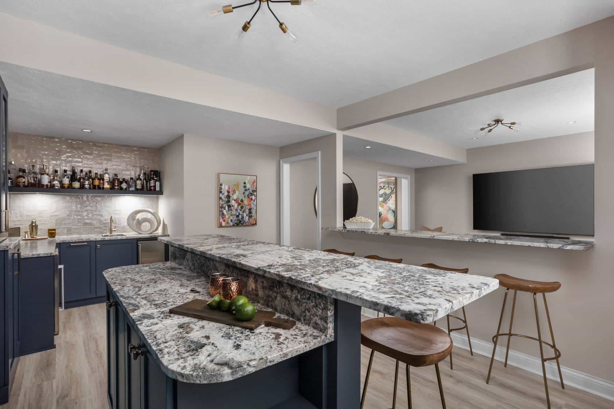 Of course, what’s an entertainment space without a bar? The freestanding bar is the perfect spot for the homeowner to channel their inner mixologist, complete with hidden storage inside the bar and two tall cabinets behind it for all the essentials. We even tricked the eye by using a drywall and molding treatment painted to match the Sea Serpent Blue cabinetry—giving the illusion of a fully built-in bar without the hefty price tag. The finishing touch? The cabinet crown molding extends across the wall, making everything feel even more polished.