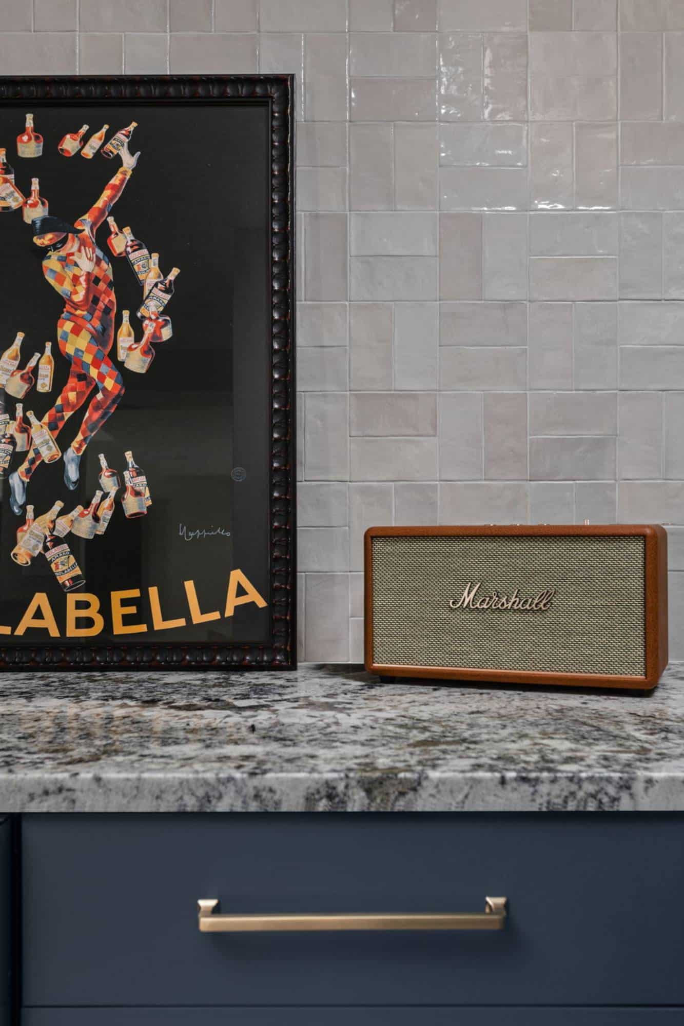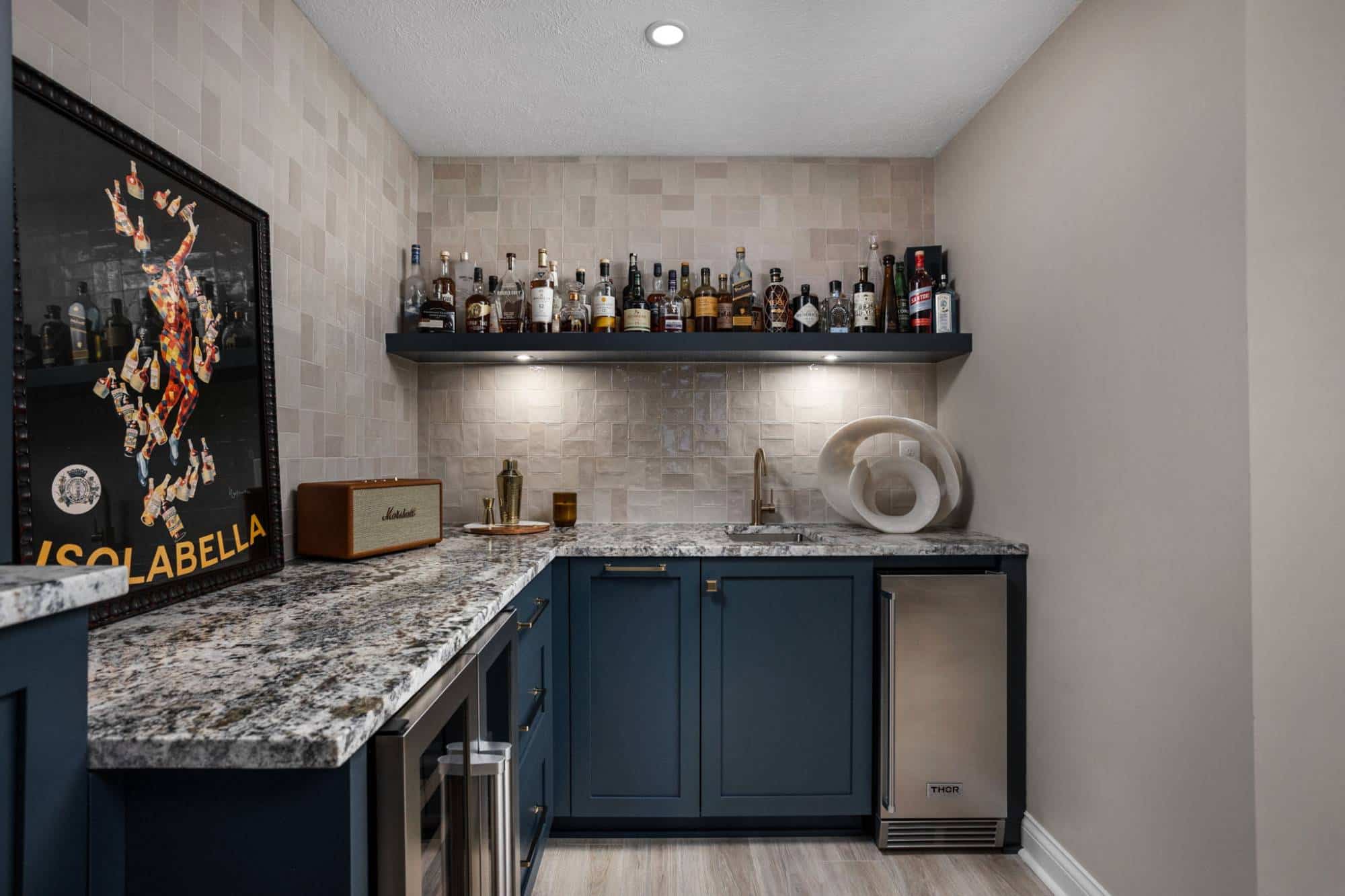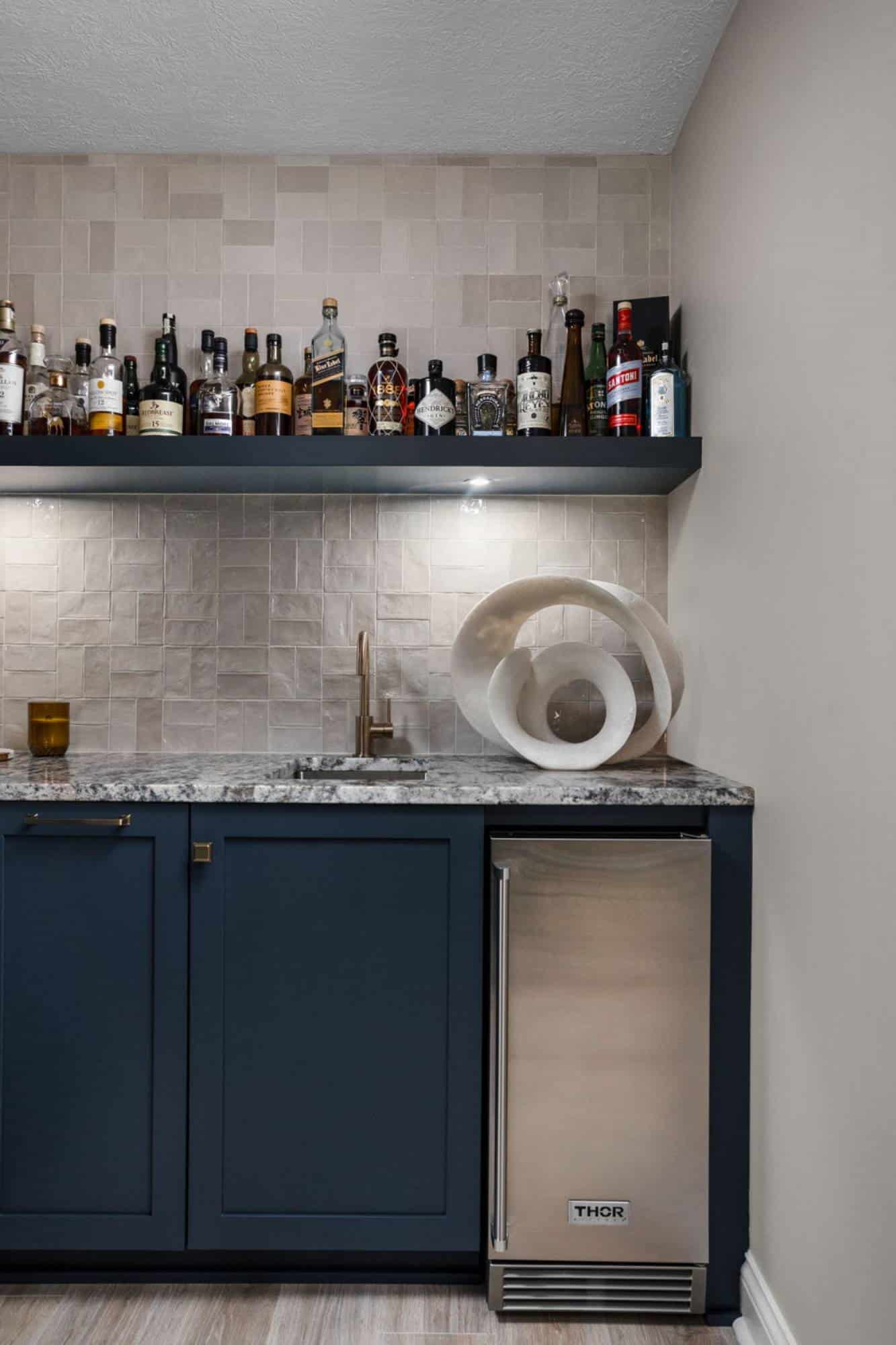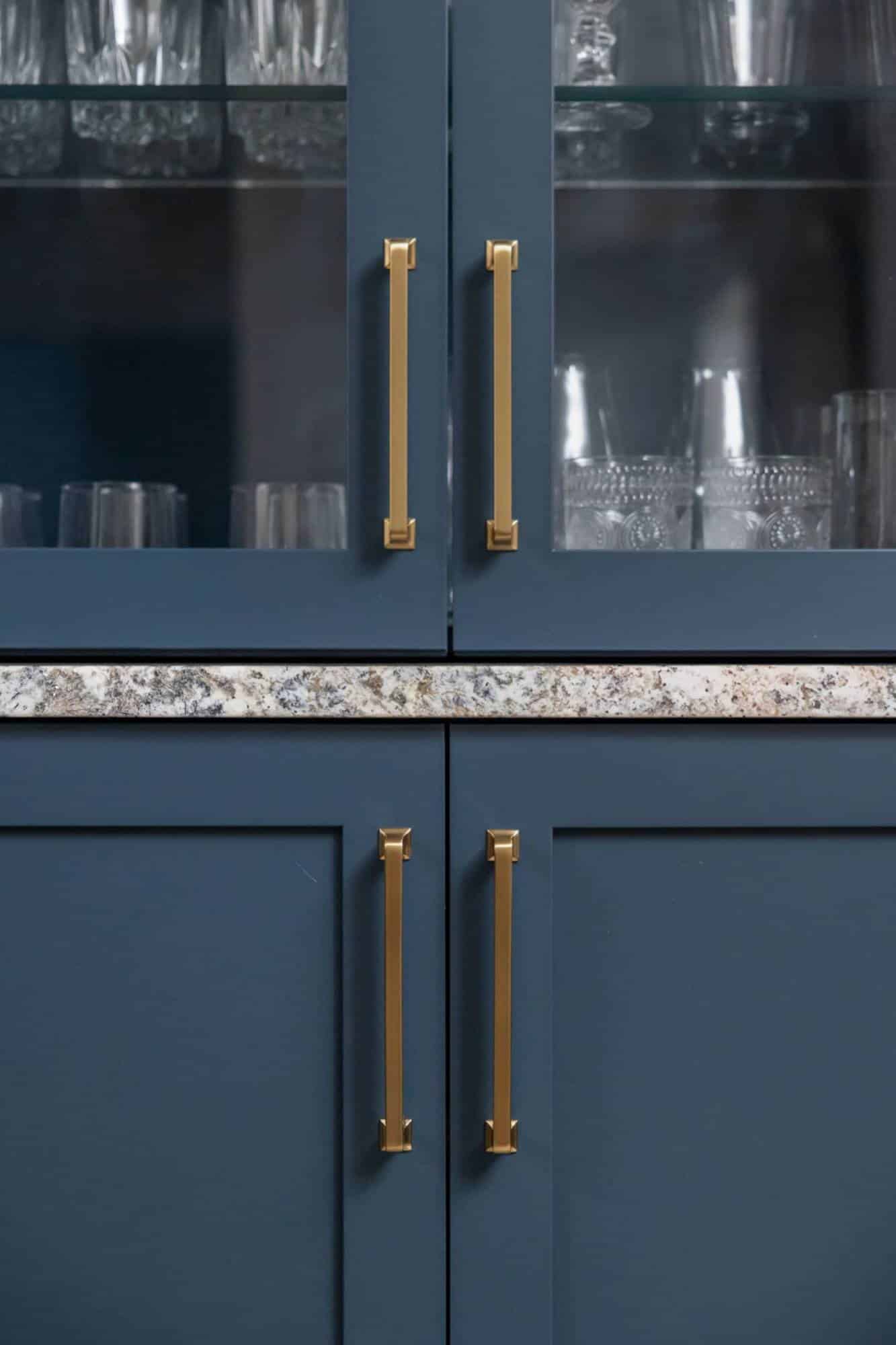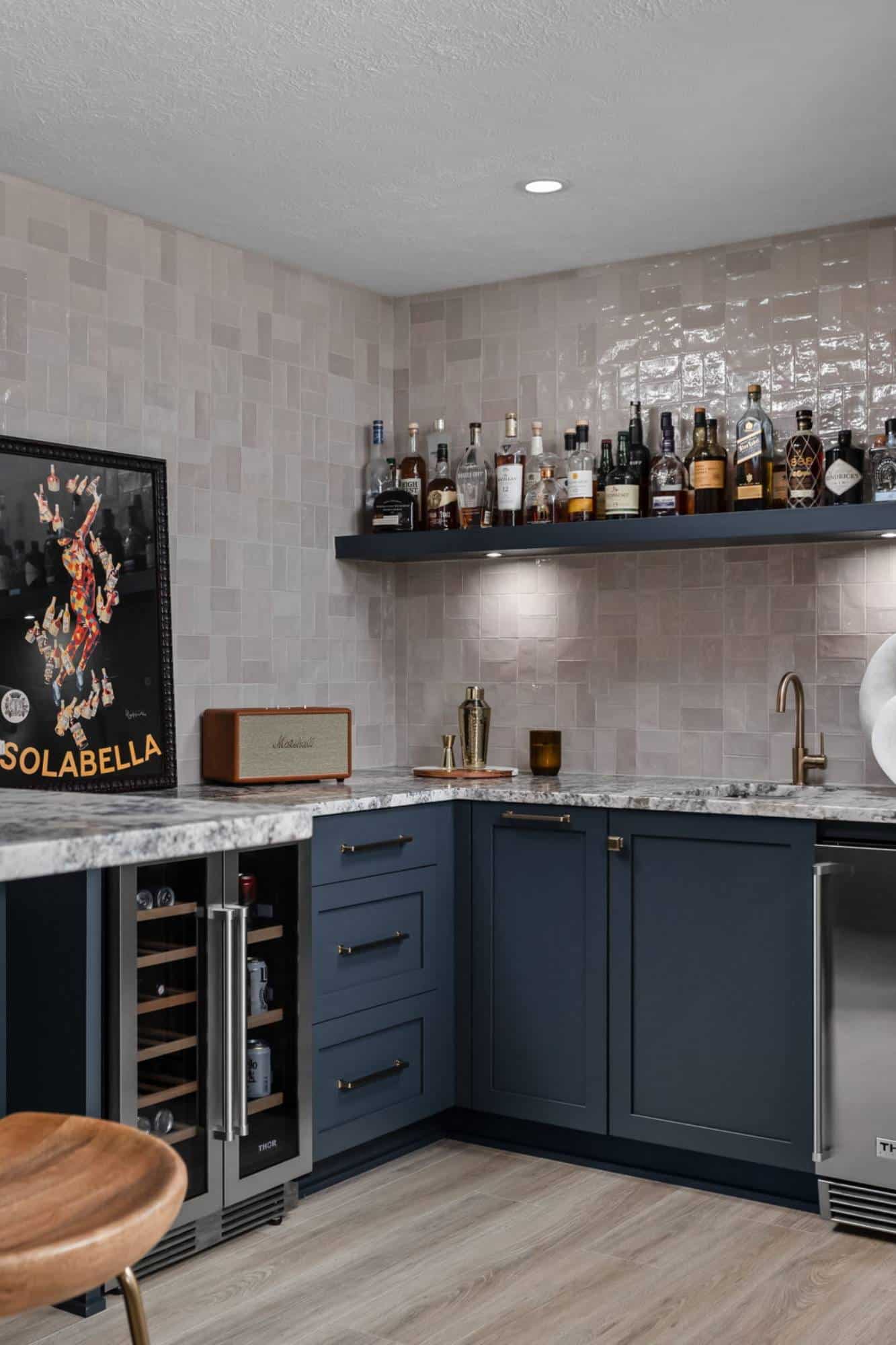 Of course, what’s an entertainment space without a bar? The freestanding bar is the perfect spot for the homeowner to channel their inner mixologist, complete with hidden storage inside the bar and two tall cabinets behind it for all the essentials. We even tricked the eye by using a drywall and molding treatment painted to match the Sea Serpent Blue cabinetry—giving the illusion of a fully built-in bar without the hefty price tag. The finishing touch? The cabinet crown molding extends across the wall, making everything feel even more polished.