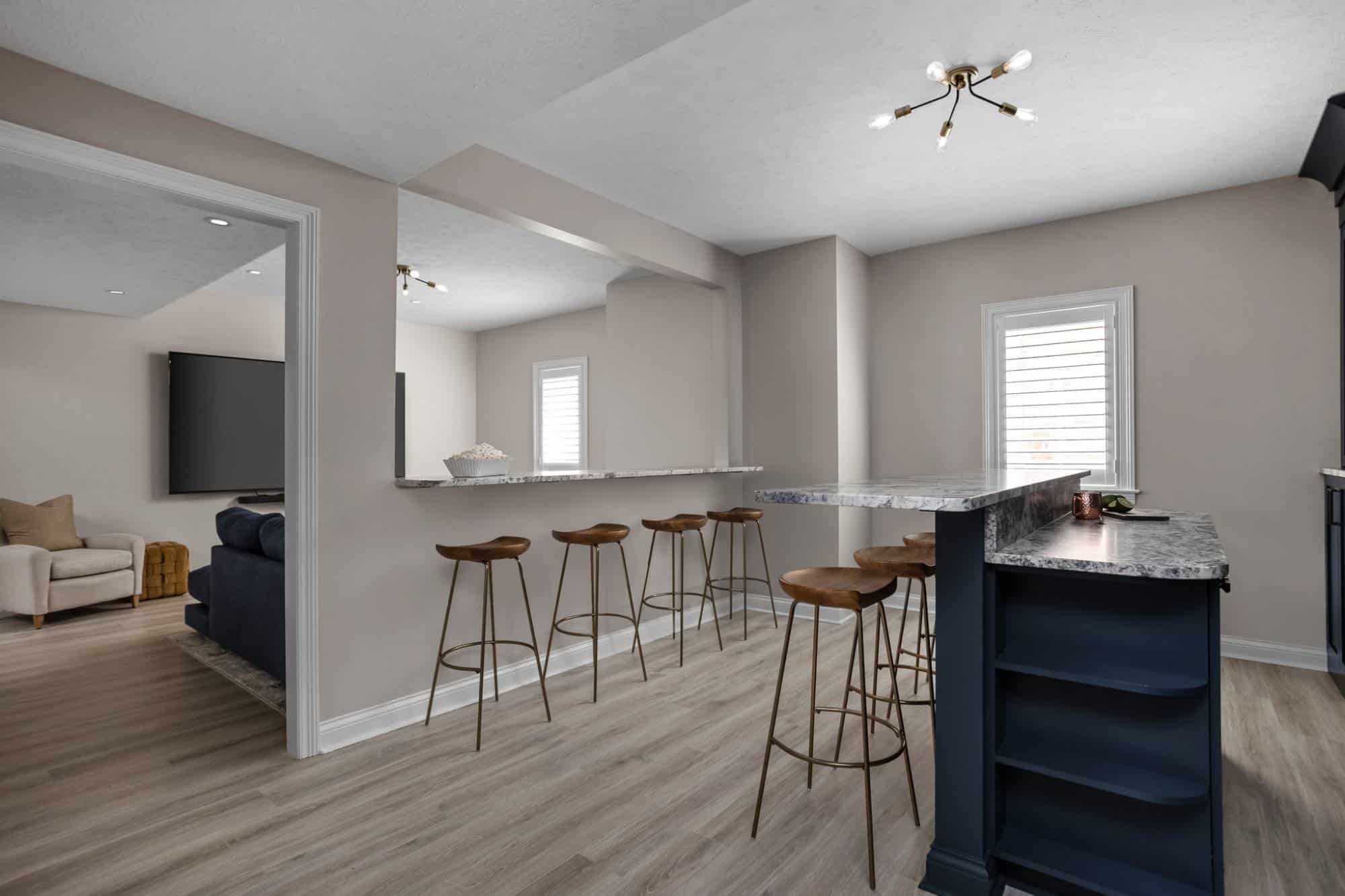 What was once a guest room and sitting area is now the ultimate entertainment hub, designed for everything from game day gatherings to casual cocktail nights. The homeowners wanted a well-flowing space that felt both stylish and functional, so Corinthian Fine Homes worked its magic—knocking down walls, rethinking storage, and adding just the right amount of wow factor.