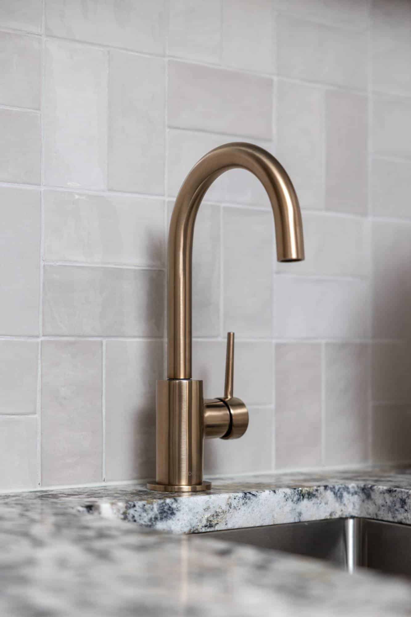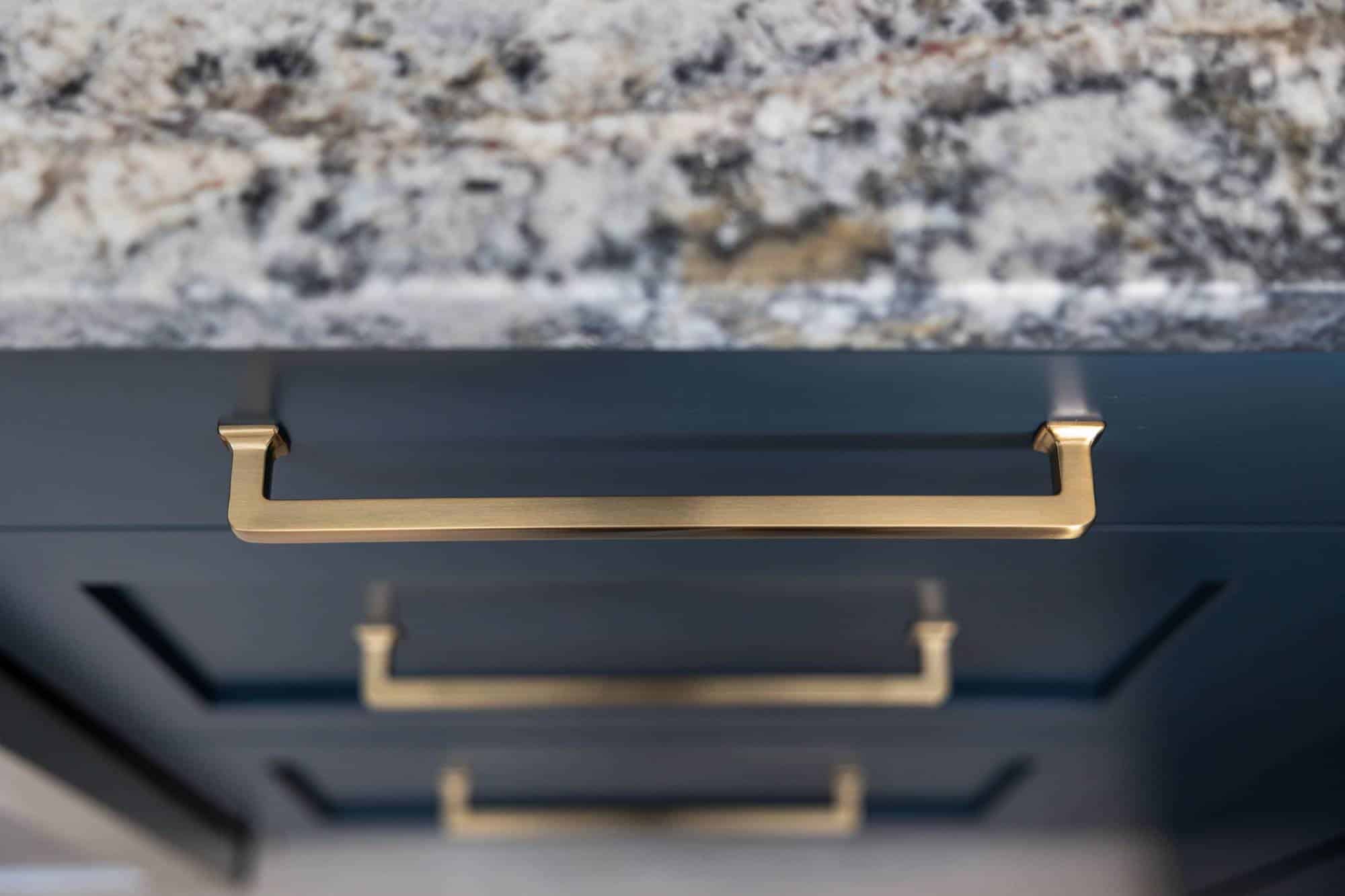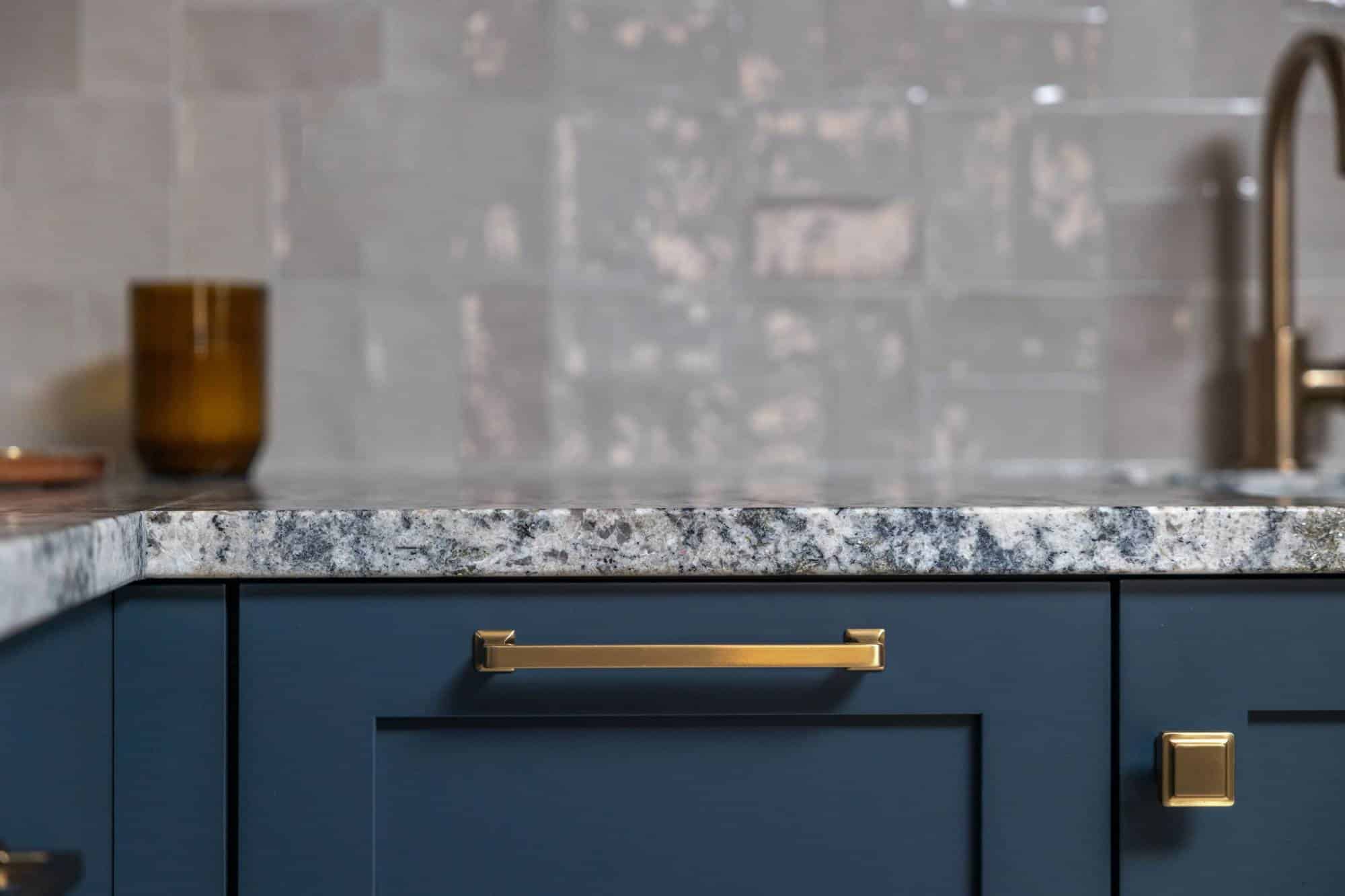 For seating, the homeowners went all in—barstools at both the freestanding bar and window counter, plus a spacious sectional and lounge chairs to ensure no guest is left standing. The Azul Nuevo leathered granite countertops inspired the room’s entire color scheme, pulling together deep blue cabinets, warm neutrals in the flooring and tile, and luxe gold fixtures for just the right touch of sophisticated comfort.