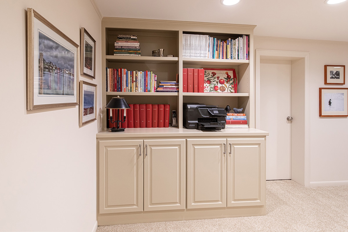 And finally, we built some cabinets and repurposed cabinetry from the kitchen, in the basement to create individually purposed areas for tasks as well as an entertainment center. It no longer is a basement that was dreaded to go to but is now a light updated and functional space for them to enjoy.