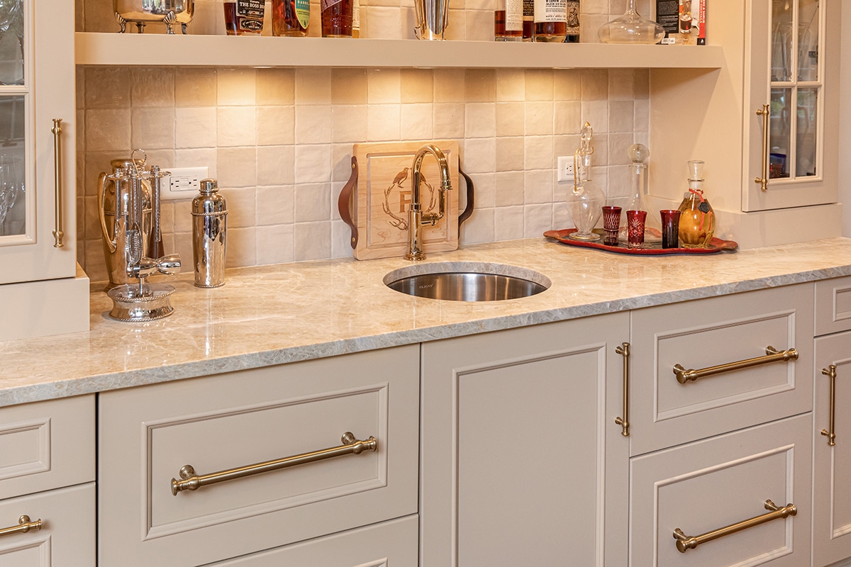 This first floor transformation is stunning. From dark and outdated to light, bright and modern, each space is a delight with significantly improved functional use of space. The new hallway entrance to the kitchen/eating area from the back door and back stairs is engaging with not only a drop zone for keys and purses, but also now boasts a custom-built cabinet for showcasing their cookbooks. New sliding doors open into the new solarium brimming with prized orchids in an environment conducive to thriving. The view from the front door into the family room welcomes everyone into their main living areas. Walking through the large new doorway to the family room, a wet bar was designed to transition entertaining between spaces. With plenty of storage, counter space, and 2 paneled refrigerator drawers, the hosts can entertain in style.
