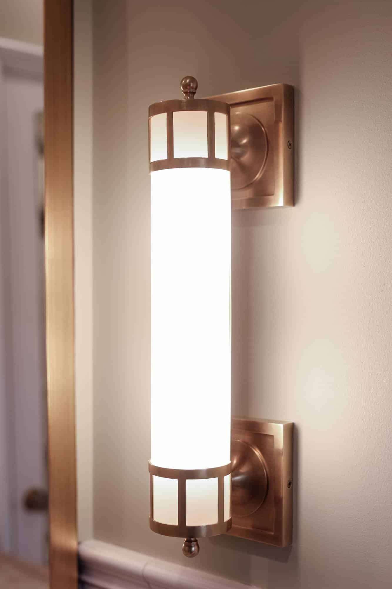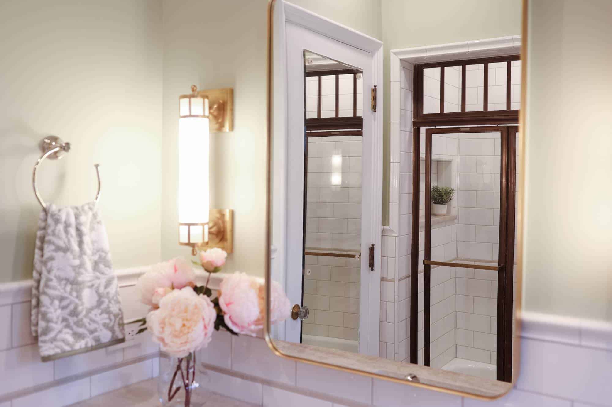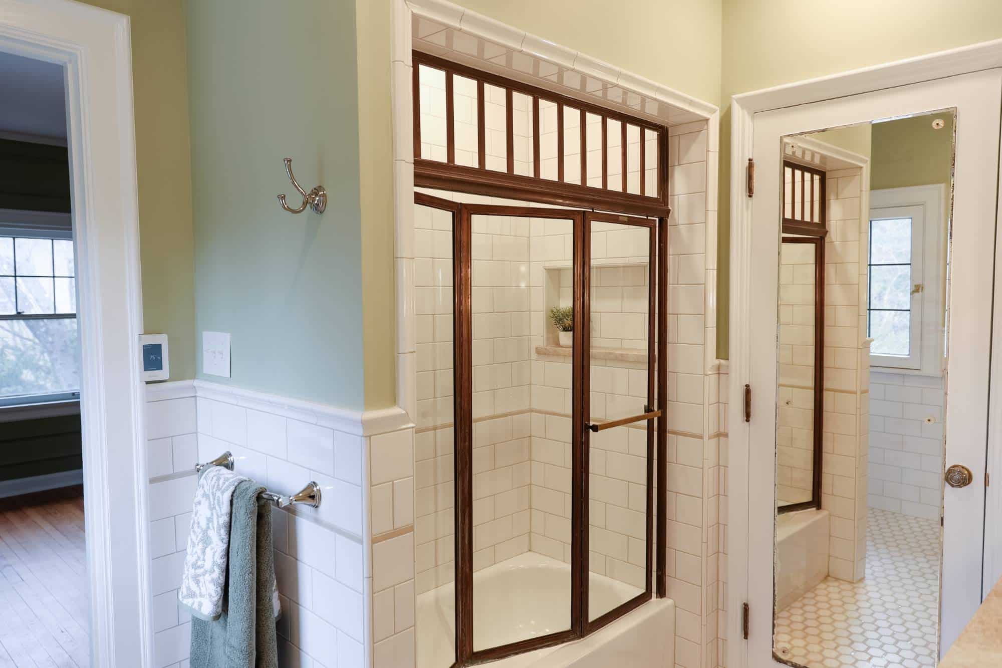 Behind the scenes, the guest suite is now fully updated for modern living—but you’d never know it at first glance. The homeowners wanted a space that felt authentic to the era, and that’s exactly what they received. From the preserved closet door and original mirror to the light fixture design that echoes the geometric detail of the shower door, this bathroom is a love letter to the past, written in the language of today’s luxury.