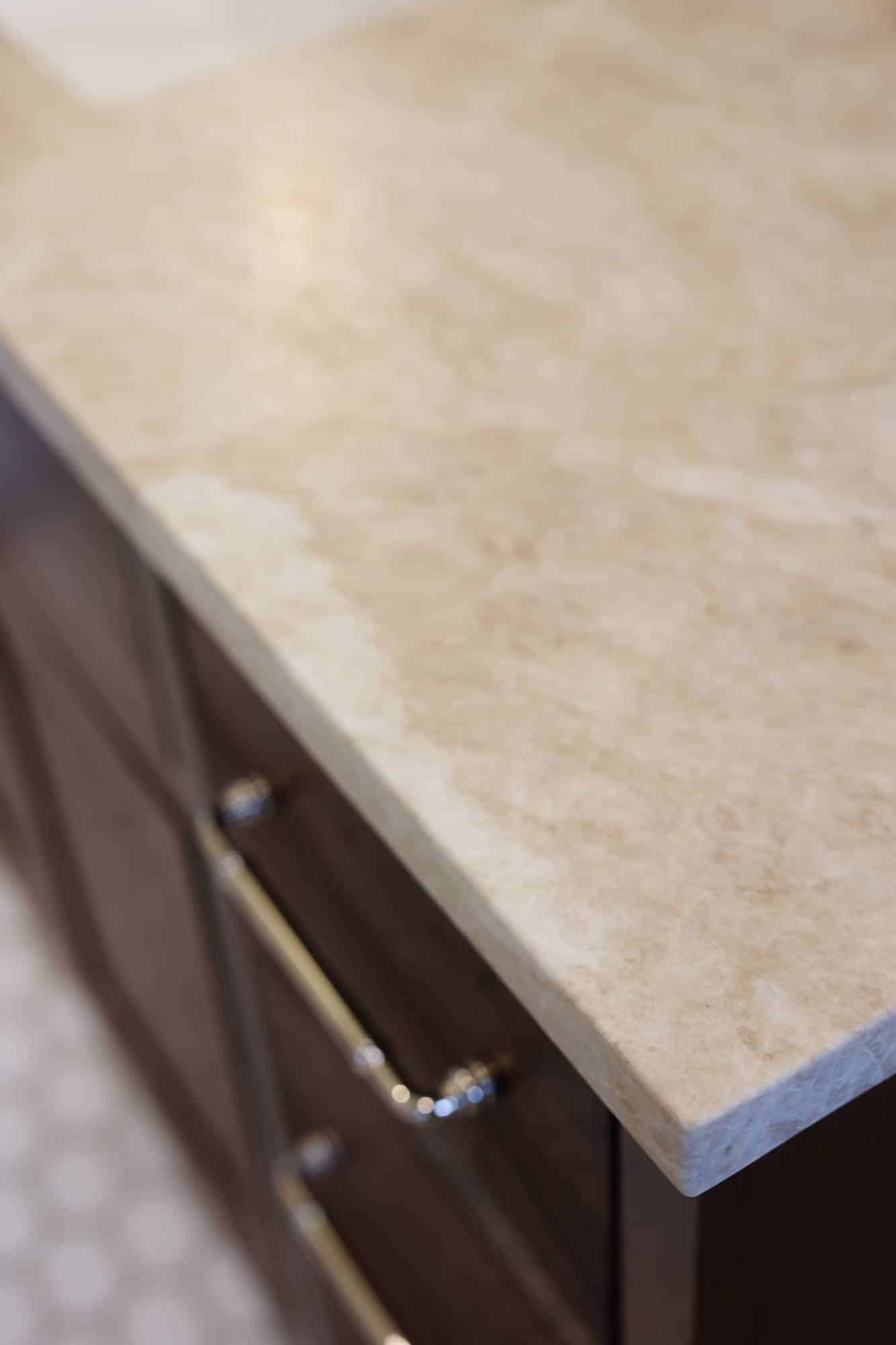 A Taj Mahal quartzite countertop, known for its subtle veining and creamy finish, adds polish while maintaining the room’s quiet sophistication.