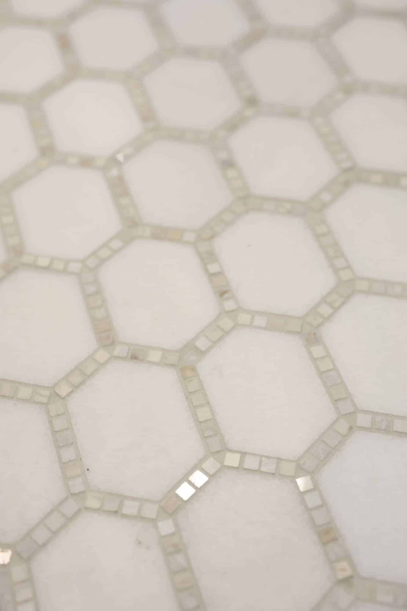 Marble mosaic flooring plays with pattern in a gentle way, referencing vintage styles without overwhelming the eye.