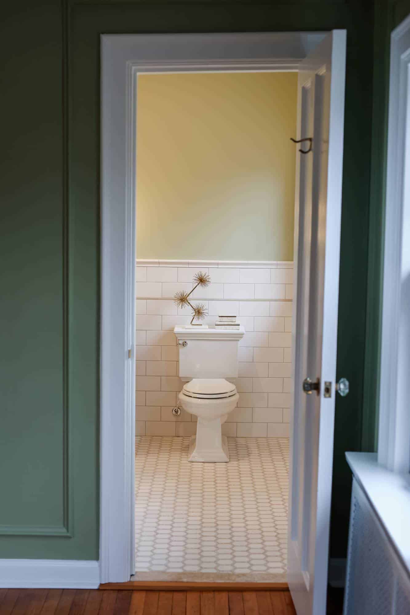 Historic Wainscoting, Updated Palette: Traditional white ceramic wainscoting wraps the lower half of the walls with a warm beige accent liner—true to 1920s style—and is paired with sage green paint to bring in a soft, refreshing contrast. This combination offers both historical reference and a current sense of calm and hospitality.